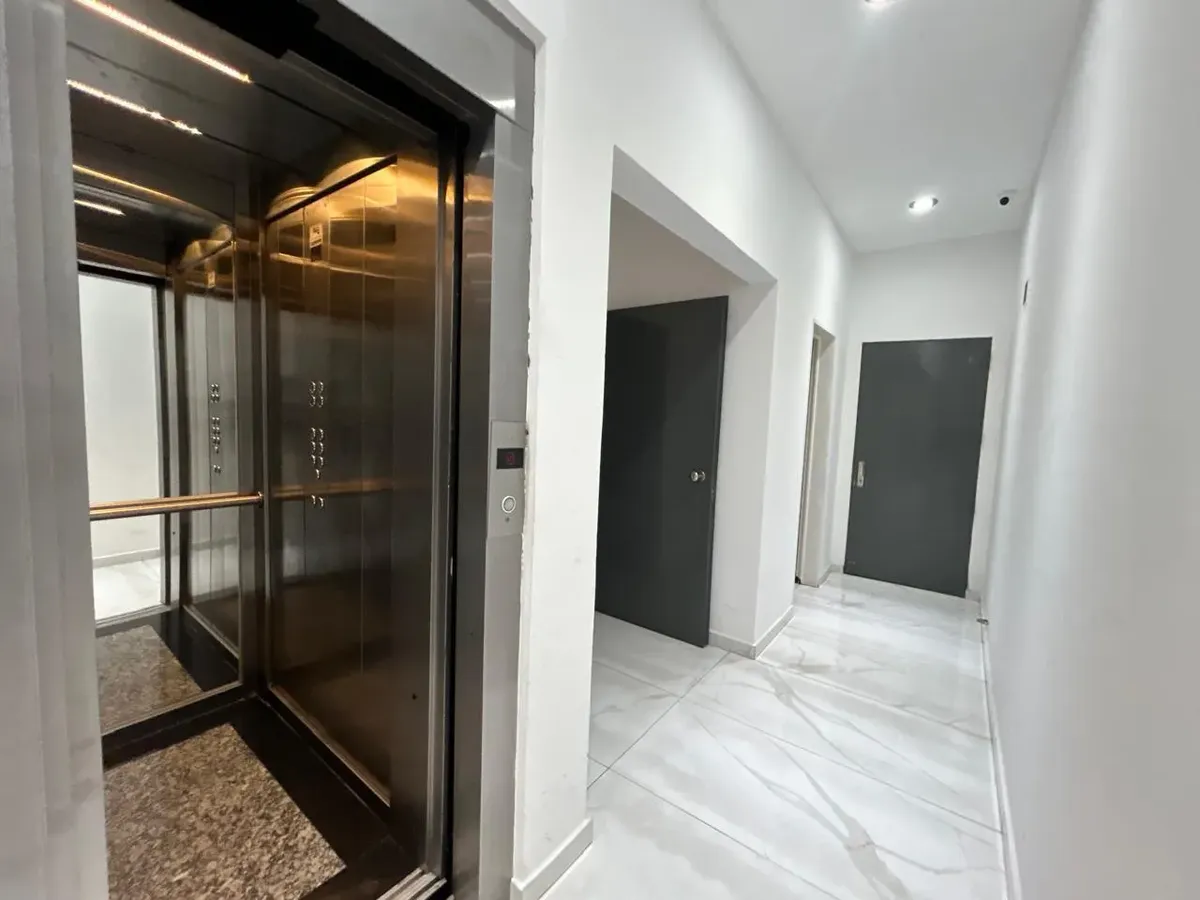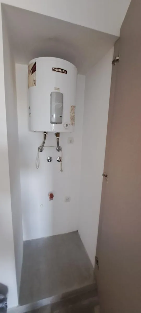 Studio apartment with a balcony on the 5th floor, courtyard-facing. The main room is divisible and includes a living-dining area with an integrated kitchen, with a cooker, cabinet below the counter and overhead cupboards, plus a full bathroom. The unit has Whirlpool Inverter air conditioning for hot and cold use, and the building has an elevator and a shared rooftop terrace with grills. Building fees, utilities and internet are not stated. Maximum occupancy: 2 people; small pets are accepted.