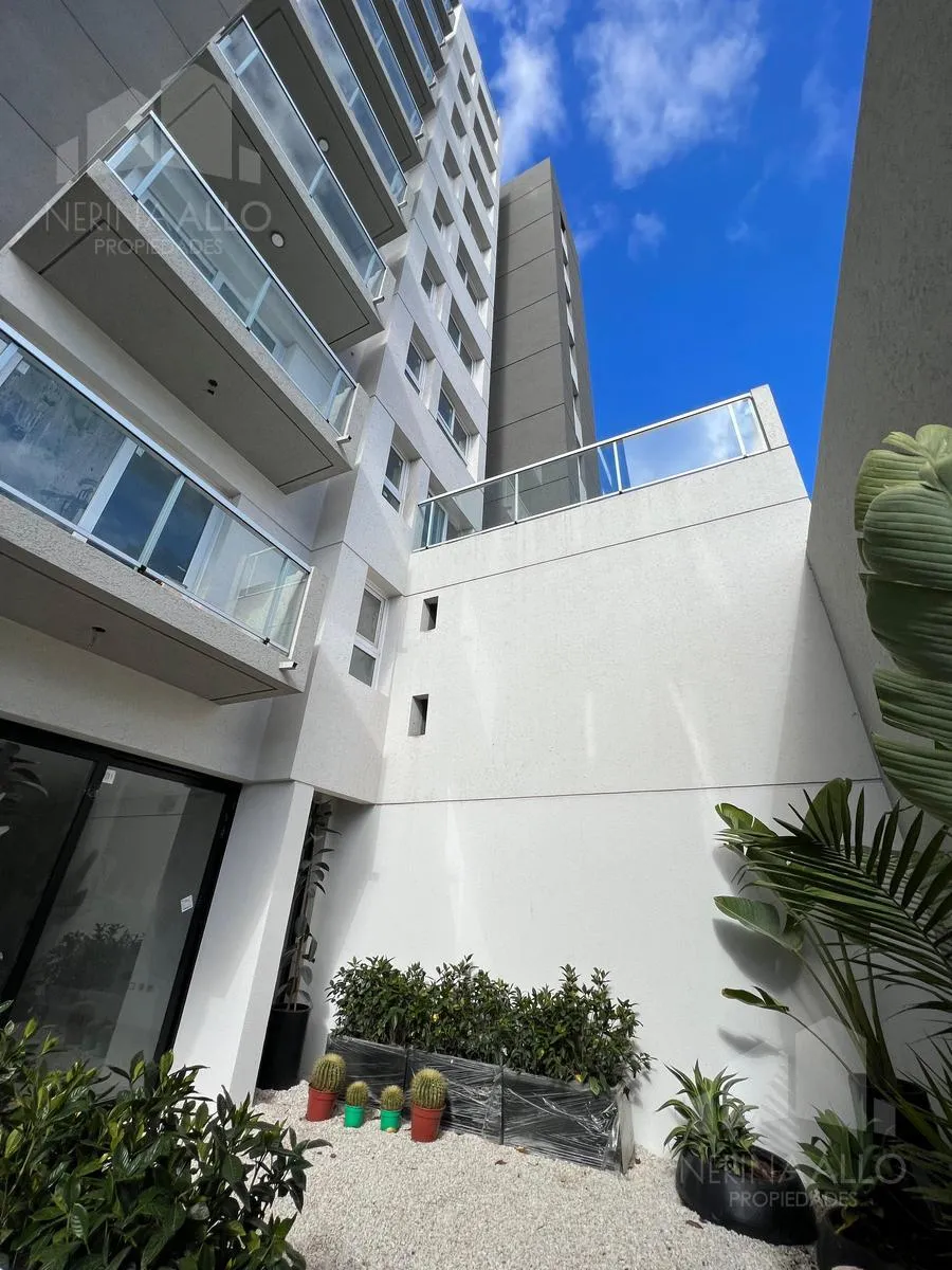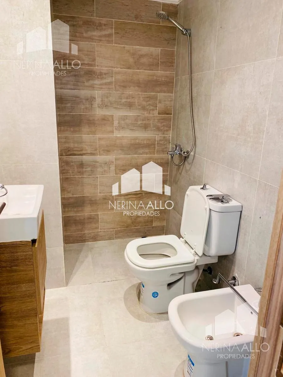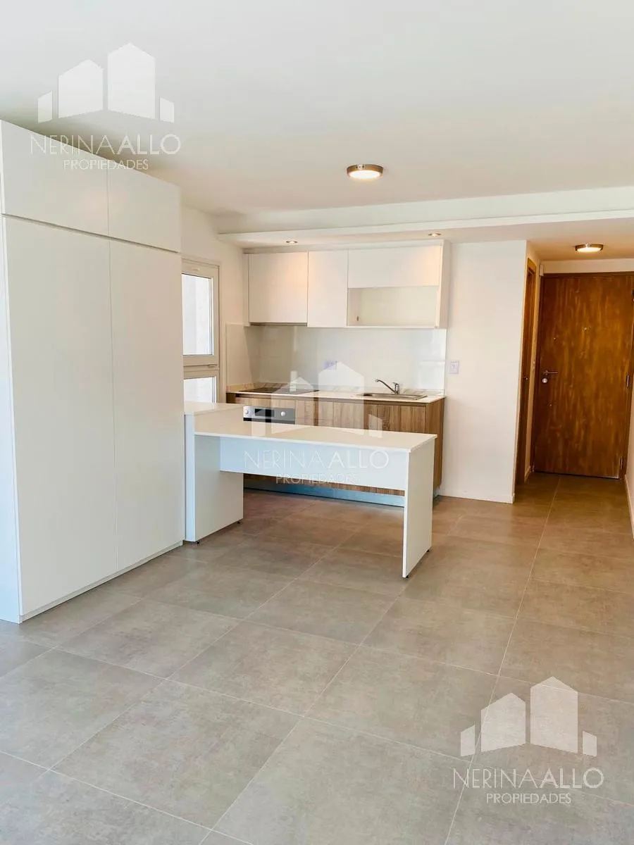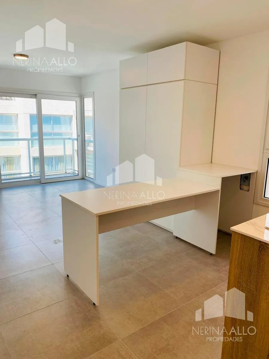 Studio apartment in a building in Ituzaingó Centro. Includes a living-dining area with an integrated kitchen, a breakfast bar, a full bathroom, and a balcony. Includes a closet and blackout curtains.