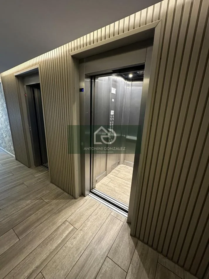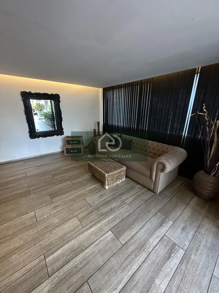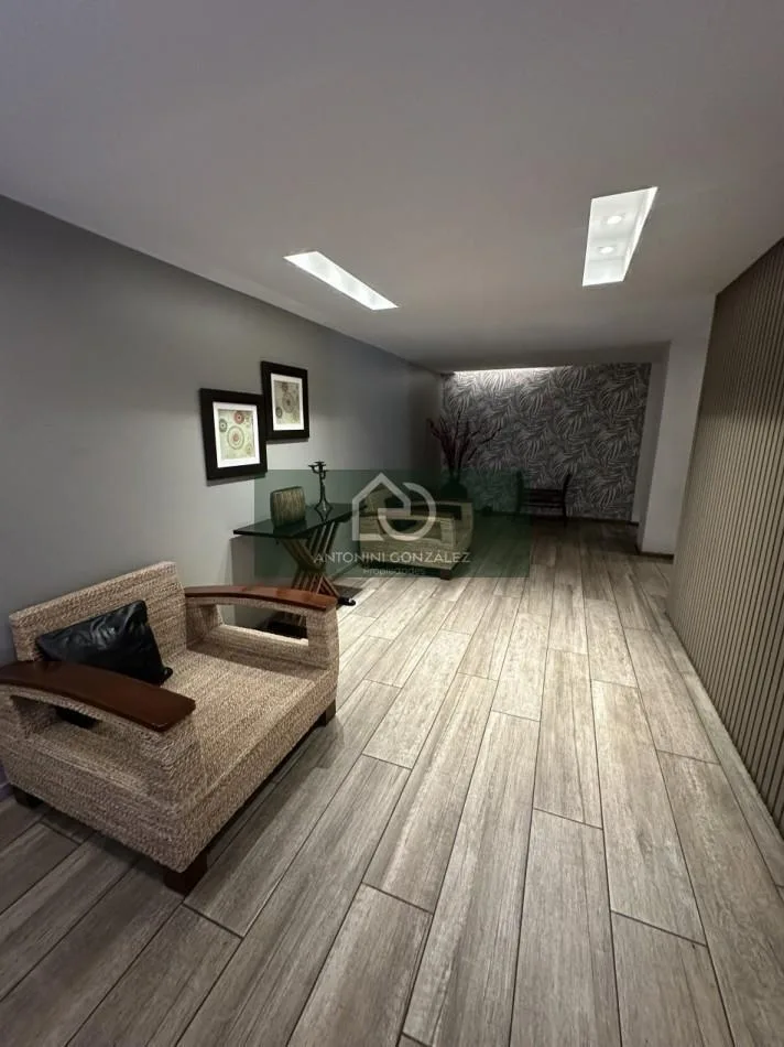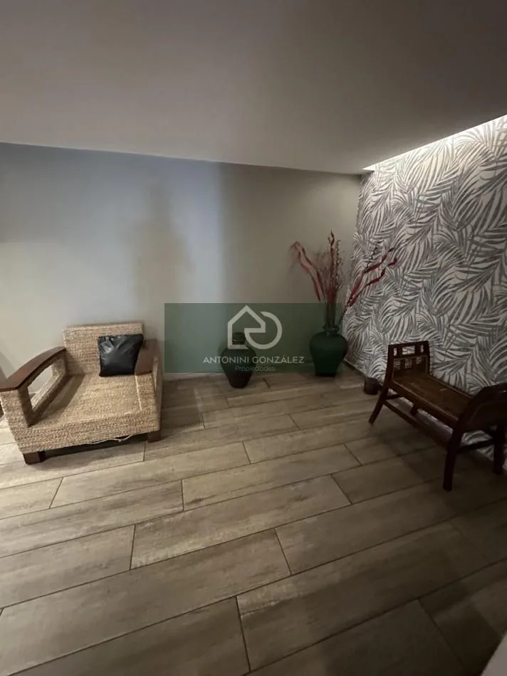 Studio apartment for rent with a private patio in Ituzaingó Norte. Total area is 70 m², including 38 m² covered and 32 m² uncovered. The unit has an integrated kitchen with complete cabinetry, a full bathroom, and installed air-conditioning. The building includes a communal room (SUM), laundry room, and pool.