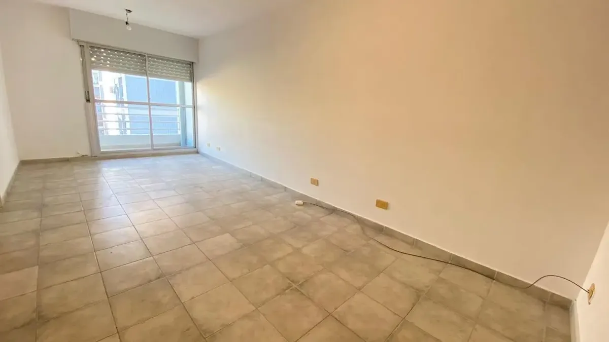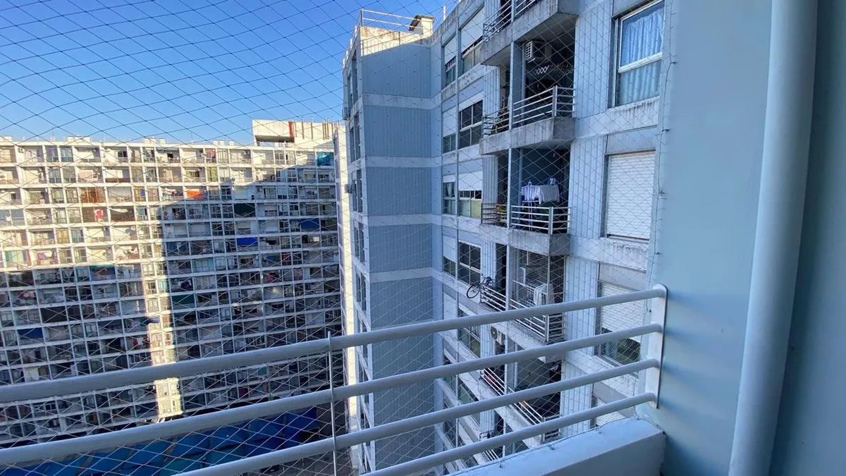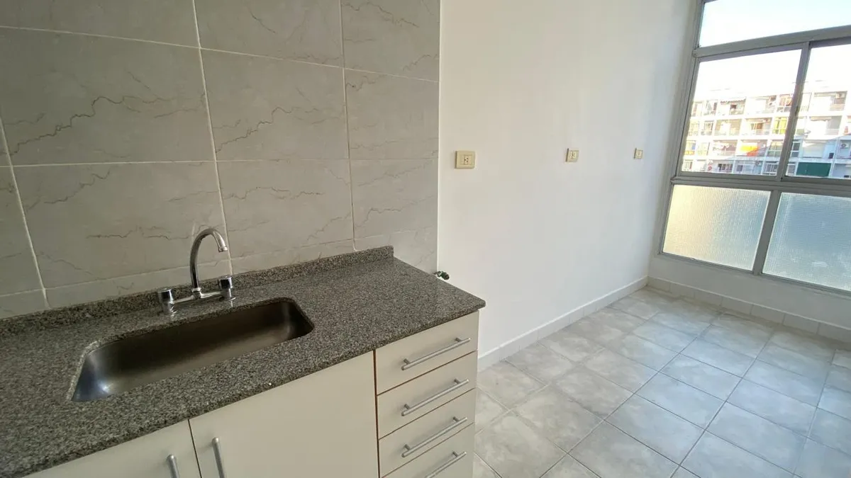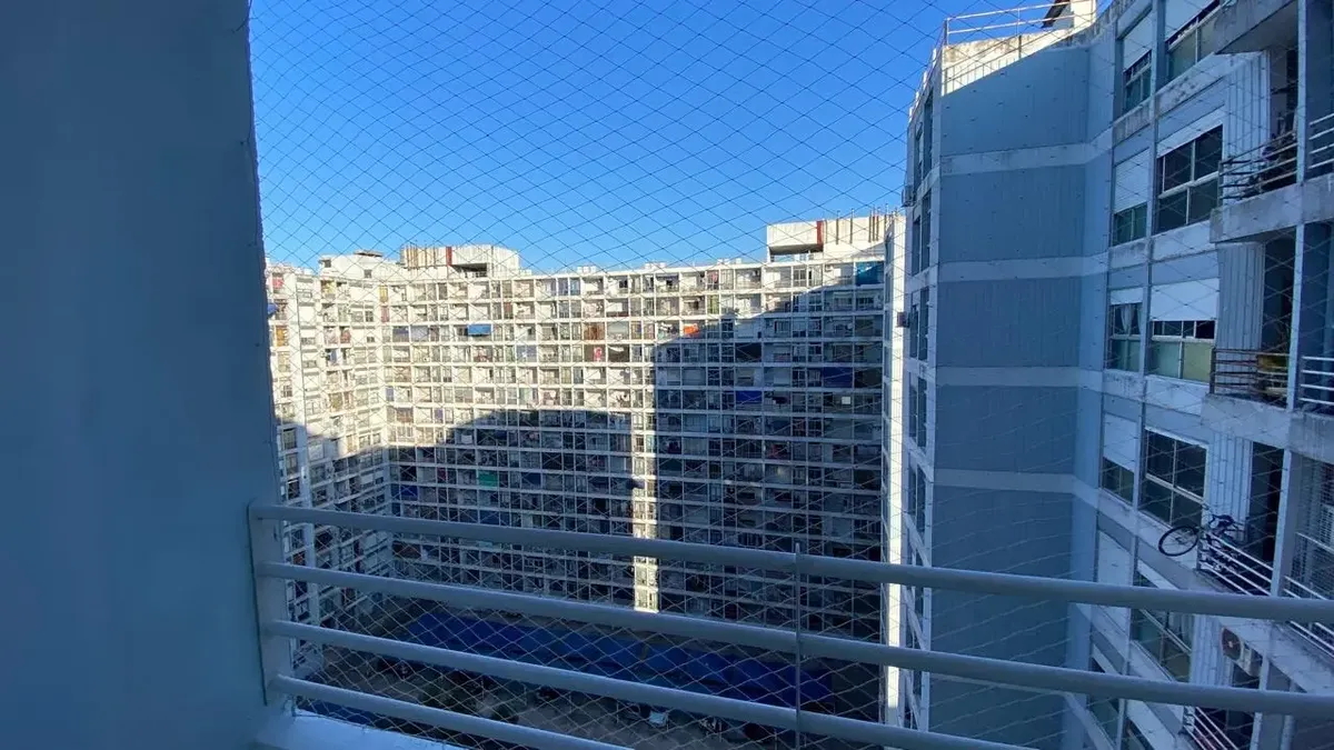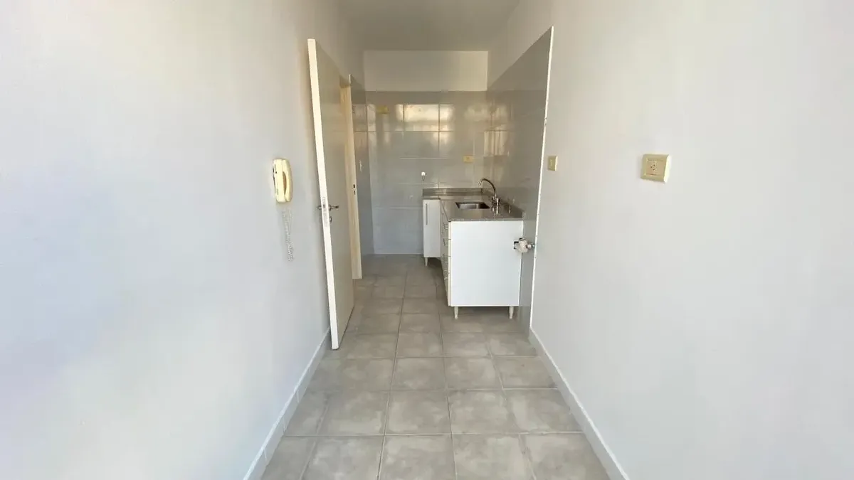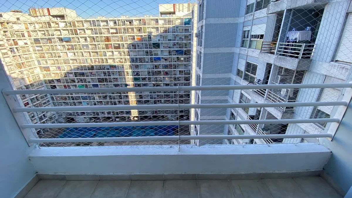 Studio apartment for rent on the 13th floor, courtyard-facing (contrafrente). Separate kitchen with storage space, full bathroom, and a balcony at the front. The listing states electricity only and includes a 24-month lease with quarterly rent increases by ICL.