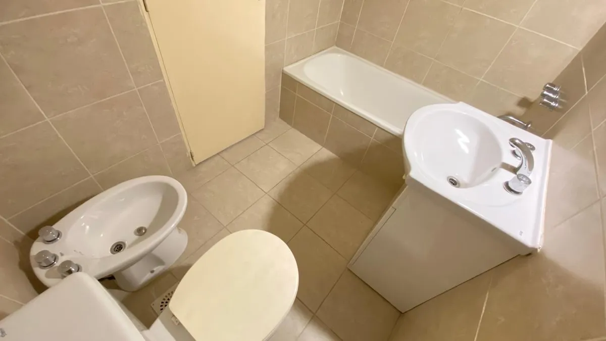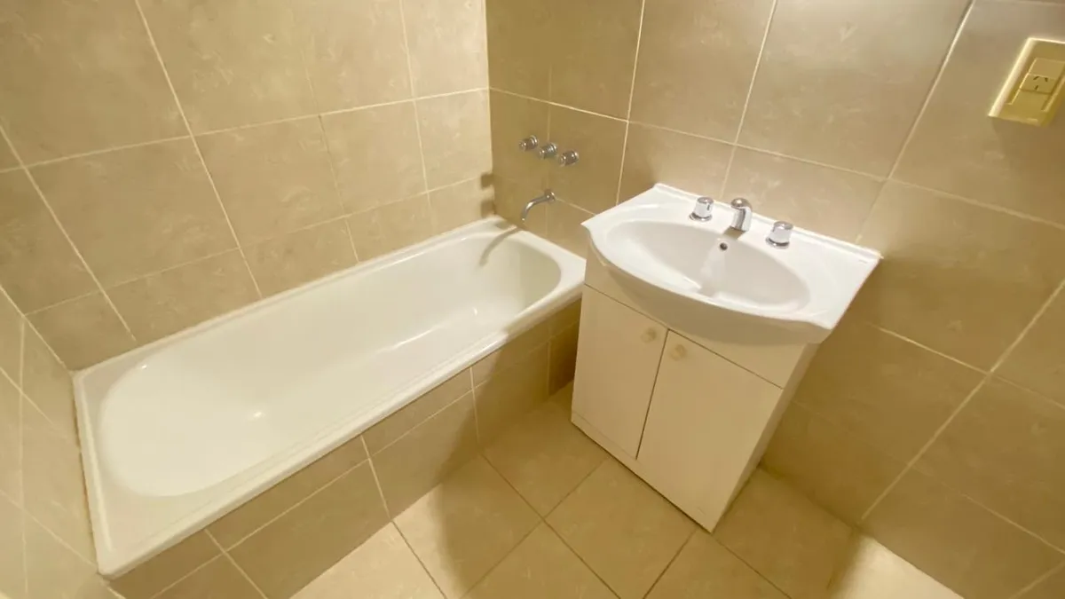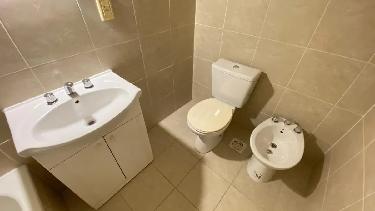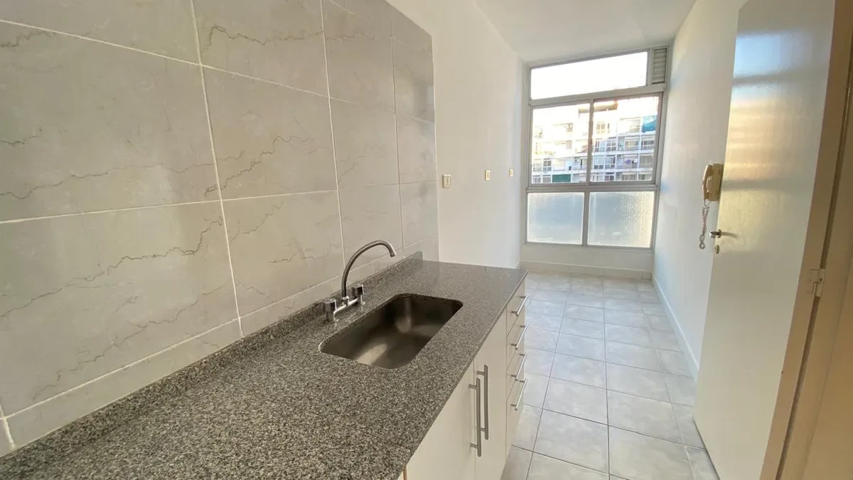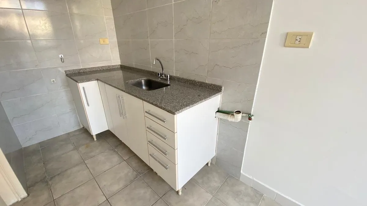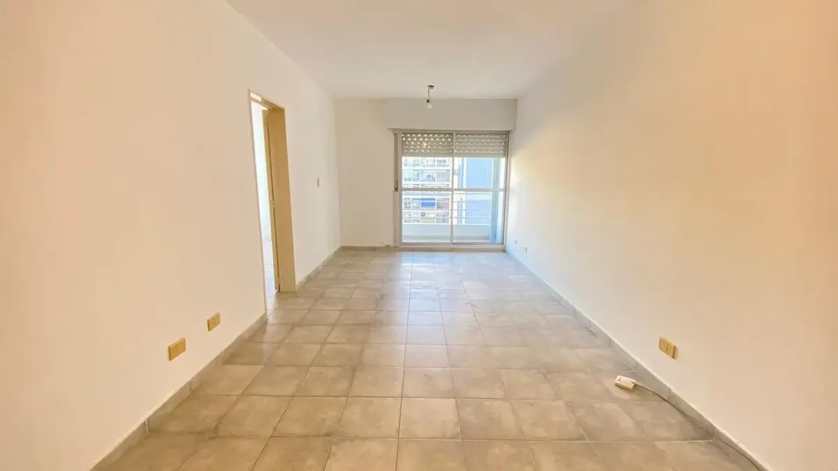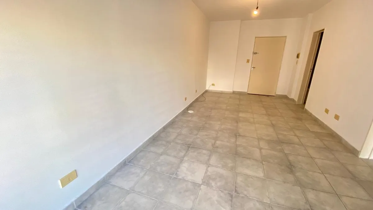 Studio apartment for rent on the 13th floor, courtyard-facing (contrafrente). Separate kitchen with storage space, full bathroom, and a balcony at the front. The listing states electricity only and includes a 24-month lease with quarterly rent increases by ICL.