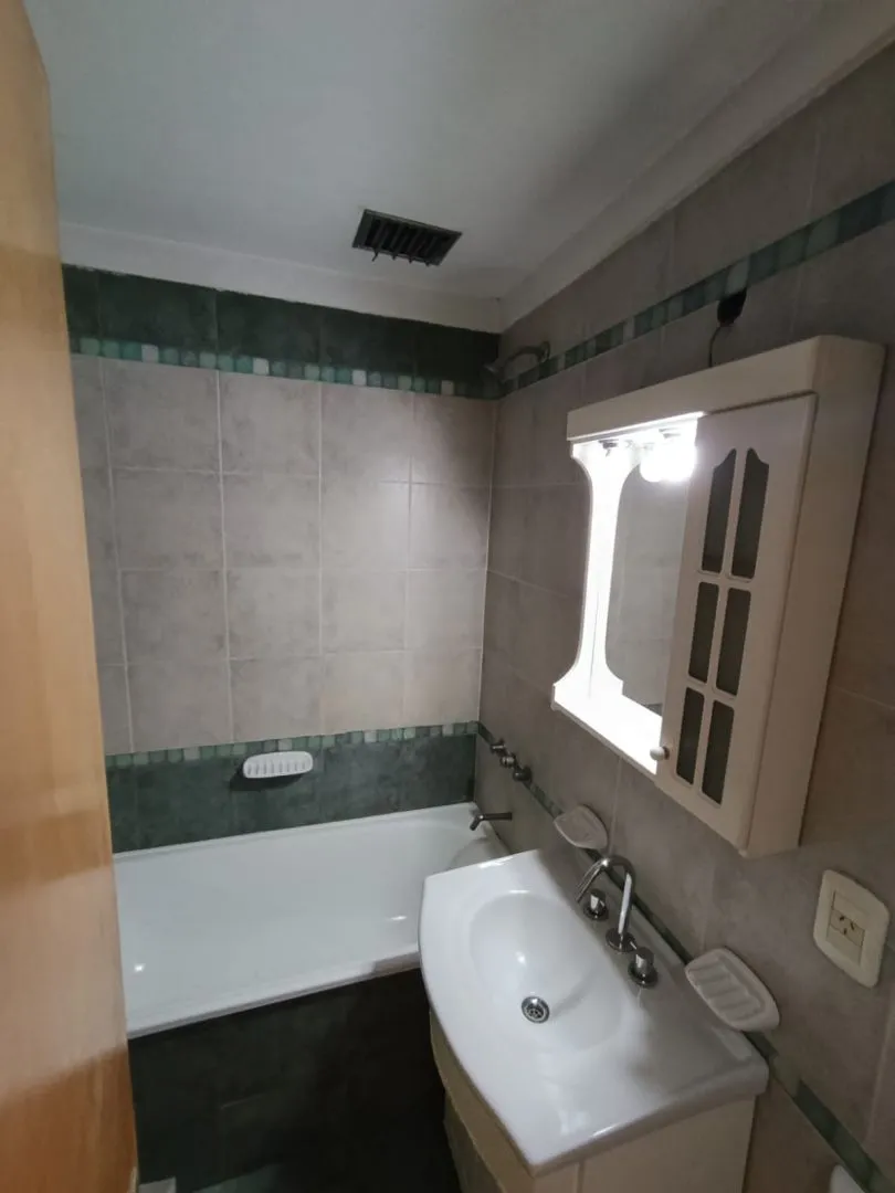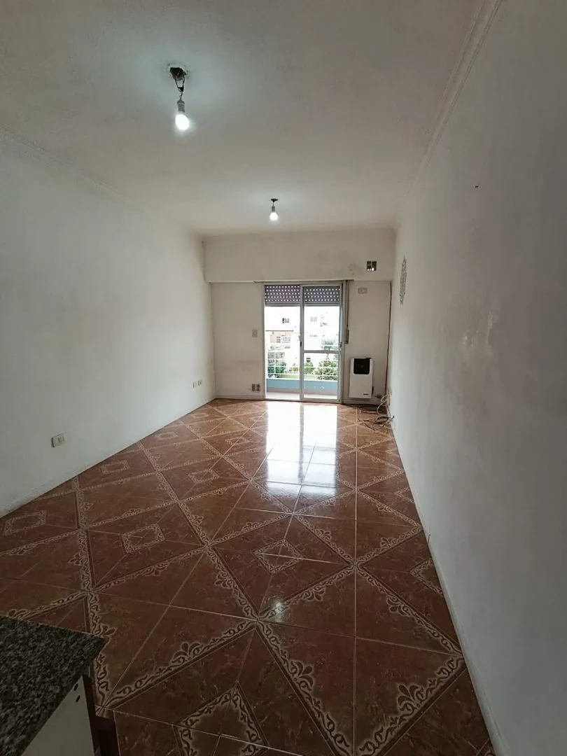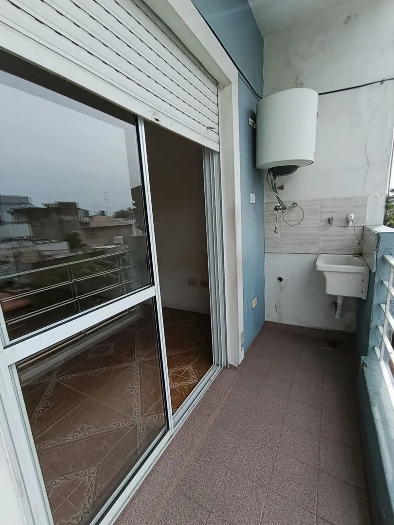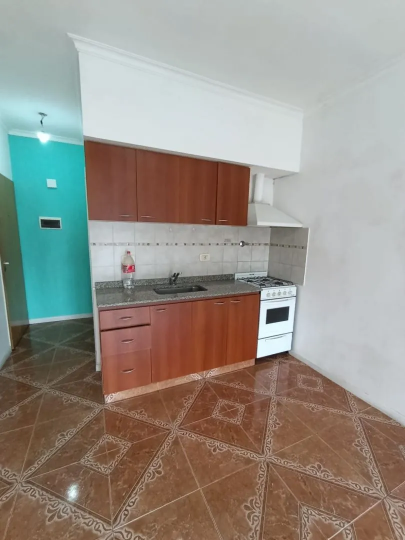 Studio apartment on the first floor in San Justo, La Matanza, with an integrated main room. It is furnished with base and wall cabinets, a balanced-flue heater, an electric water heater, and a bathroom with vanity, bathtub and mirror cabinet. The apartment has a balcony with a small wash area; utilities include separate electricity and gas, plus ordinary building fees, municipal general services and Aysa in proportion to other units. Lease term is 2 years, with quarterly rent increases using the