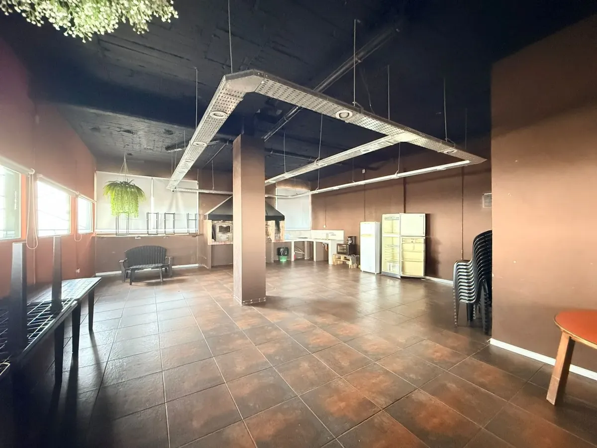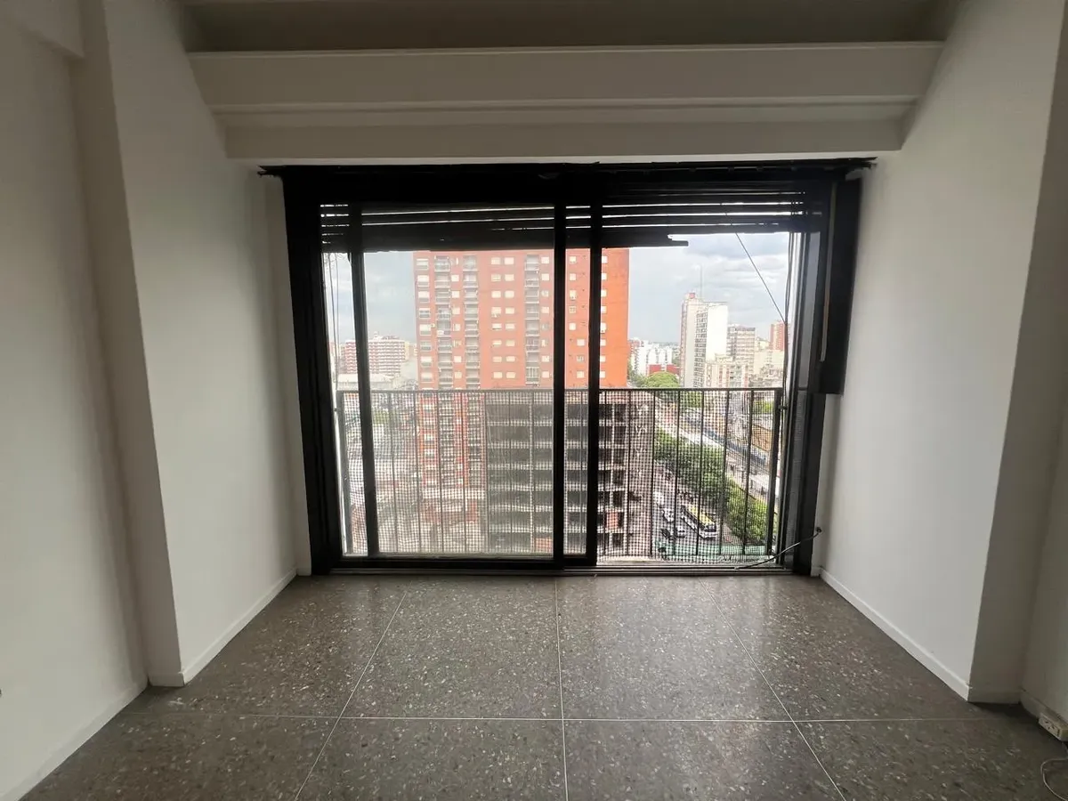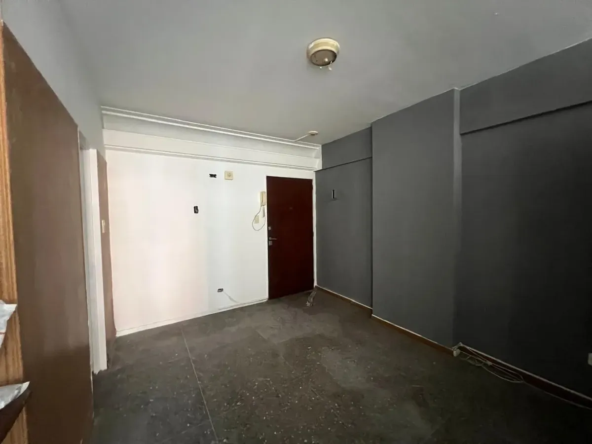 Studio apartment in the centre of Ramos Mejía, subdivided as a separate living/professional unit. The unit has a semi-integrated kitchen, a room-divider furniture unit, and a bathroom with a kitchenette. The building provides 24-hour security and has a SUM for meetings or events.