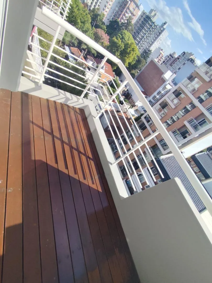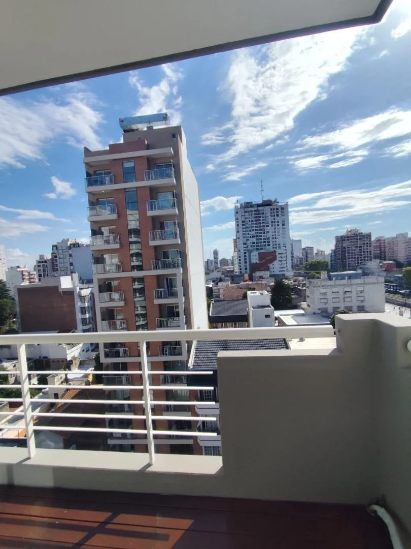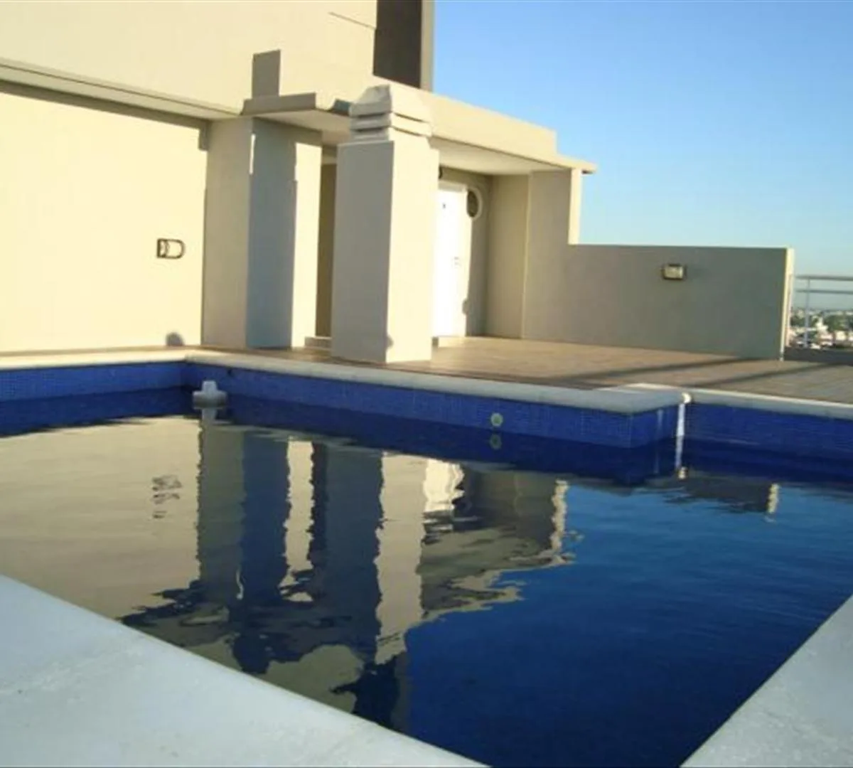 Studio apartment with a balcony at the front. The layout includes a distribution corridor with an embedded wardrobe, a full bathroom, a kitchen area with a washing-machine connection, and a combined living/sleeping space separated from the kitchen by a breakfast bar, with access to the balcony. The building has a gym, double SUM, pool and a grill/quincho, and charges building fees; pets are not allowed. The listing states electricity, paving, sewer, gas and running water; it also notes balcony/t