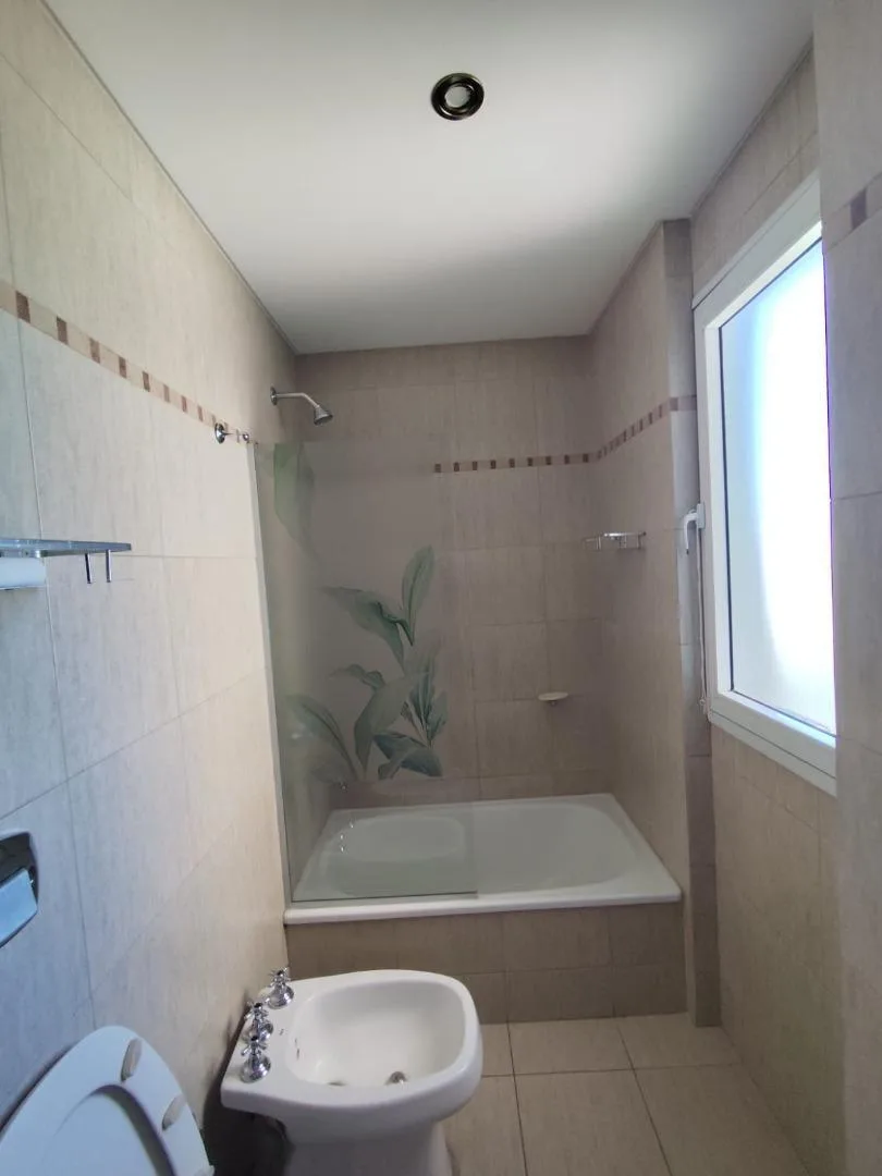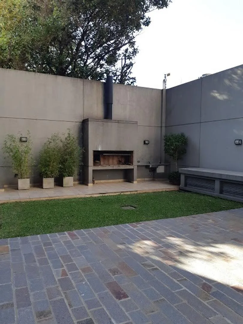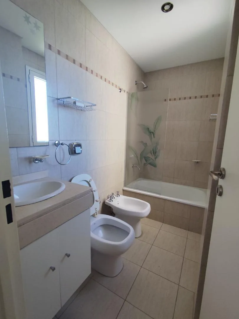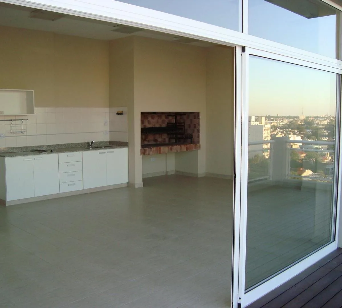 Studio apartment with a balcony at the front. The layout includes a distribution corridor with an embedded wardrobe, a full bathroom, a kitchen area with a washing-machine connection, and a combined living/sleeping space separated from the kitchen by a breakfast bar, with access to the balcony. The building has a gym, double SUM, pool and a grill/quincho, and charges building fees; pets are not allowed. The listing states electricity, paving, sewer, gas and running water; it also notes balcony/t