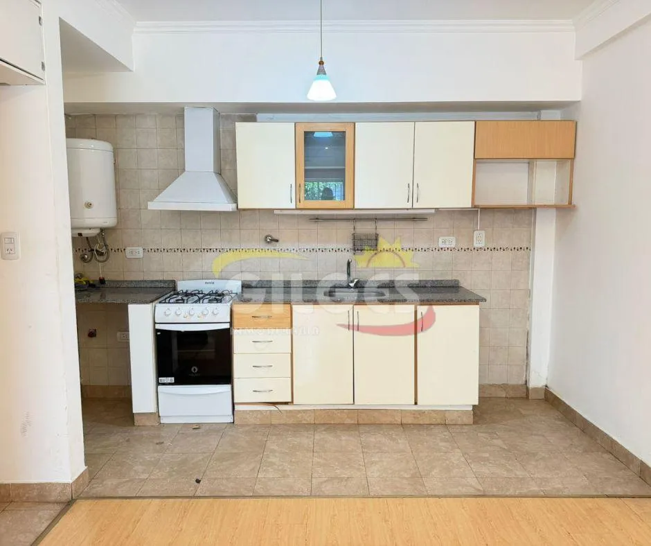 Studio apartment on the ground floor, street-facing. It has laminate flooring, a built-in wardrobe, a split air-conditioning unit and a stove. The integrated kitchen comes with fitted furniture and storage space, and the full bathroom includes a shower screen. The building has a shared terrace with a grill. Rental requires a family property guarantee or the Monclair S.A. guarantee system.