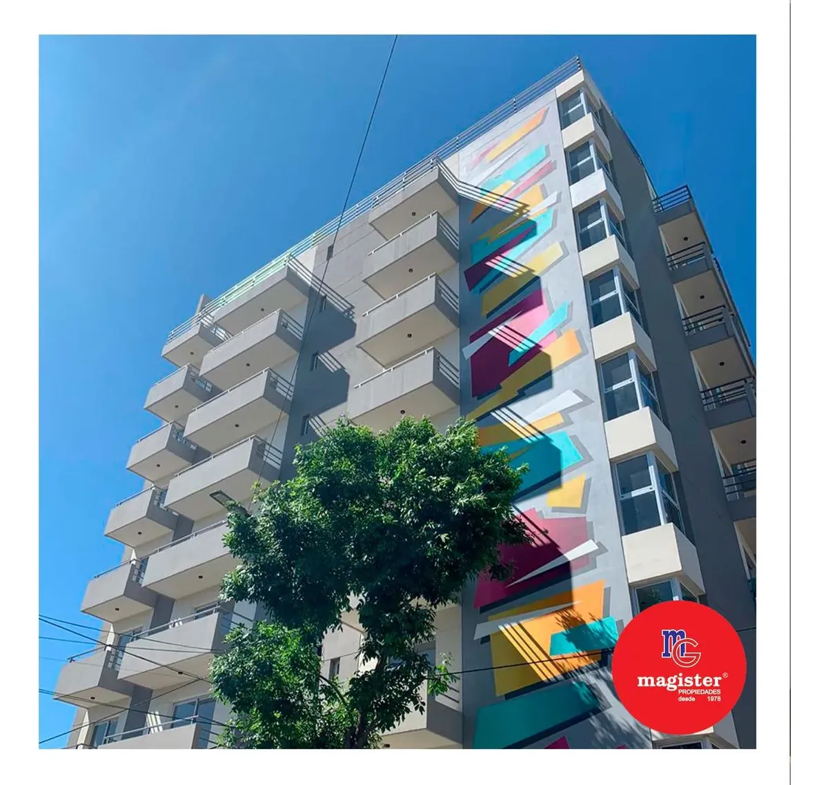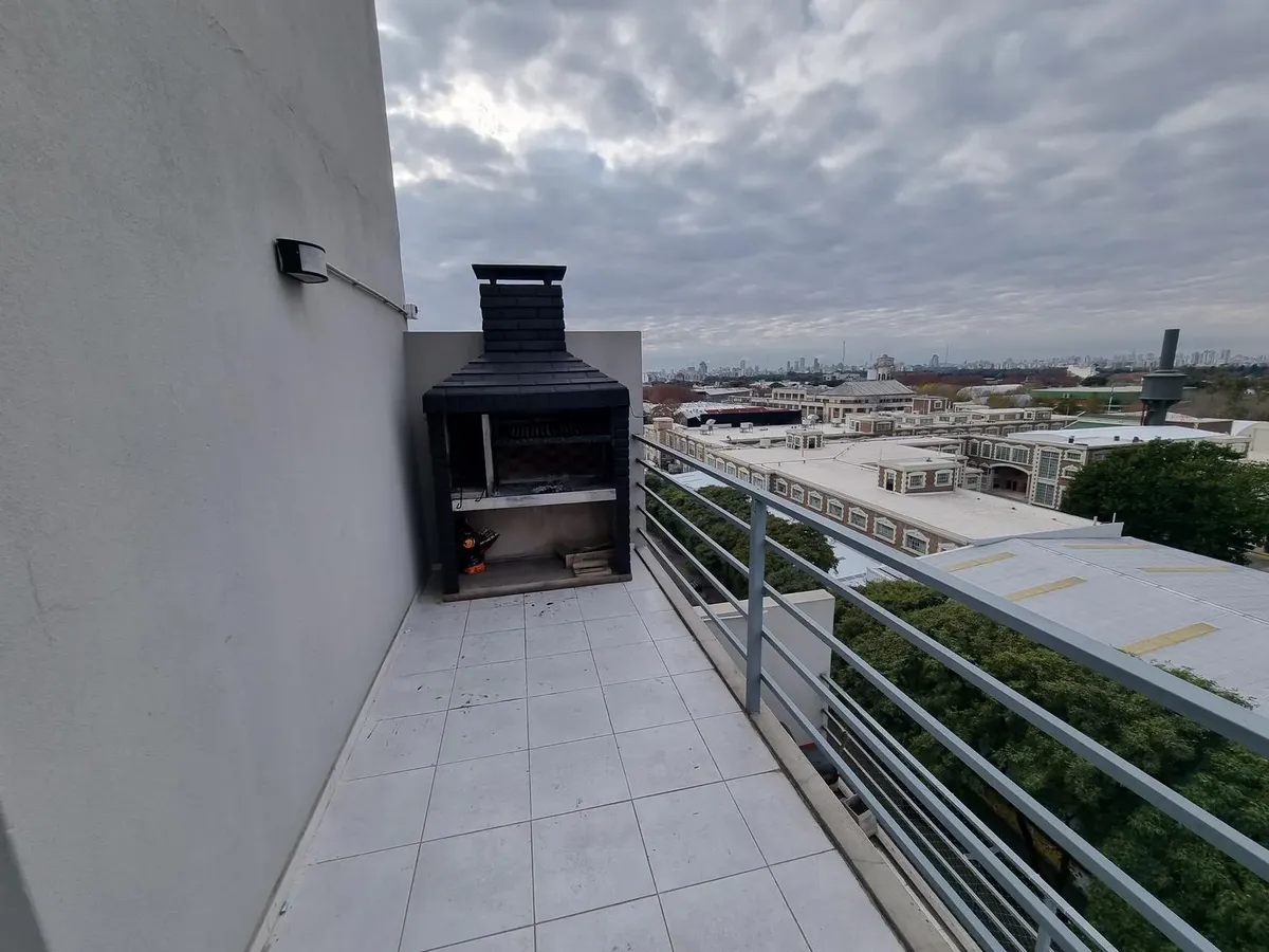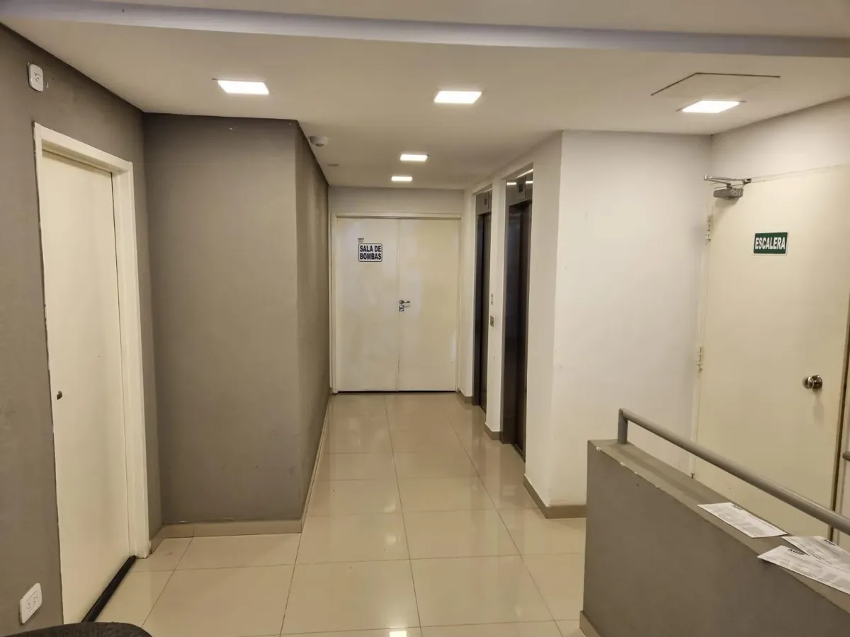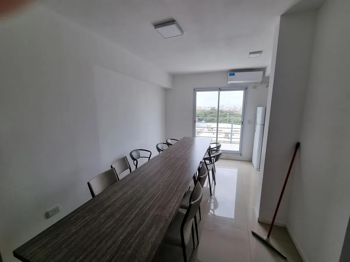 Studio apartment with 29 m² covered area plus 2.5 m² uncovered space, street-facing and east-facing, with a balcony. Layout includes an integrated living-dining area with an American-style kitchen and a full bathroom. The building is 8 years old and has two elevators, individual air conditioning, cold/hot heating, aluminium joinery and an electric water heater. Building amenities include a covered BBQ area (parrilla) and a communal residents' room (SUM); it is suitable for professional use and h