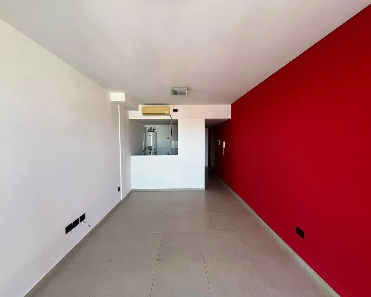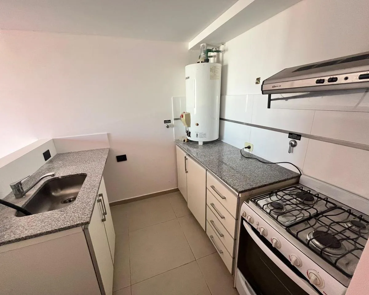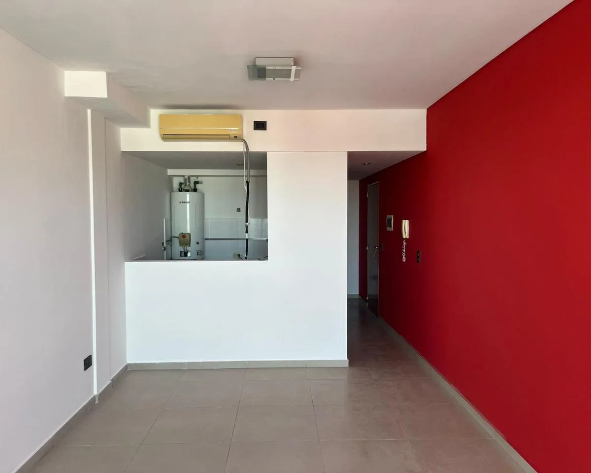 Studio apartment for rent on Av 44. It includes a kitchenette with lower cabinets, a connection for a washing machine, air conditioning f/c, and a balcony facing the courtyard (contrafrente).