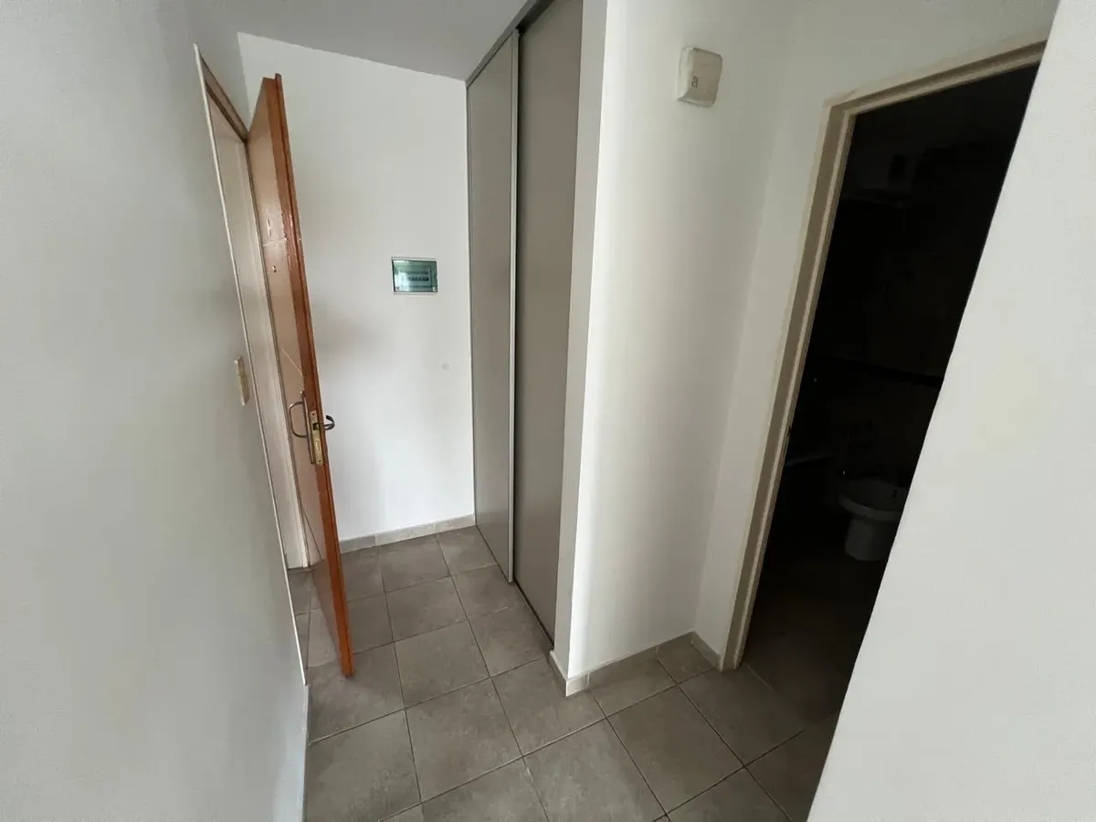 Studio apartment facing the courtyard, with a separate kitchen separated by a breakfast bar, a balcony, built-in wardrobe and a full bathroom. One-year rental contract.