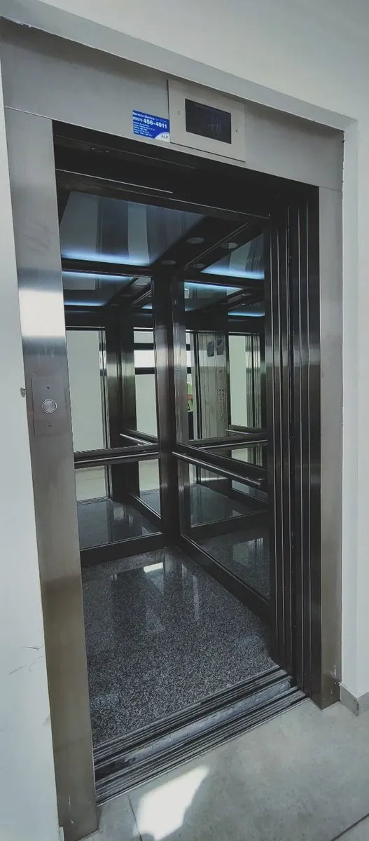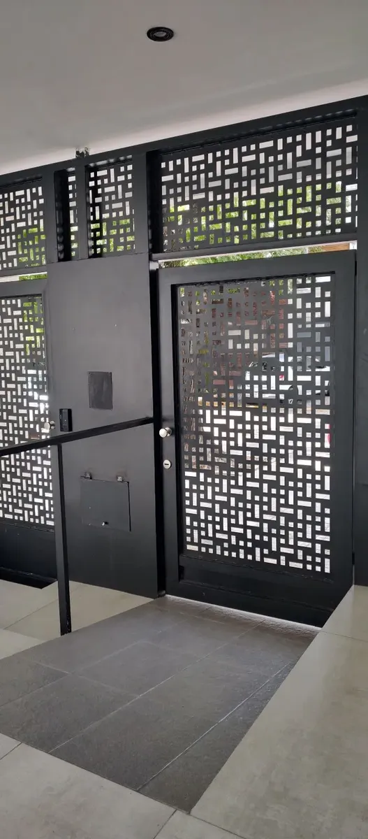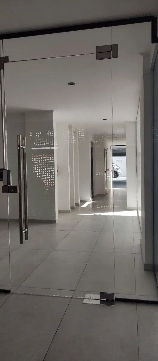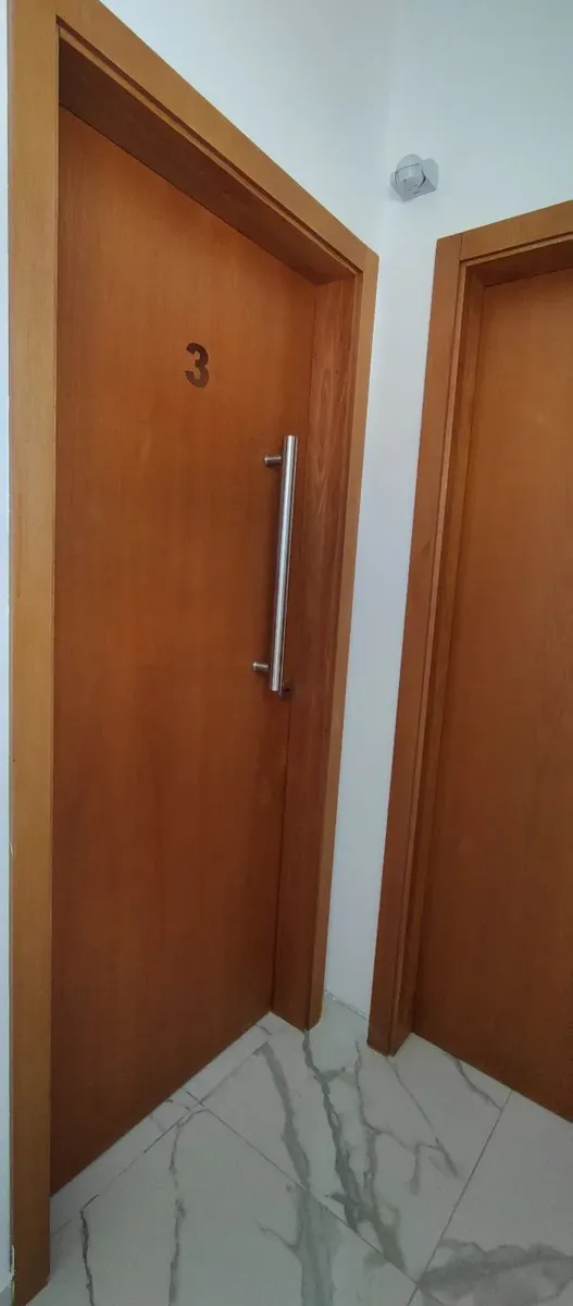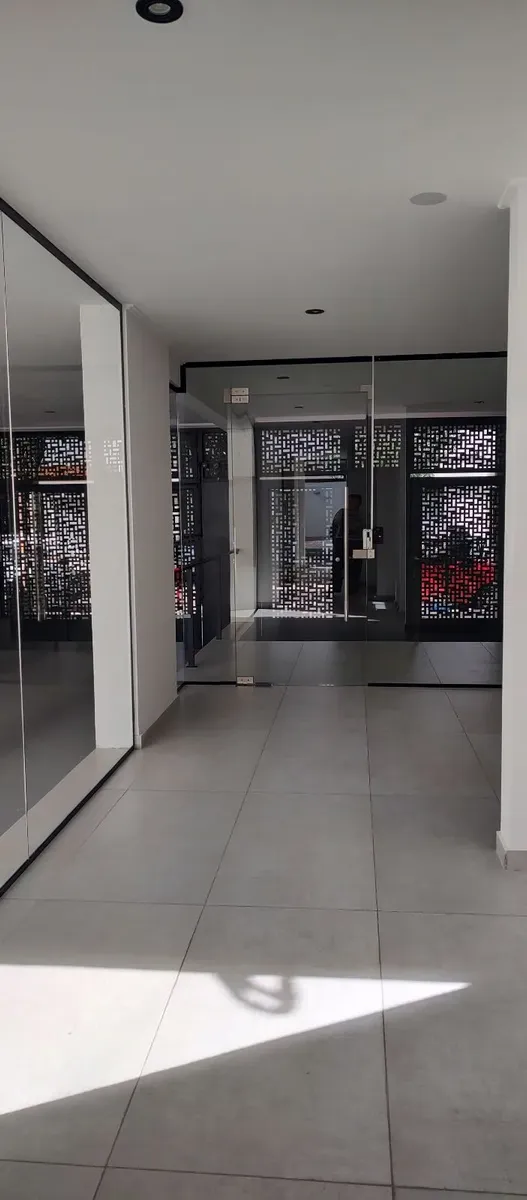 New studio apartment with a balcony. It has a bathroom with natural ventilation, a kitchen with a double sink and upper and lower cabinets, and space for a washing machine. The unit includes air-conditioning for heating and has an interior storage/closet area; the building has an elevator and two entry gates with magnetic-key access.