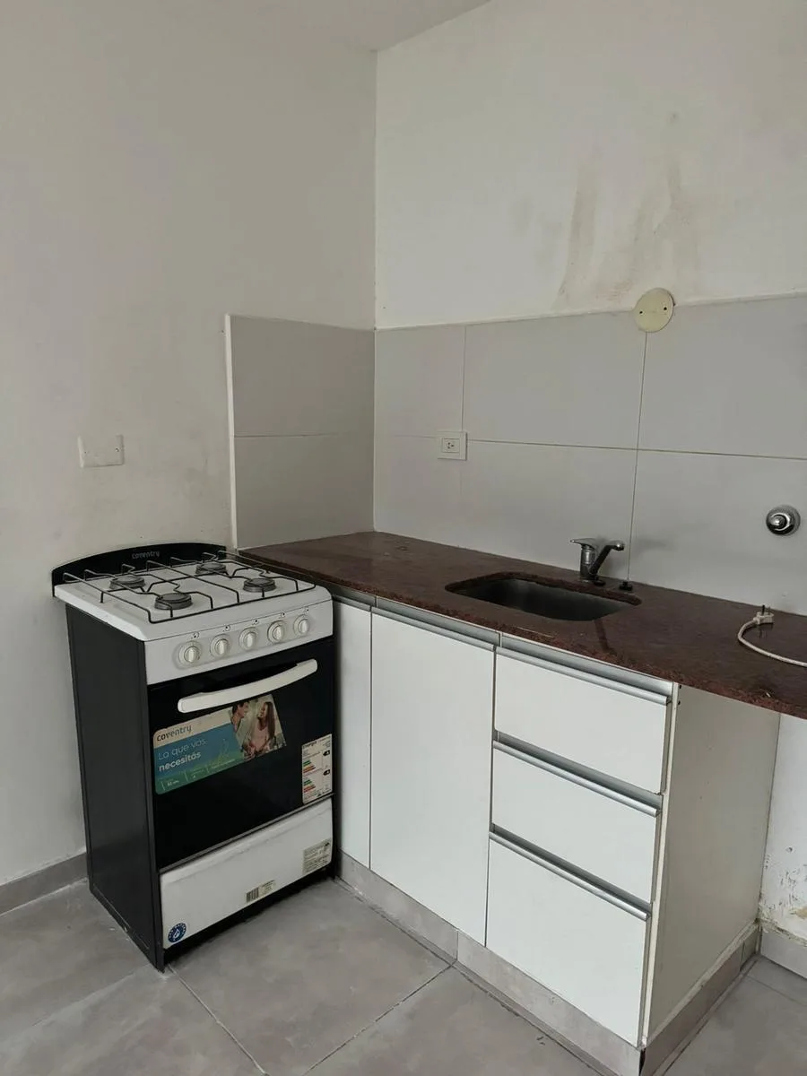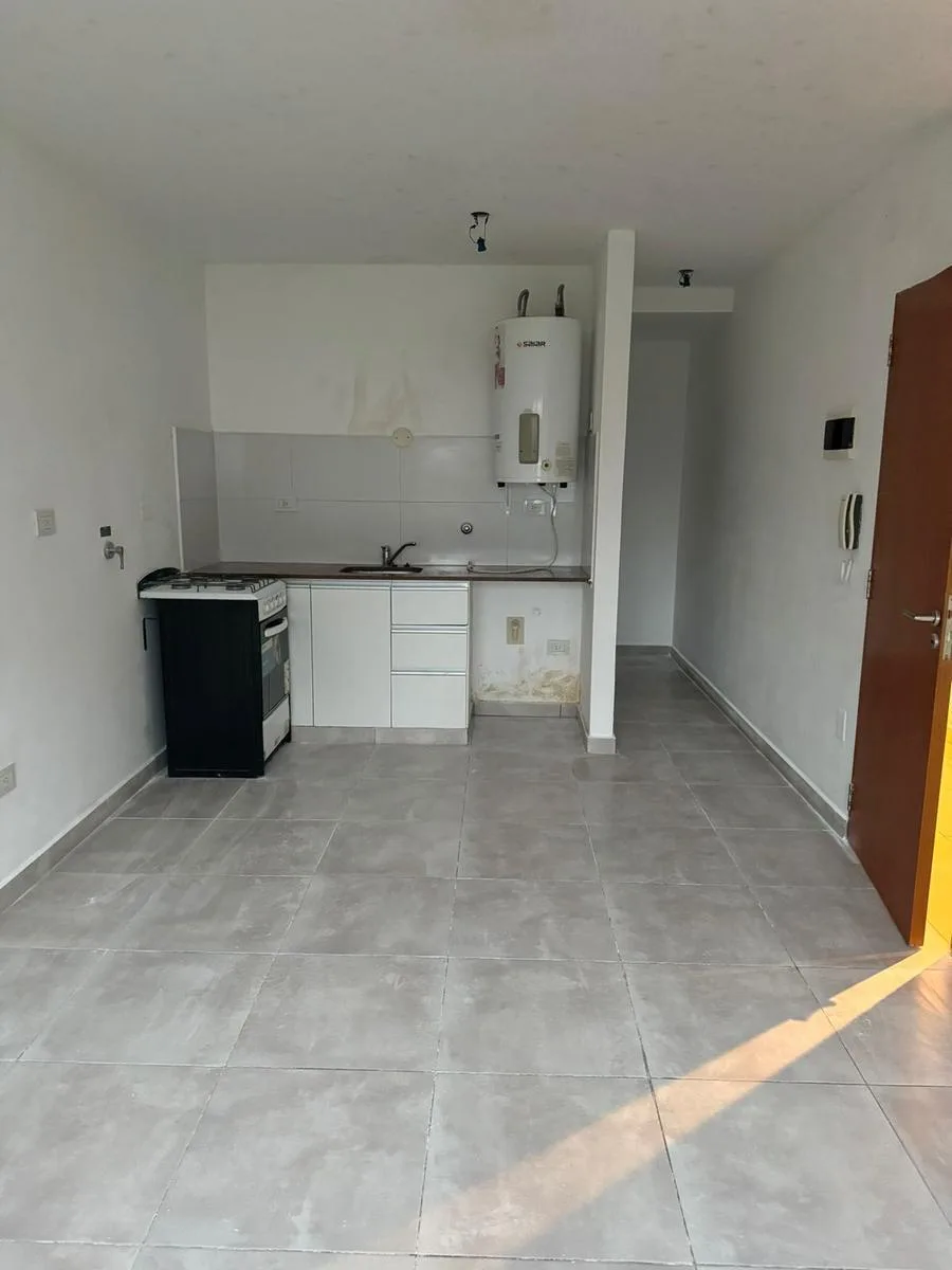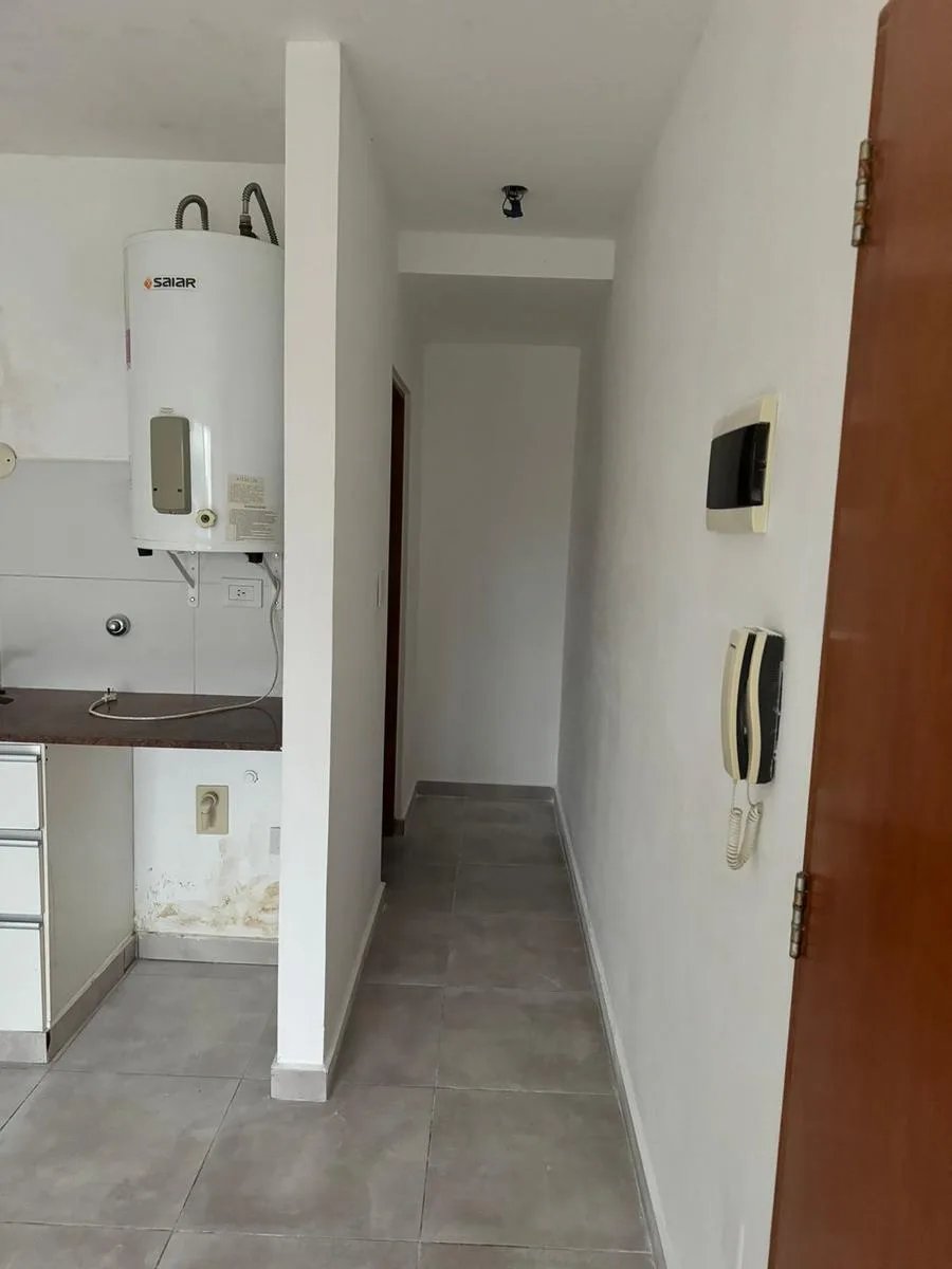 Studio apartment for rent on Calle 39 between 11 and 12 in La Plata, Buenos Aires. It is on the ground floor and accessed by elevator, with a courtyard-facing (contrafrente) layout and north orientation. The unit has an equipped kitchen with lower cabinets, a main room with storage, and a full bathroom with a bathtub. Total area is approximately 30 m² covered. Building fees as of 22/01/2026 are approximately $80,000.