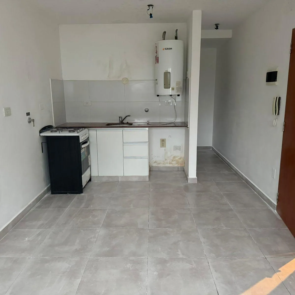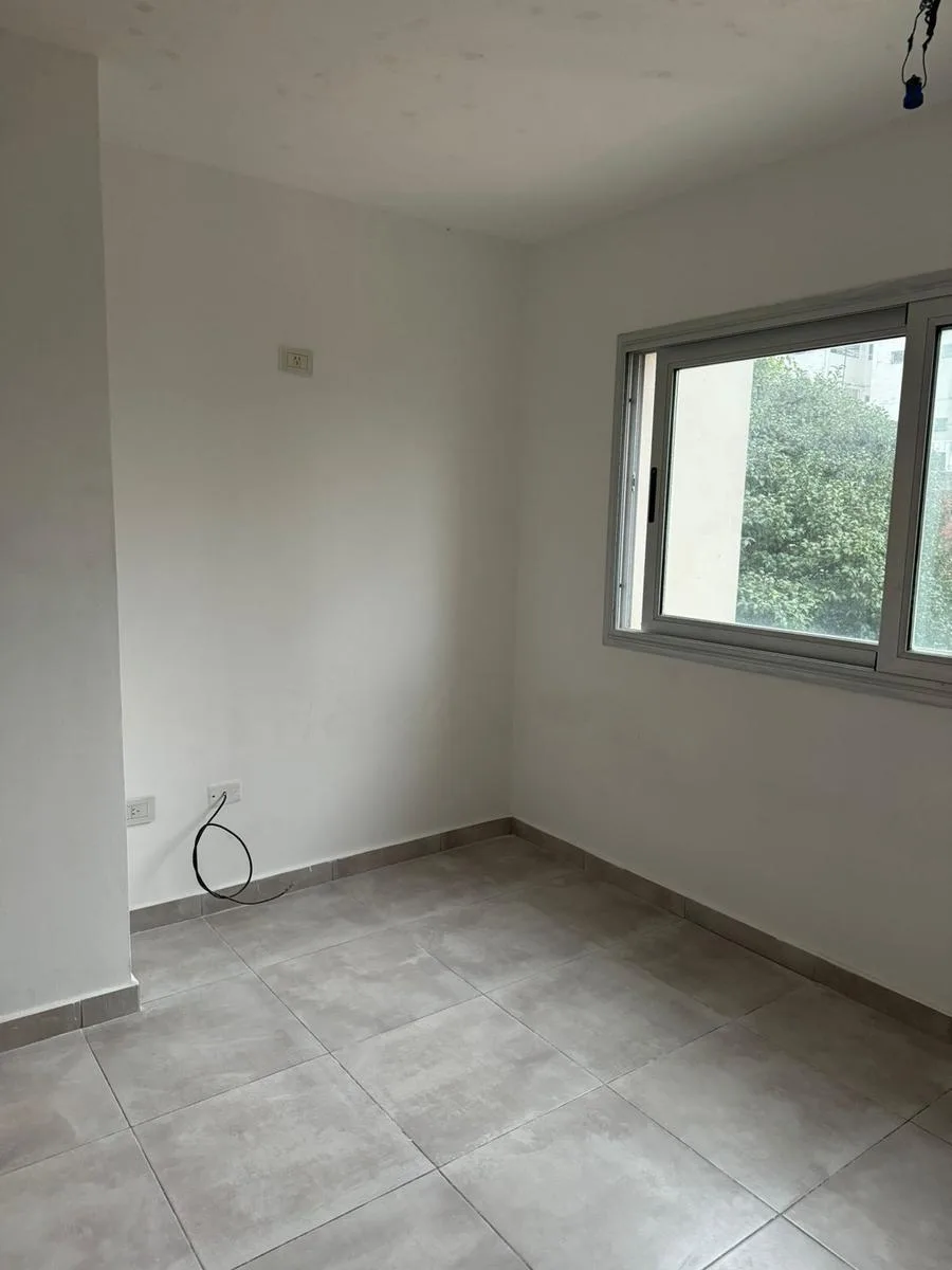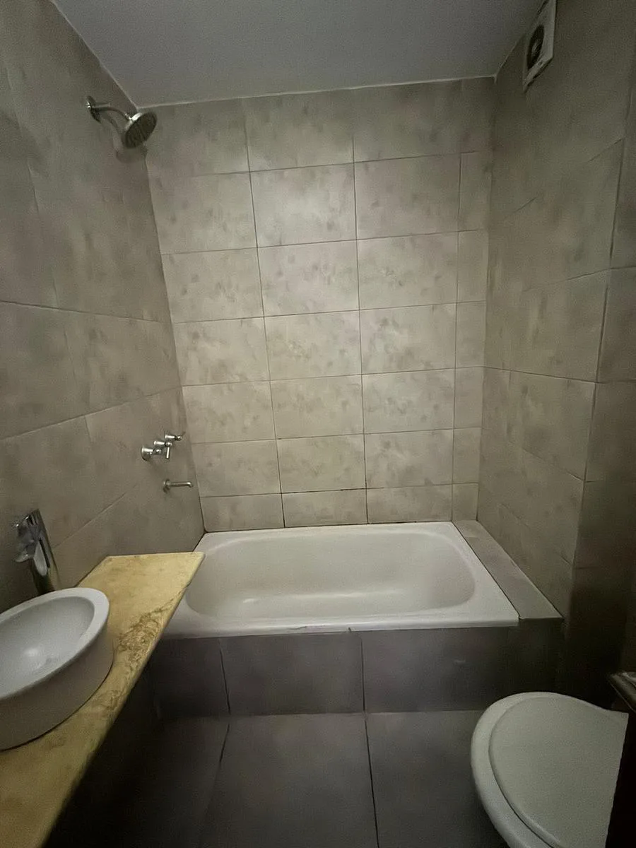 Studio apartment for rent on Calle 39 between 11 and 12 in La Plata, Buenos Aires. It is on the ground floor and accessed by elevator, with a courtyard-facing (contrafrente) layout and north orientation. The unit has an equipped kitchen with lower cabinets, a main room with storage, and a full bathroom with a bathtub. Total area is approximately 30 m² covered. Building fees as of 22/01/2026 are approximately $80,000.