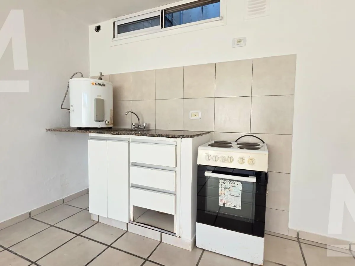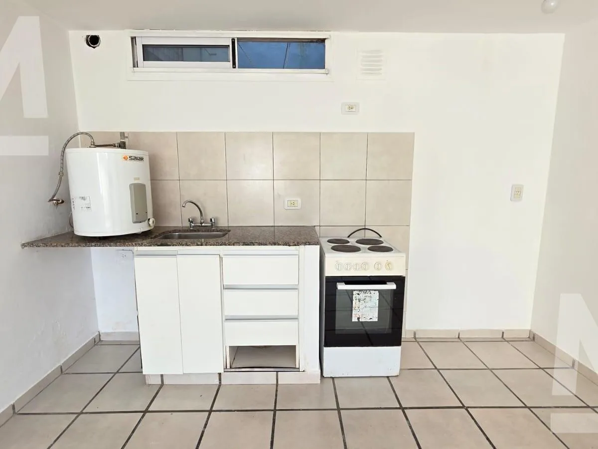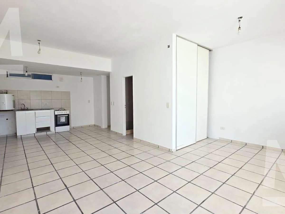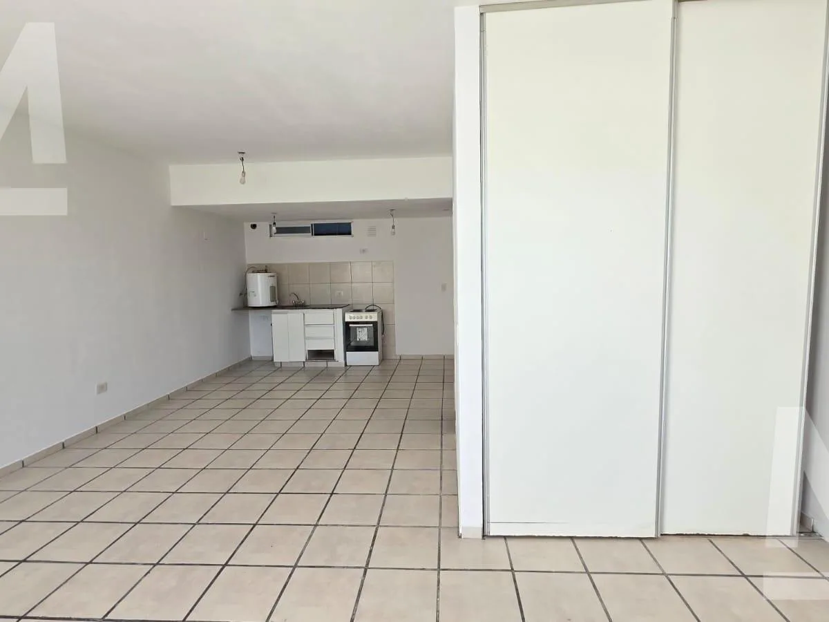 Ground-floor studio with a living-dining area with built-in wardrobe, integrated kitchen, full bathroom, and a patio with an uncovered parking space. The unit runs on electricity only and has no gas. Approximate building fees are $35,000 with ABSA included; lease term is 2 years with a quarterly rent adjustment.