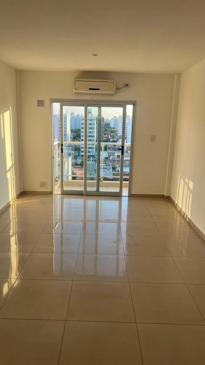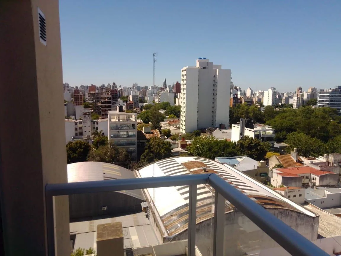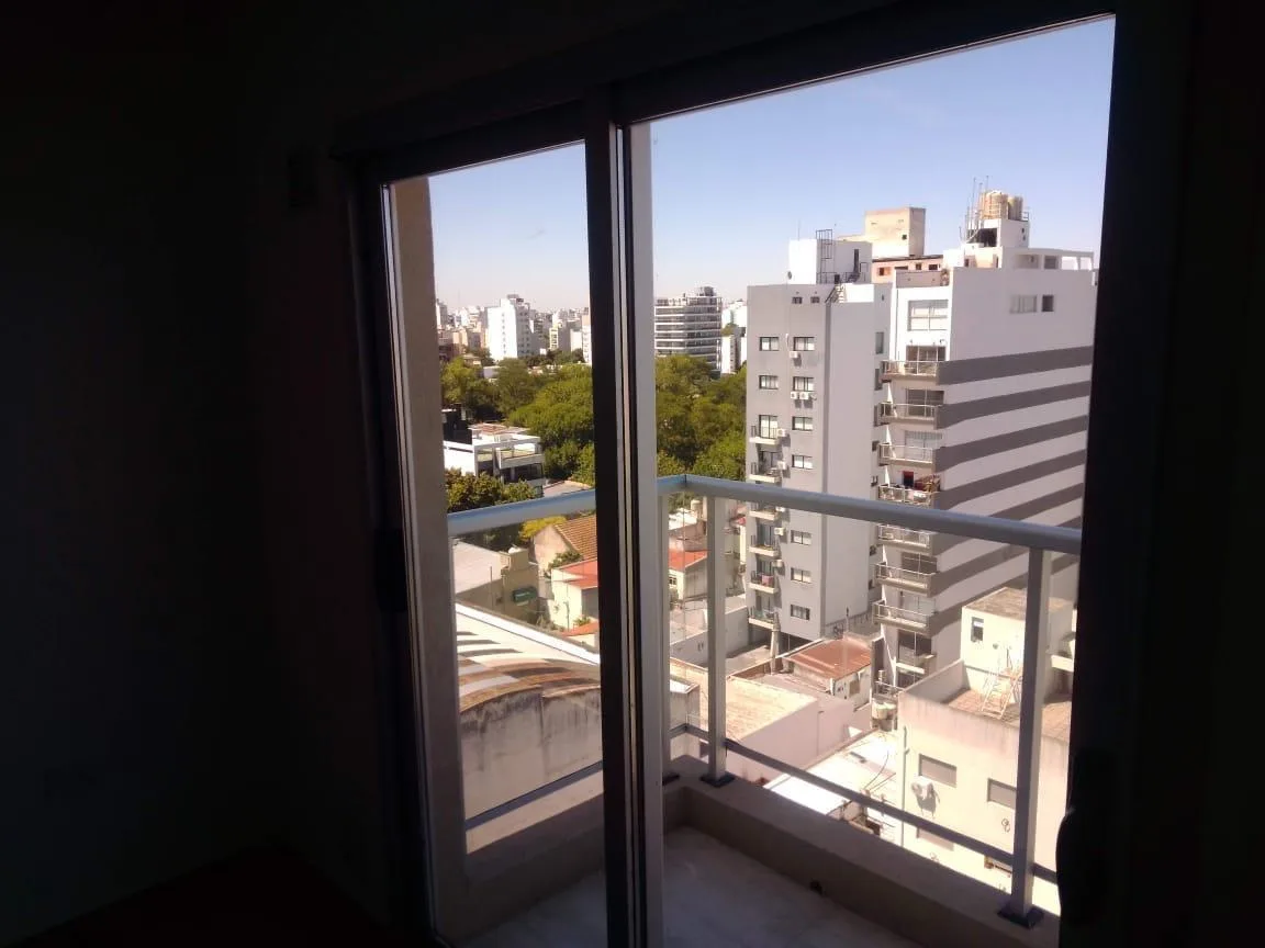 Studio apartment for rent with 38 m² total area, 36 m² covered, on the 9th floor and street-facing, with northeast orientation. It has a main room, a separate kitchen with upper and lower fitted cabinets, a full bathroom and a front balcony. The unit has porcelain tile flooring and double-glazed windows (DVH). The building has a large terrace with a grill area (parrillas), an equipped kitchen and a toilet.