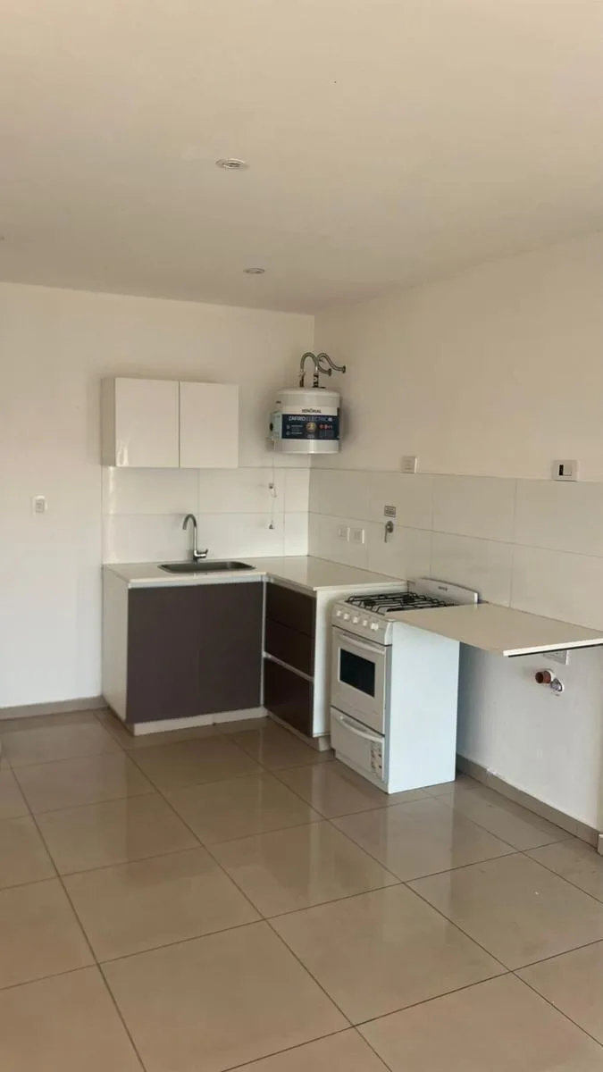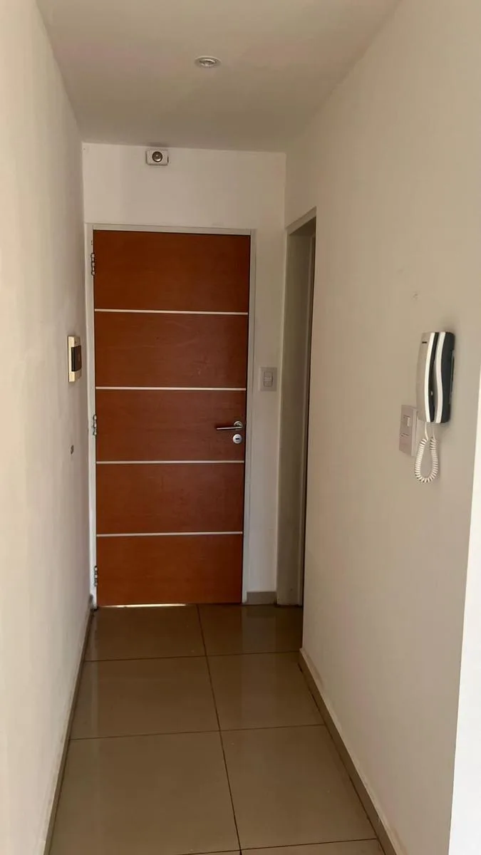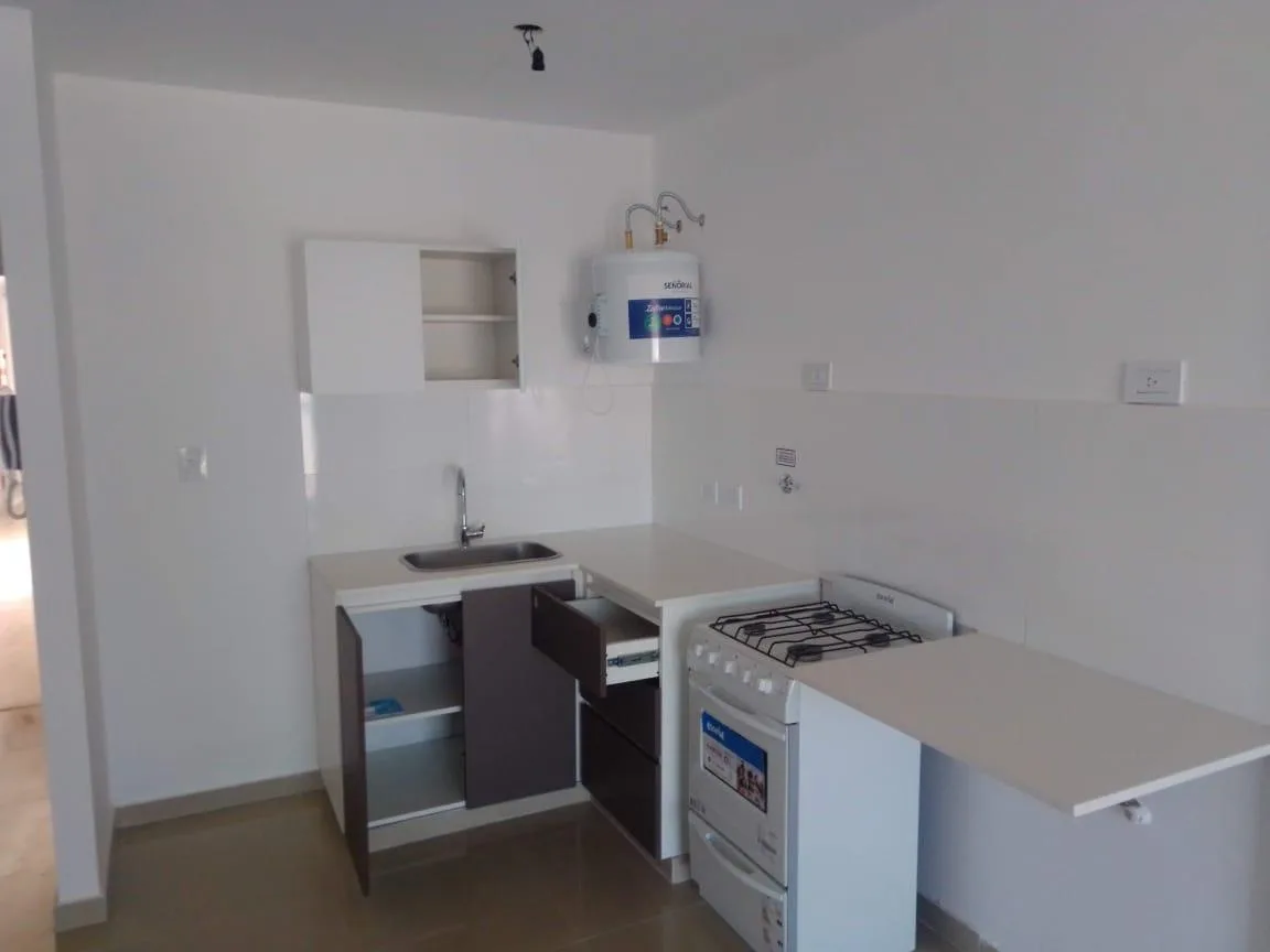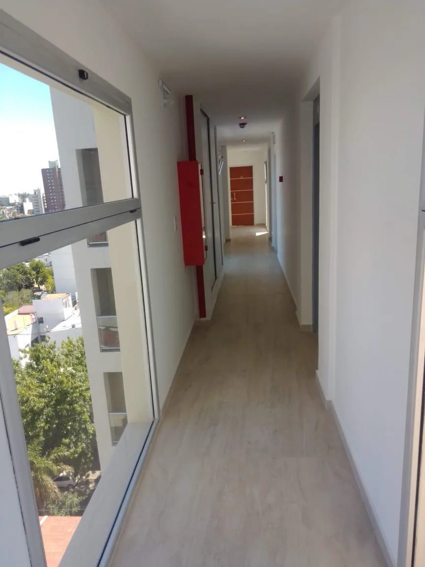 Studio apartment for rent with 38 m² total area, 36 m² covered, on the 9th floor and street-facing, with northeast orientation. It has a main room, a separate kitchen with upper and lower fitted cabinets, a full bathroom and a front balcony. The unit has porcelain tile flooring and double-glazed windows (DVH). The building has a large terrace with a grill area (parrillas), an equipped kitchen and a toilet.
