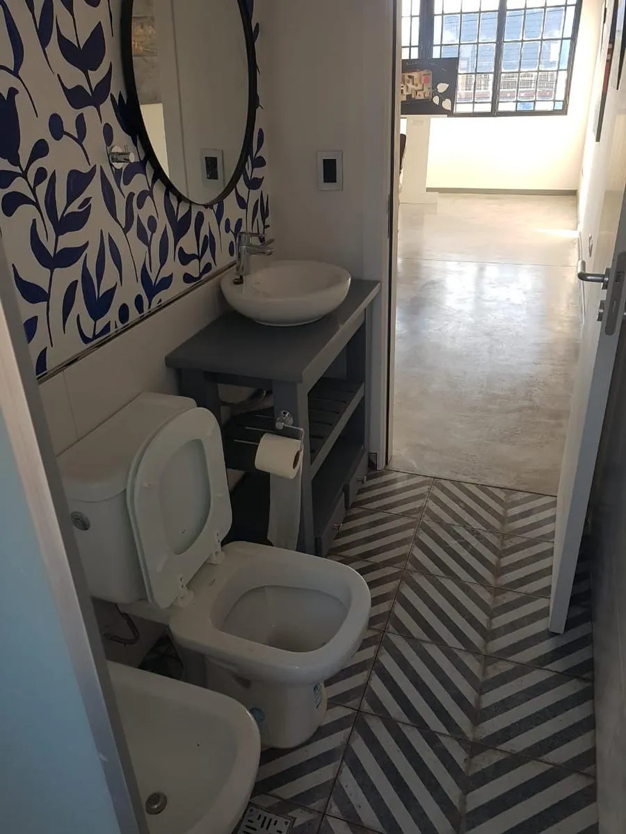Studio apartment reached via stairs, with a single large living-dining/sleeping area. Kitchen with electric water heater (termotanque eléctrico), pre-installation for a washing machine, and a bathroom with a shower screen. The rent is agreed for 2 years; quarterly increases are adjusted by IPC. The tenant pays Edesur. Entry costs listed include two alternative budgets depending on the rental guarantee: (1) GISA $403,200 (transfer/deposit or Bapro) plus rent $400,000, sellados $96,000, bonuses, s
