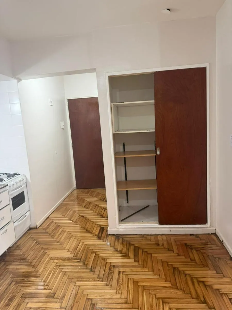 Studio apartment for rent with side layout. Includes fitted closet with interior, a gas integrated kitchen with base cabinets, and a full bathroom. Located in Belgrano, within walking distance of Plaza Castelli, Subte Juramento Line D station, and Belgrano R station on the Mitre commuter rail.