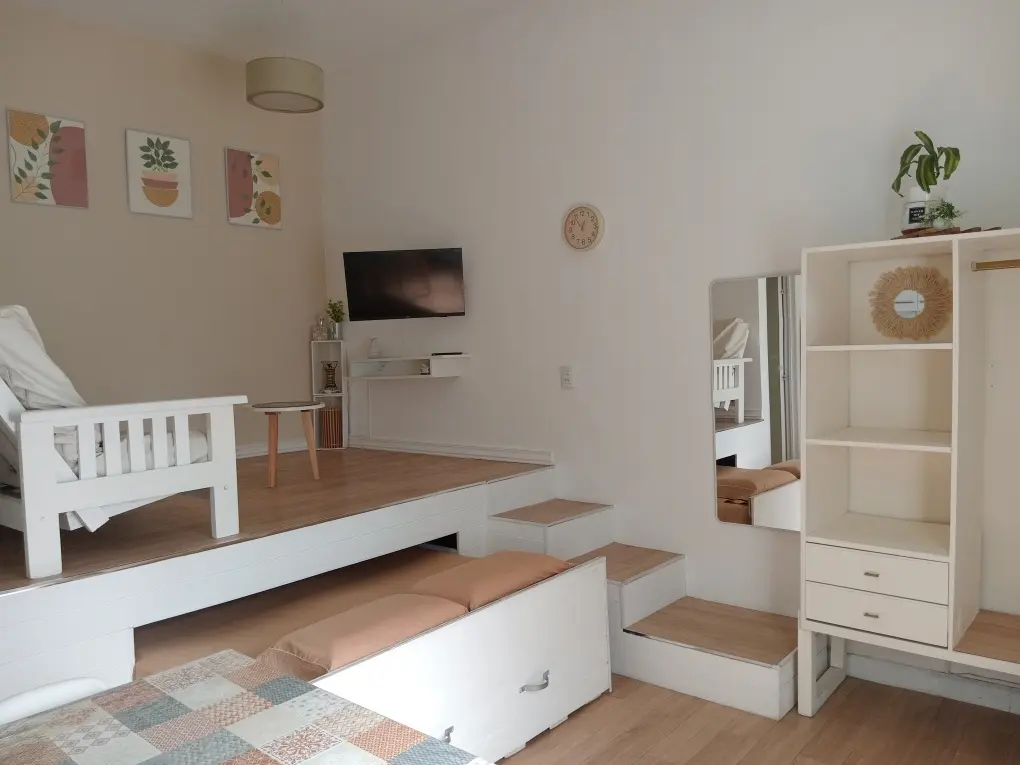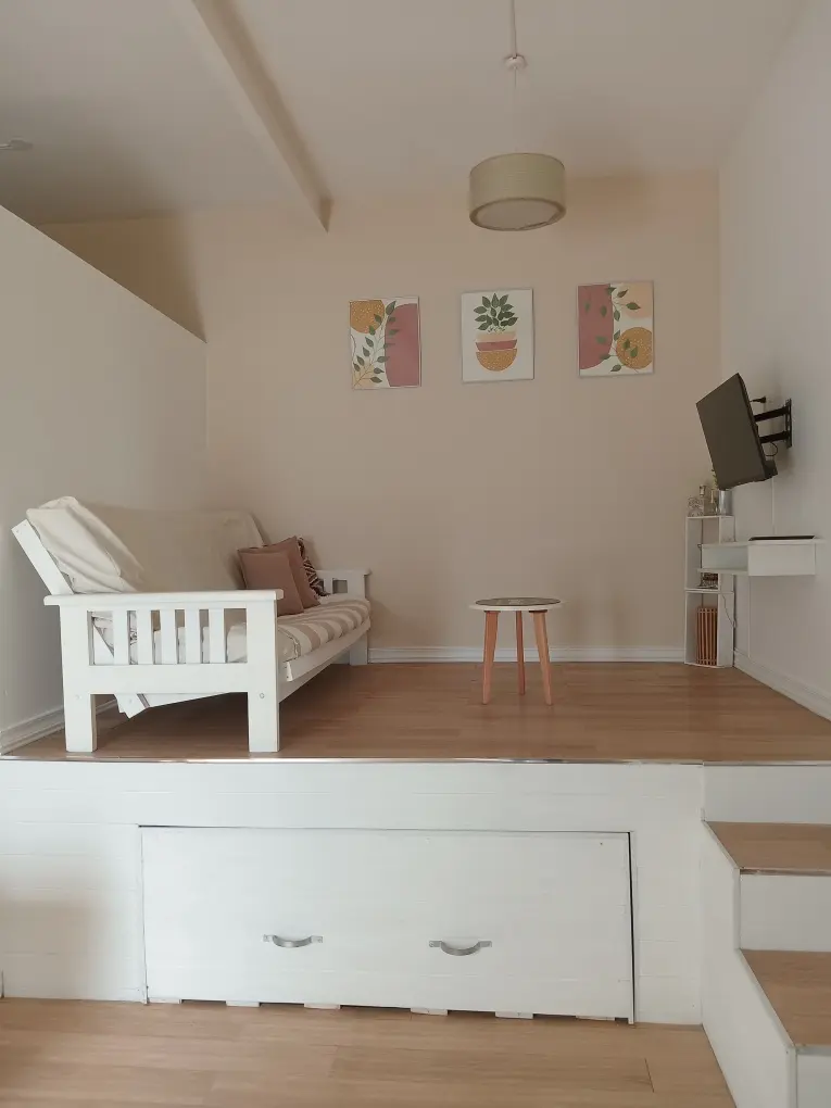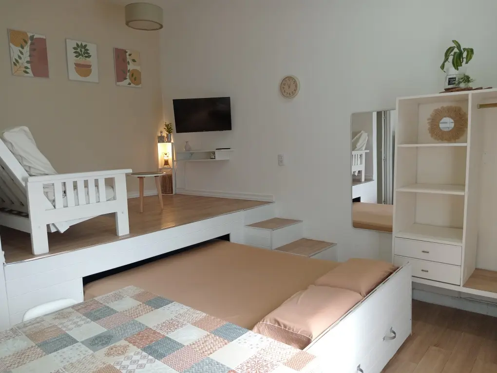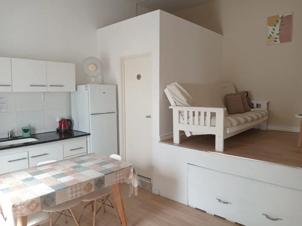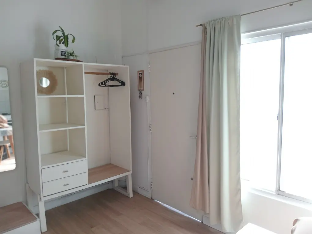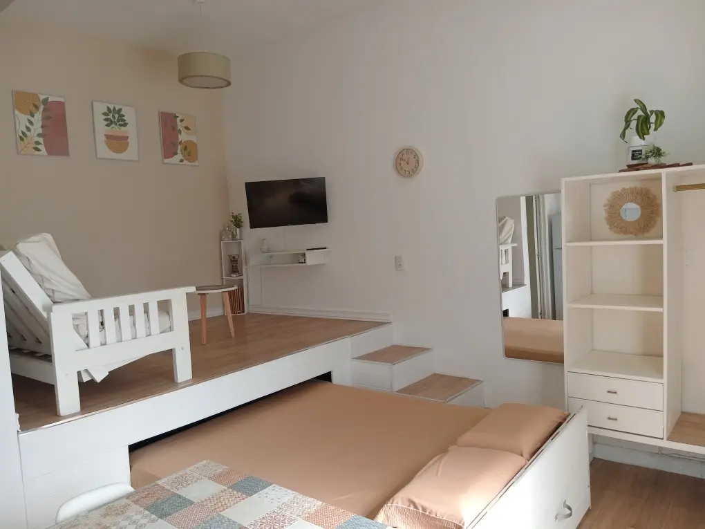 Studio apartment of 25 m² in Lanús with natural light. The unit has a queen bed set into the mezzanine and a wall-mounted 32-inch TV with Android TV. There is a fully equipped electric kitchen, air conditioning (hot/cold), and fibre-optic Wi‑Fi. Building fees are not mentioned; a cleaning fee applies. Parties, children, pets and smoking are not allowed inside the apartment.