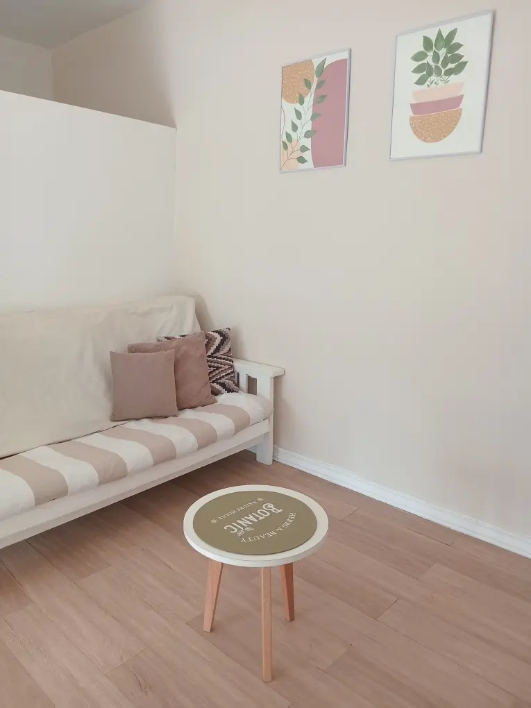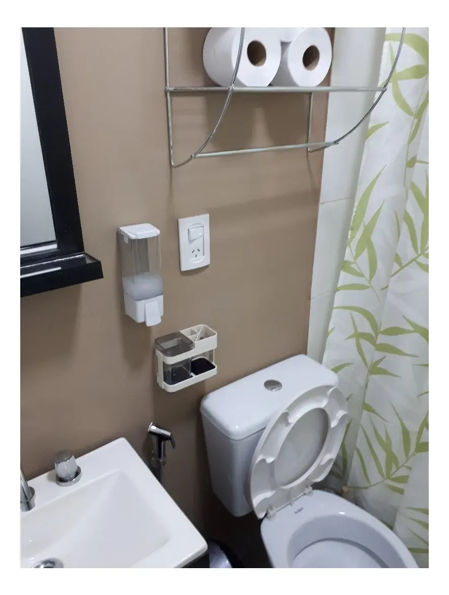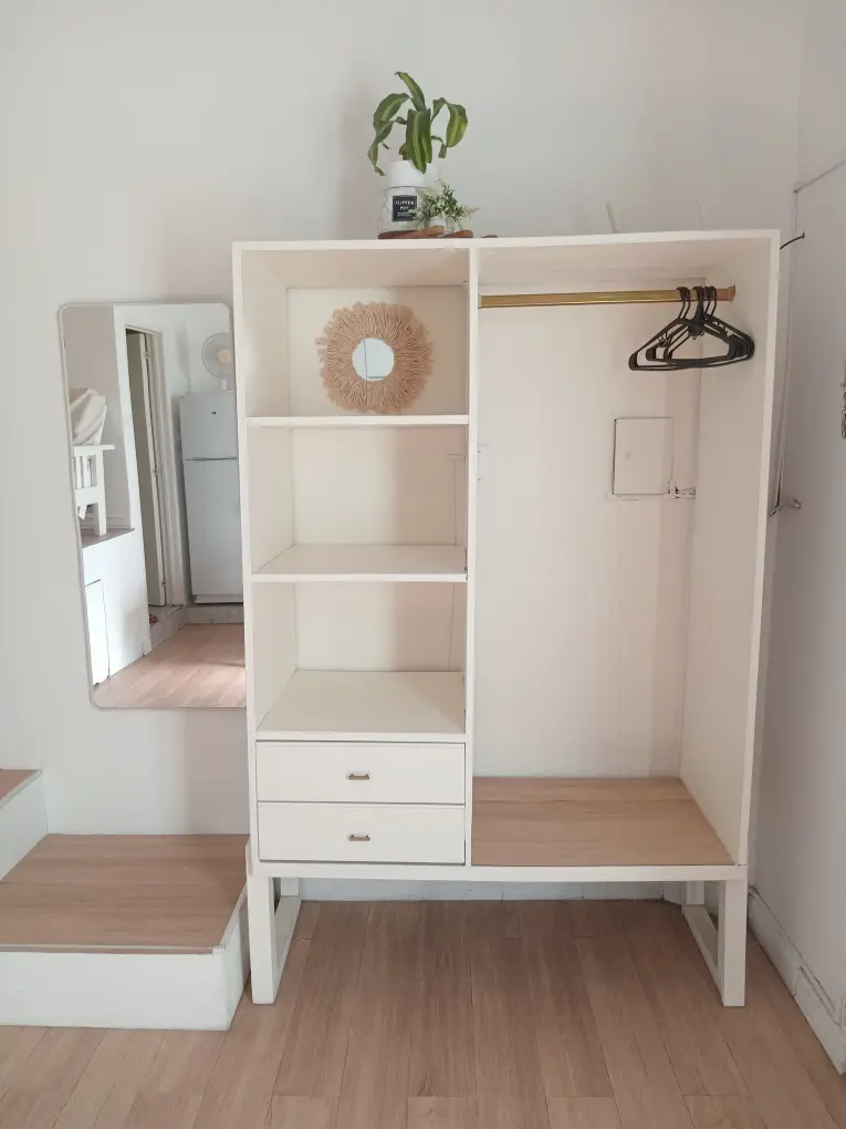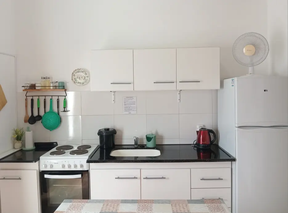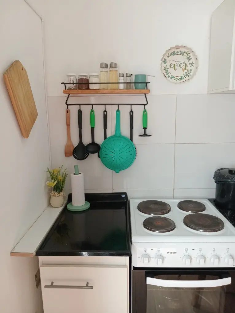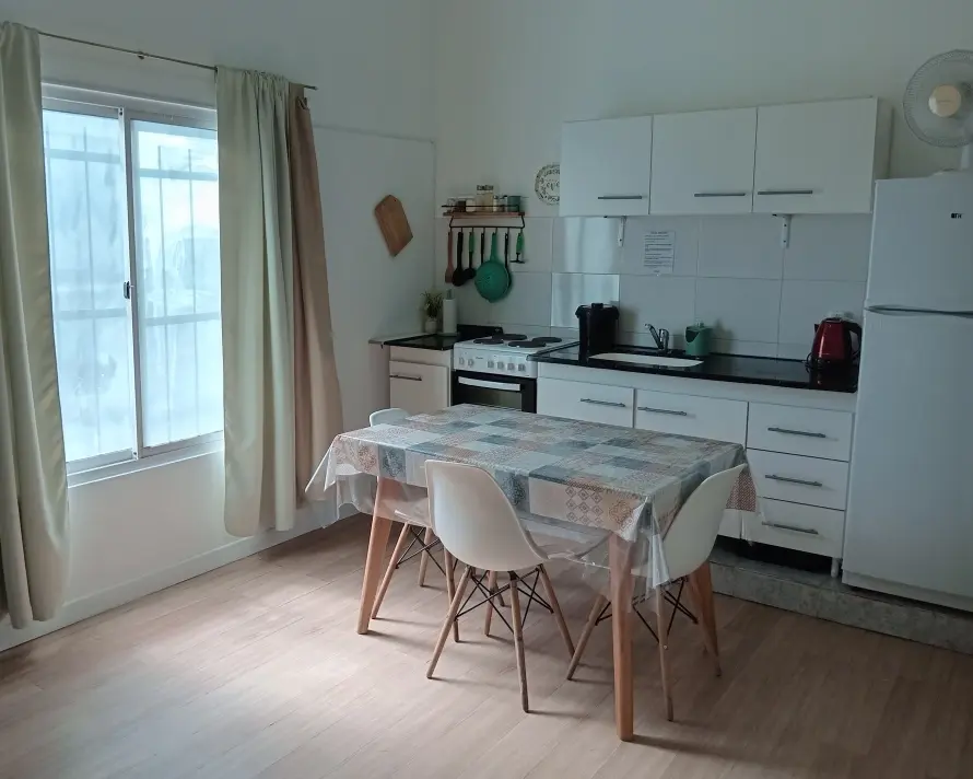 Studio apartment of 25 m² in Lanús with natural light. The unit has a queen bed set into the mezzanine and a wall-mounted 32-inch TV with Android TV. There is a fully equipped electric kitchen, air conditioning (hot/cold), and fibre-optic Wi‑Fi. Building fees are not mentioned; a cleaning fee applies. Parties, children, pets and smoking are not allowed inside the apartment.