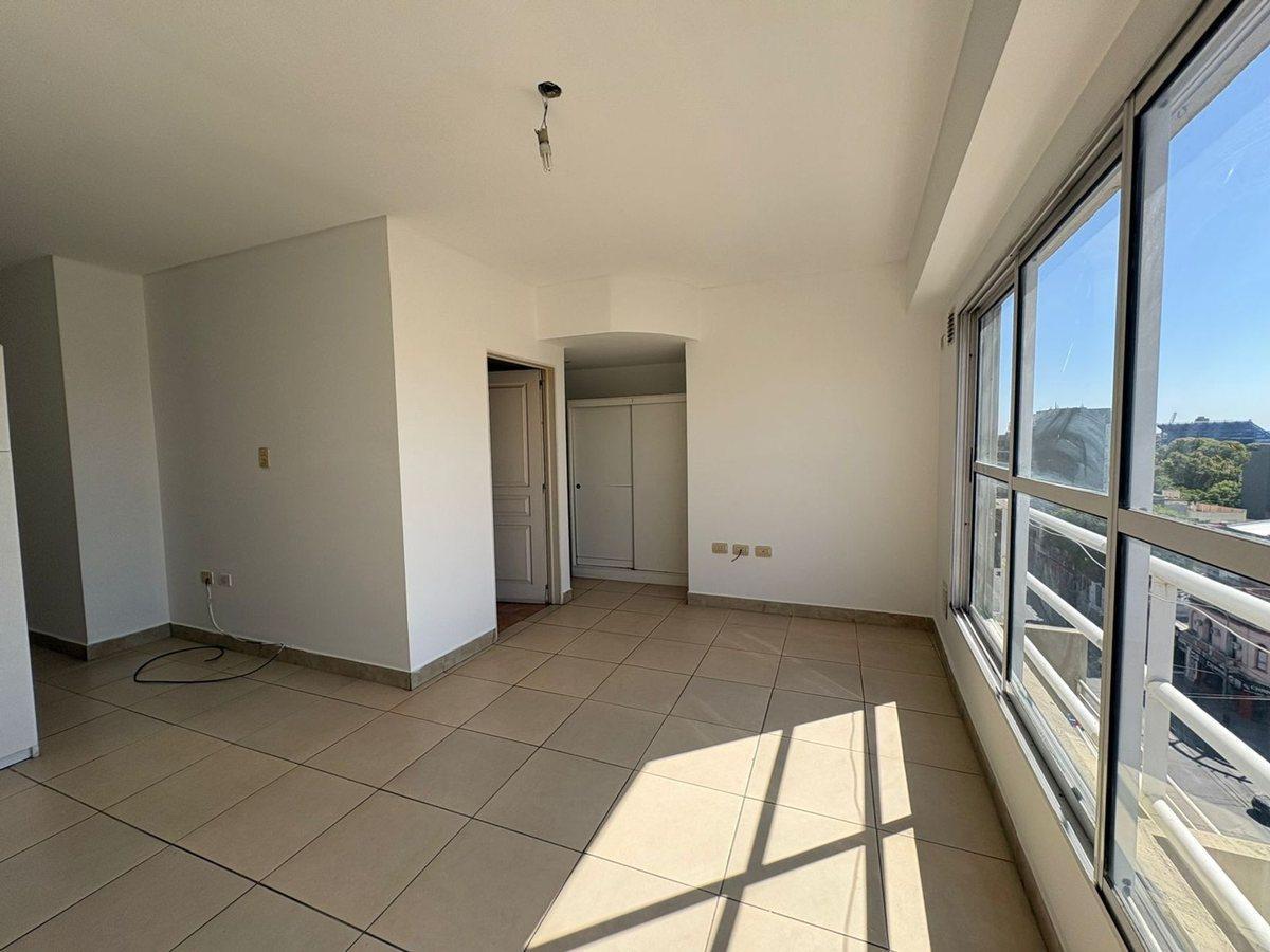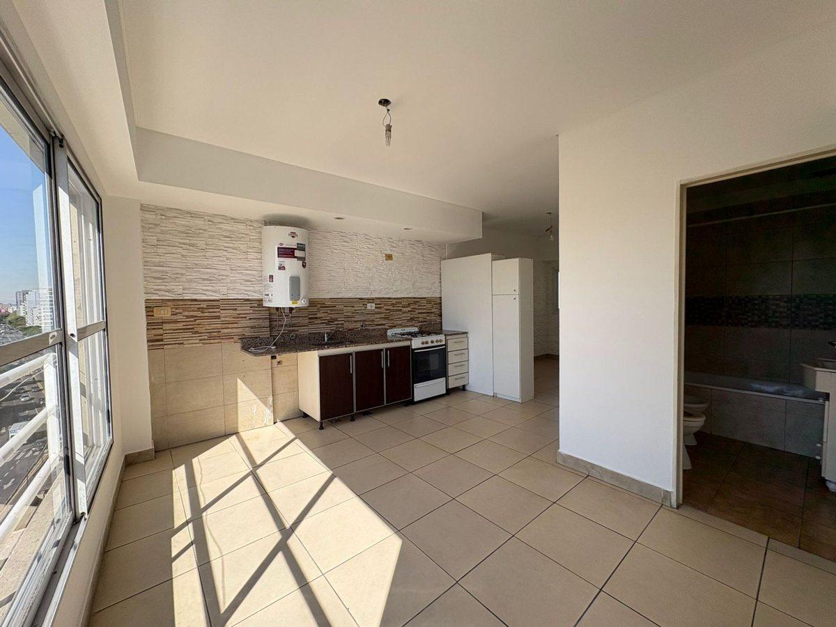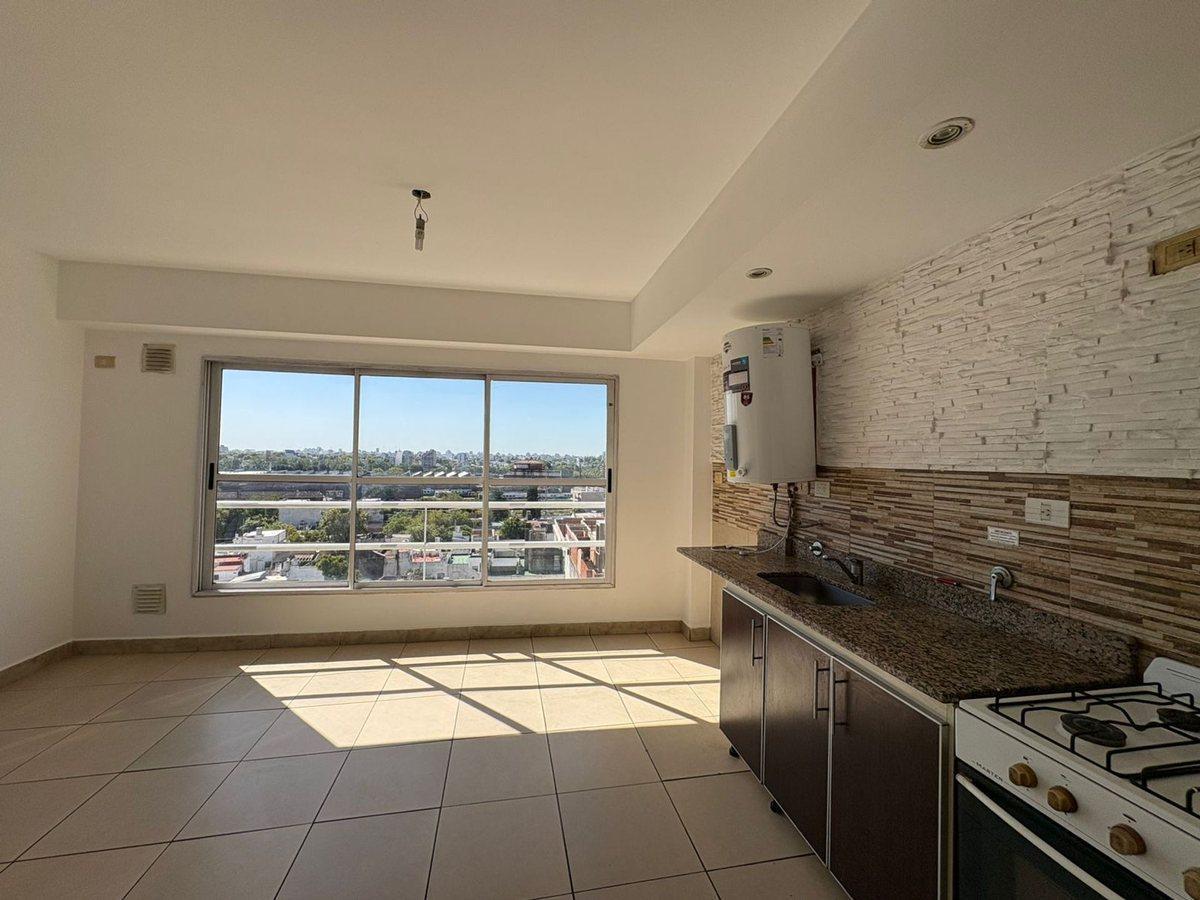 Studio apartment suitable for professional use on the 9th floor, street-facing in Liniers. The unit has an open layout that can be separated into a two-room configuration based on its L-shaped distribution. It includes a living-dining area with integrated kitchen, a separate sleeping area with room for a desk, double entrance hall space, and a bathroom with tub. The kitchen has a low-use electric water heater (termotanque) and connections for a washing machine; the apartment has gas. No balcony.