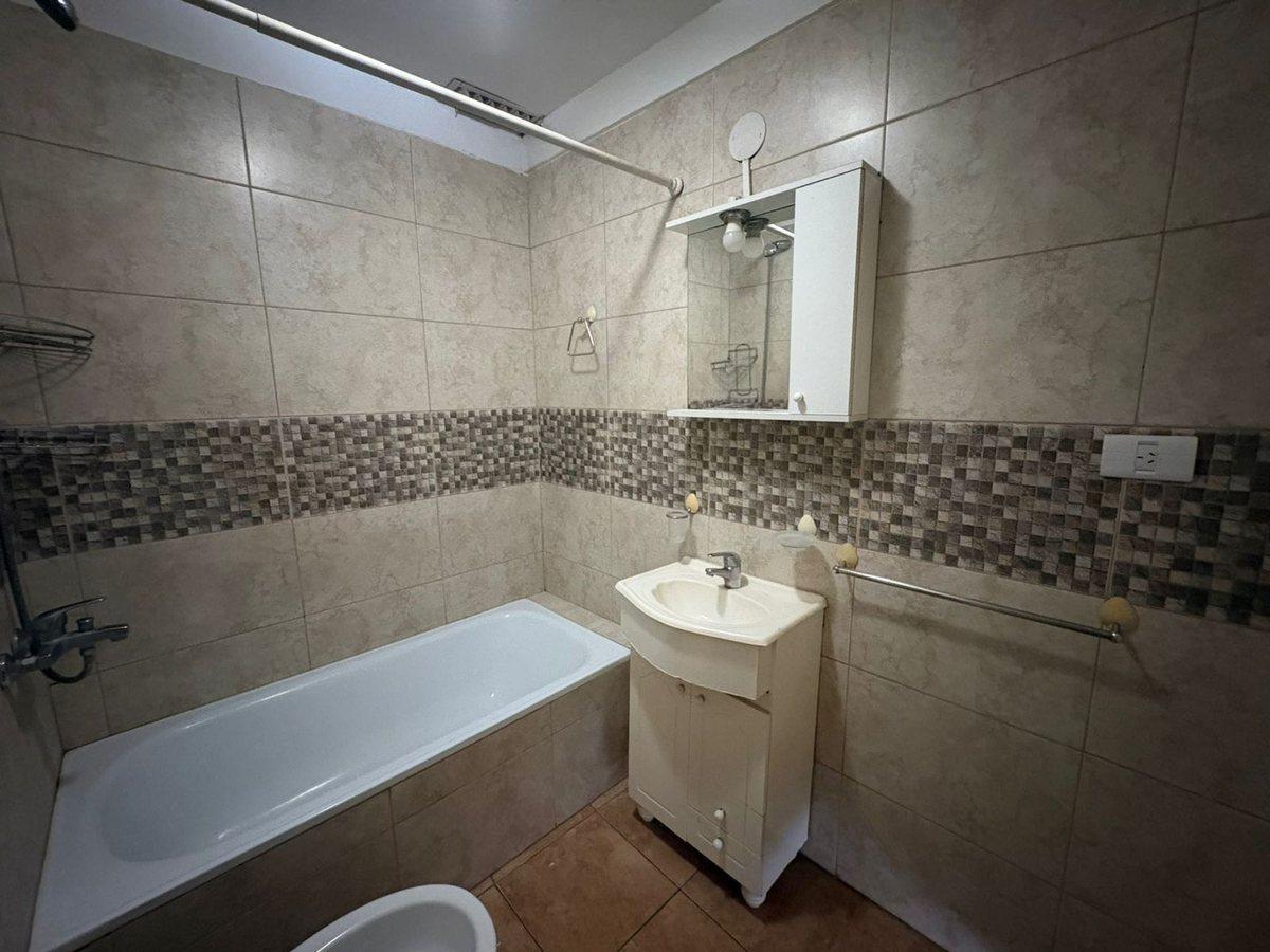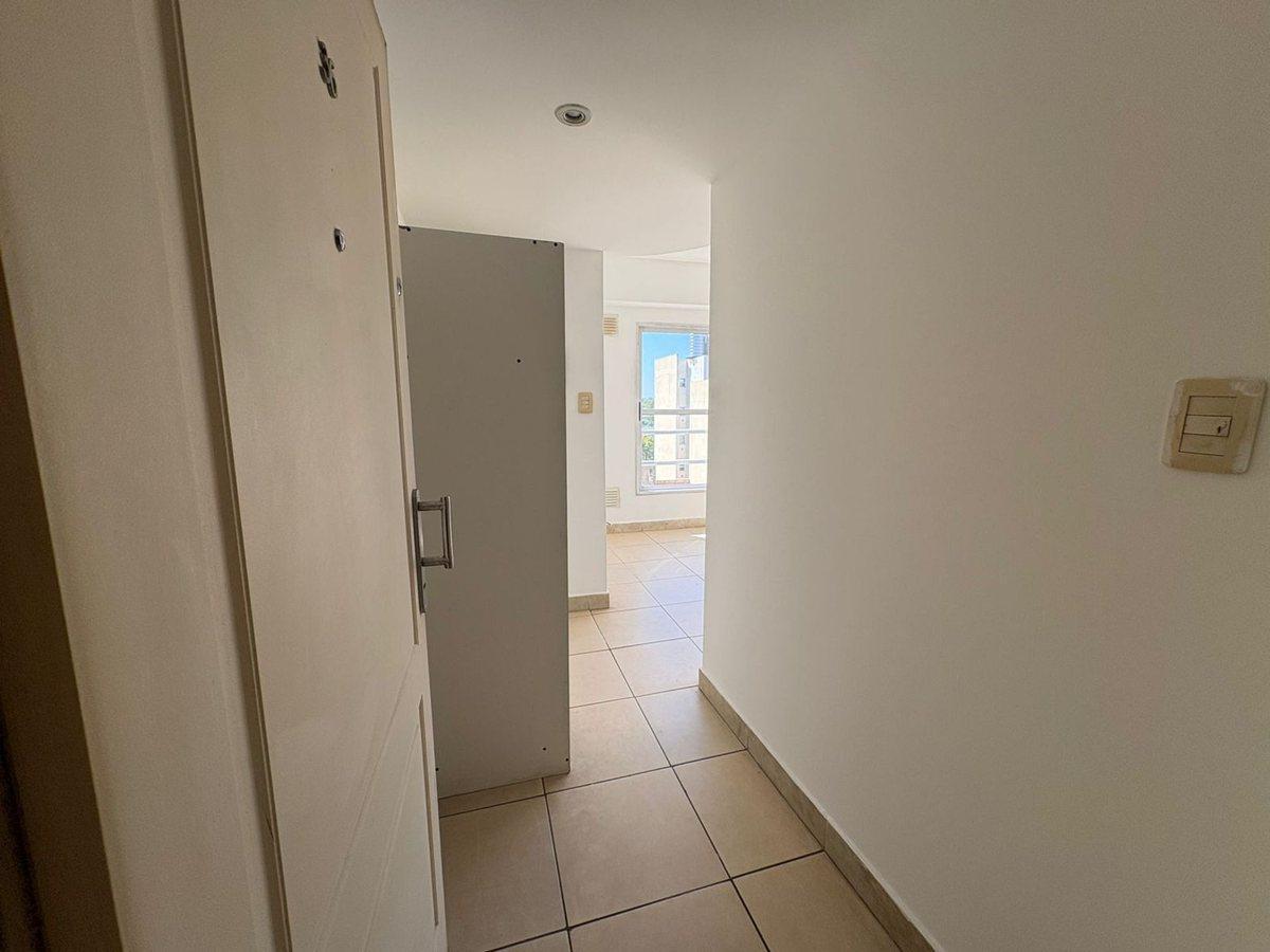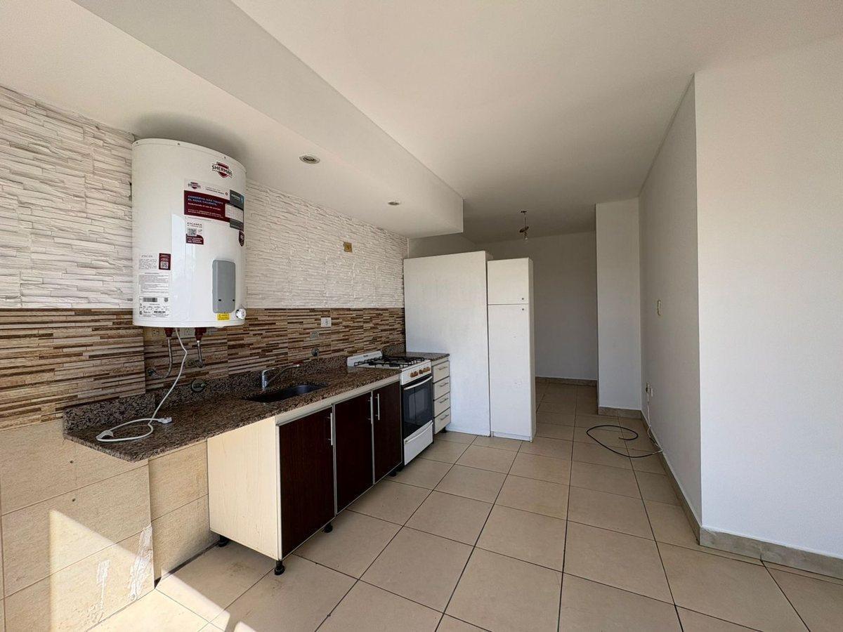 Studio apartment suitable for professional use on the 9th floor, street-facing in Liniers. The unit has an open layout that can be separated into a two-room configuration based on its L-shaped distribution. It includes a living-dining area with integrated kitchen, a separate sleeping area with room for a desk, double entrance hall space, and a bathroom with tub. The kitchen has a low-use electric water heater (termotanque) and connections for a washing machine; the apartment has gas. No balcony.