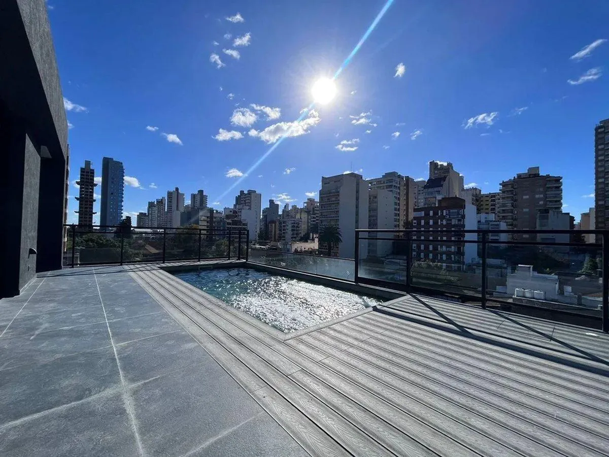 Studio apartment with a balcony facing the street in Las Lomitas, Lomas de Zamora. The unit has PVC double-glazed windows, underfloor radiant heating, and installed hot-cold air conditioning, plus a complete bathroom and a kitchenette with Johnson cabinets, an electric stove and oven. The building is hotel-style and includes a furnished reception hall, carpeted landing areas with seating, lift access, a fully equipped SUM, solarium with green space, and a pool. Rent is USD 600, with a rental gua