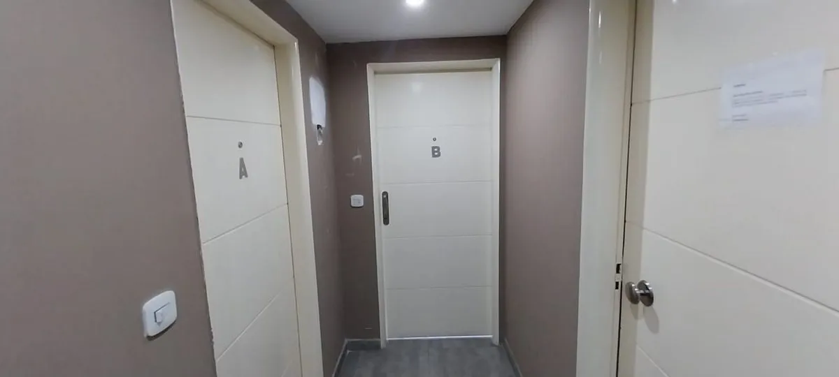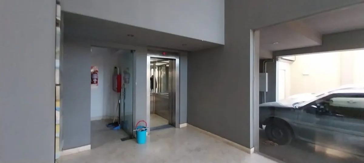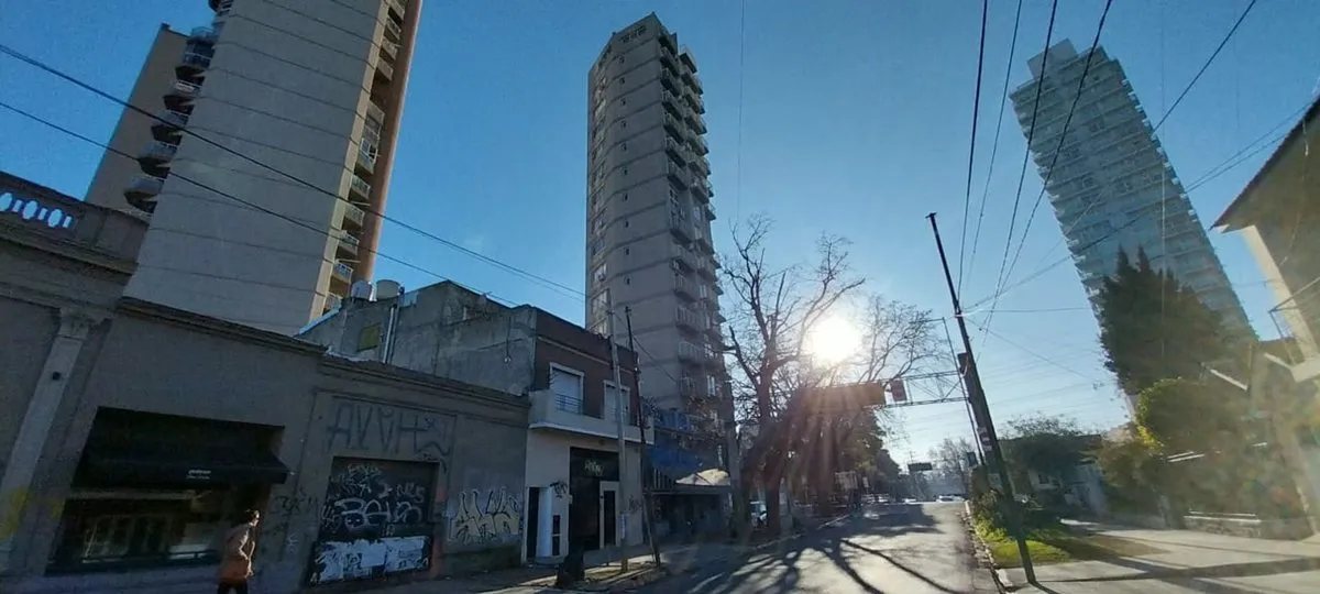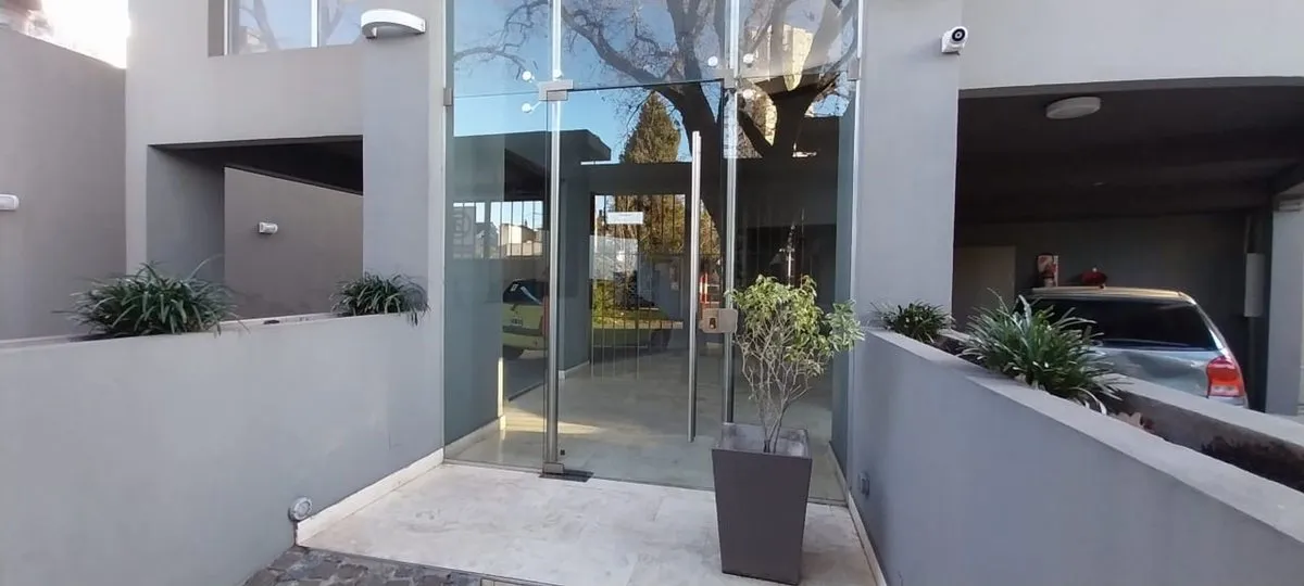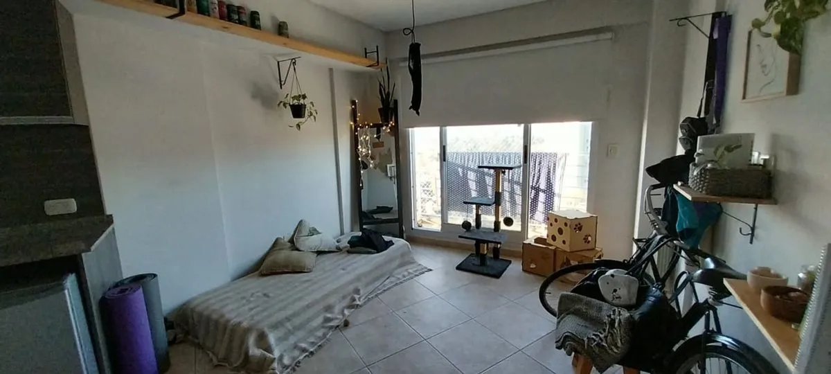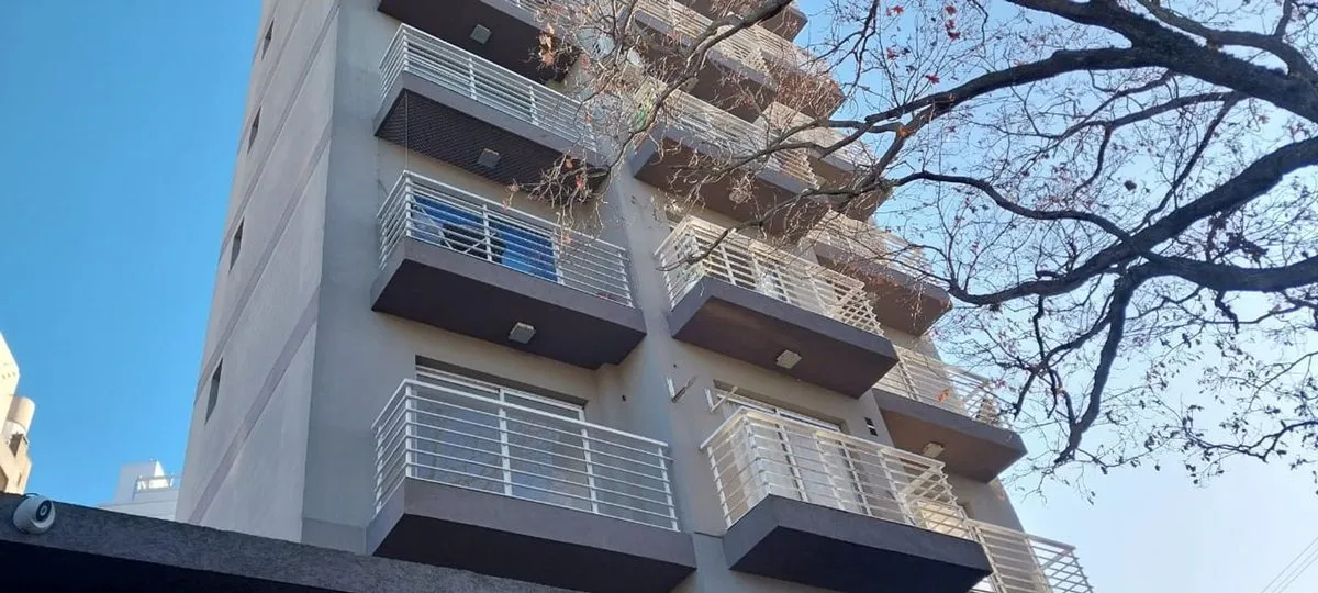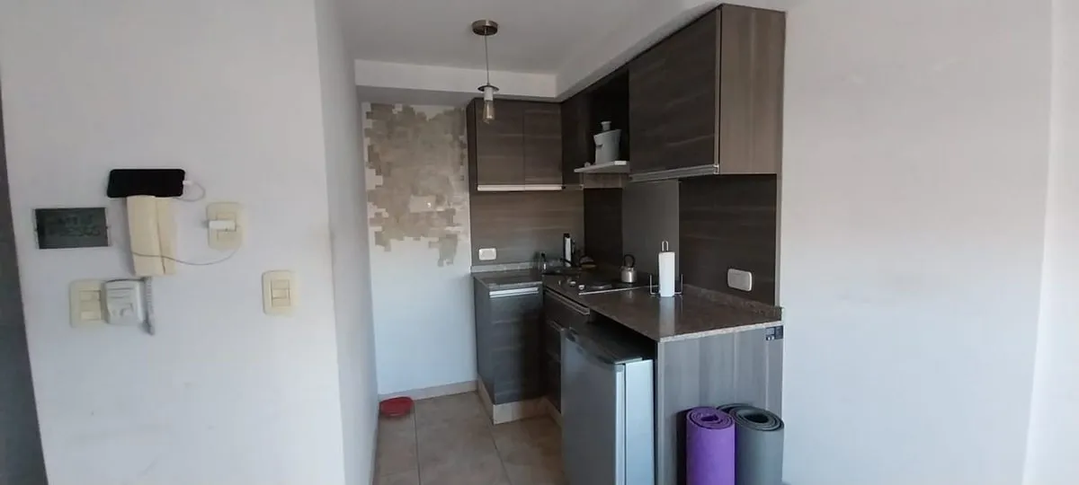 Studio apartment for rent in Lomas de Zamora, 30 m² total (27 m² covered and 3 m² semi-covered), on the 9th floor of a 14-storey building. Built in 2014, it has a single main room with a full bathroom and a balcony. The kitchenette includes fitted melamine cabinetry and a granite countertop. The full bathroom has ceramic wall finishes and a single-lever tap, and the unit has ceramic flooring and a closet with sliding doors. The building has a lift, a residents' communal room, and a double-height