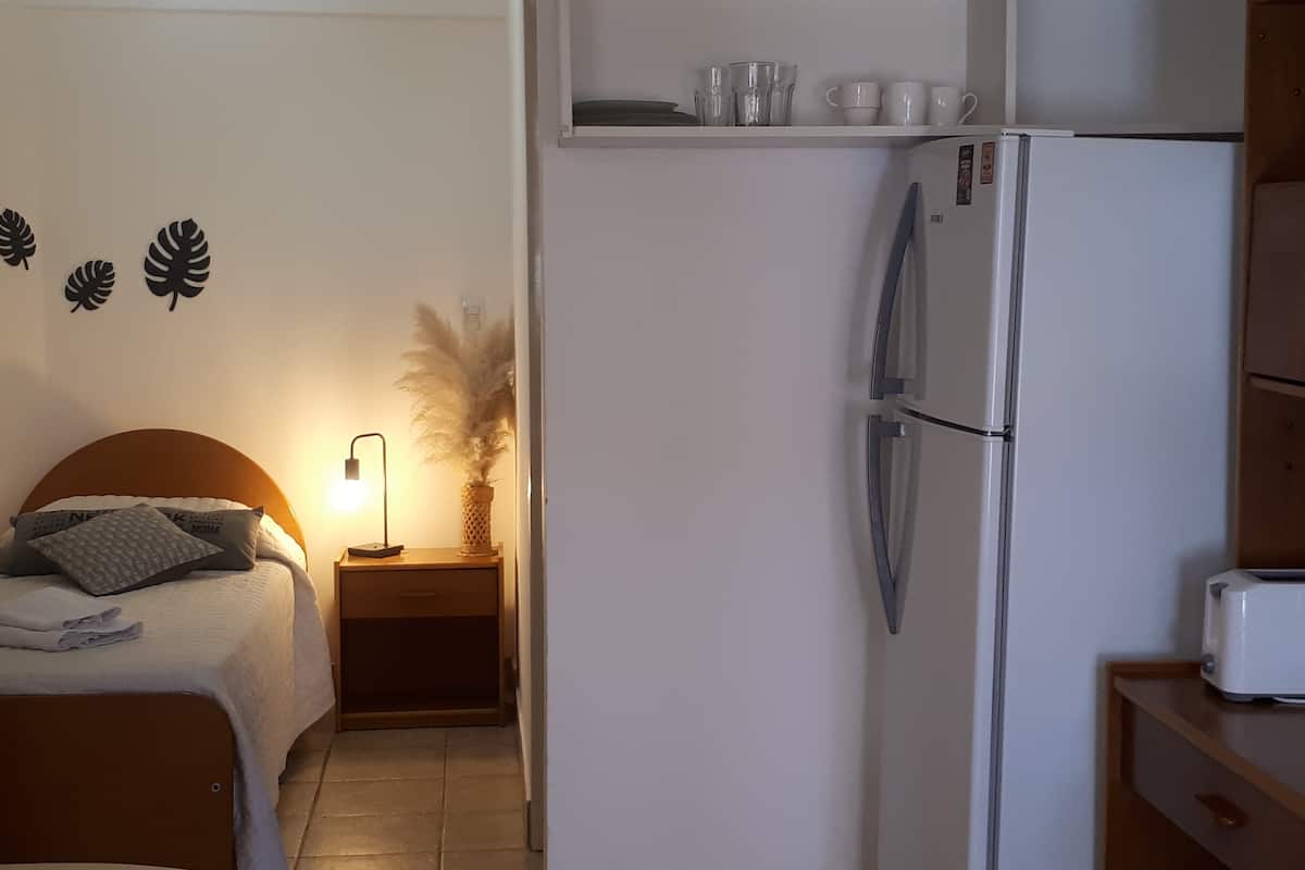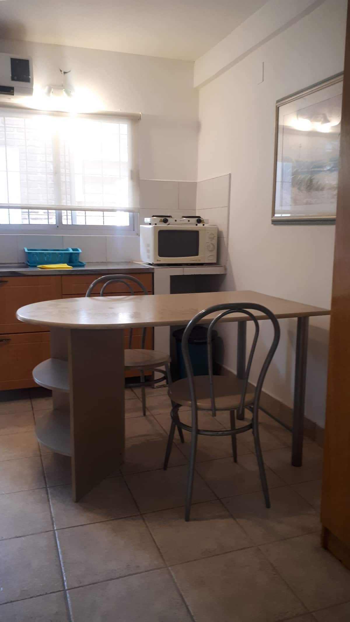 Studio apartment with private entrance in Martínez. The unit is equipped with kitchenette with stove, electric kettle, microwave and refrigerator with freezer, plus a bathroom with shower. Hot/cold air conditioning is installed. Access is via Panamericana, with bus lines nearby; the Martínez station on the Mitre line is about 20 blocks away.