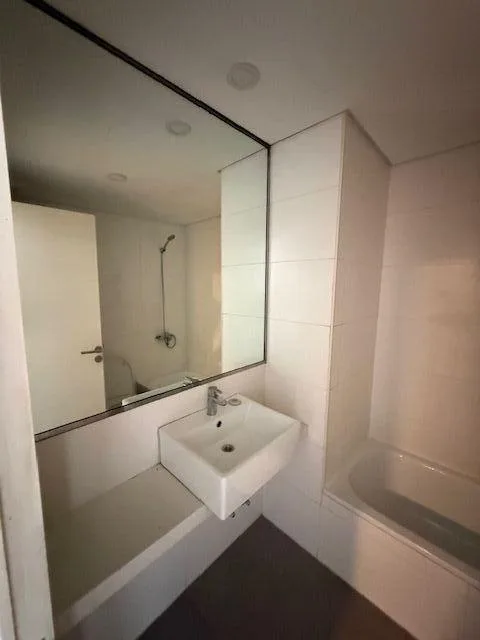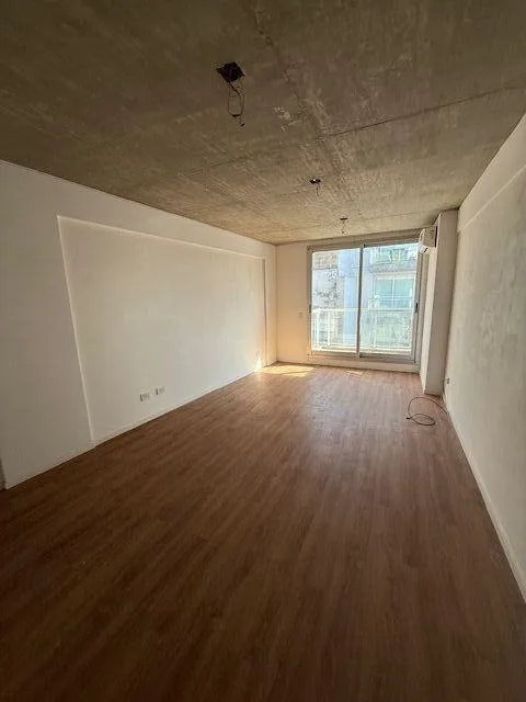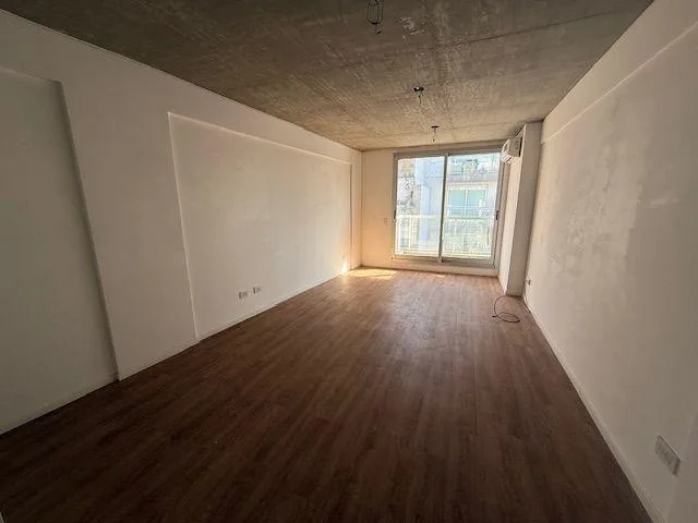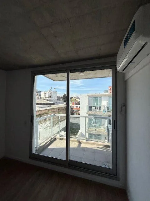 Studio apartment with a balcony on the courtyard-facing side in Monserrat, Buenos Aires. The unit has an integrated kitchen, a full bathroom, and air conditioning. The building includes a laundry area.