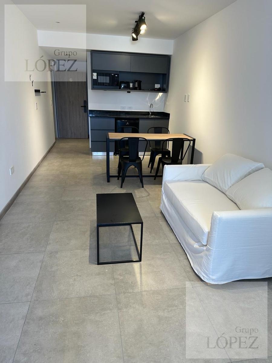 Studio apartment of an unspecified size in Monserrat, courtyard-facing (contrafrente) with a balcony. Integrated kitchen with upper and lower cabinetry, electric cooktop with vitroceramic, and an oven with grill by Samsung. Hot/cold air conditioning (4,500 W) and a full bathroom with shower; building fees include AYSA, ABL and Edenor for common areas, while expensas and other costs are charged to the tenant. A rental guarantee bond equivalent to two months is paid with the bond to be returned up