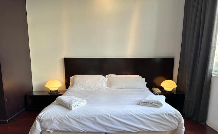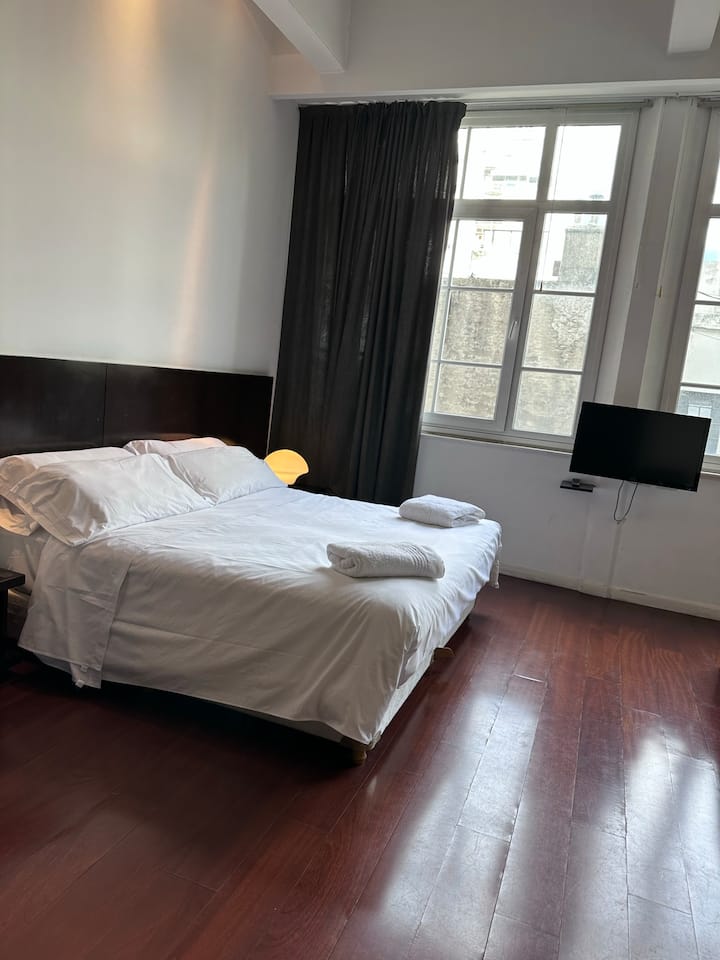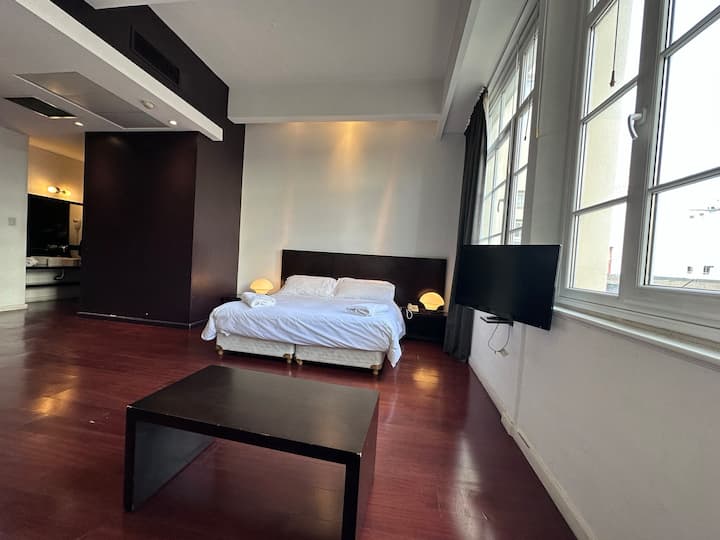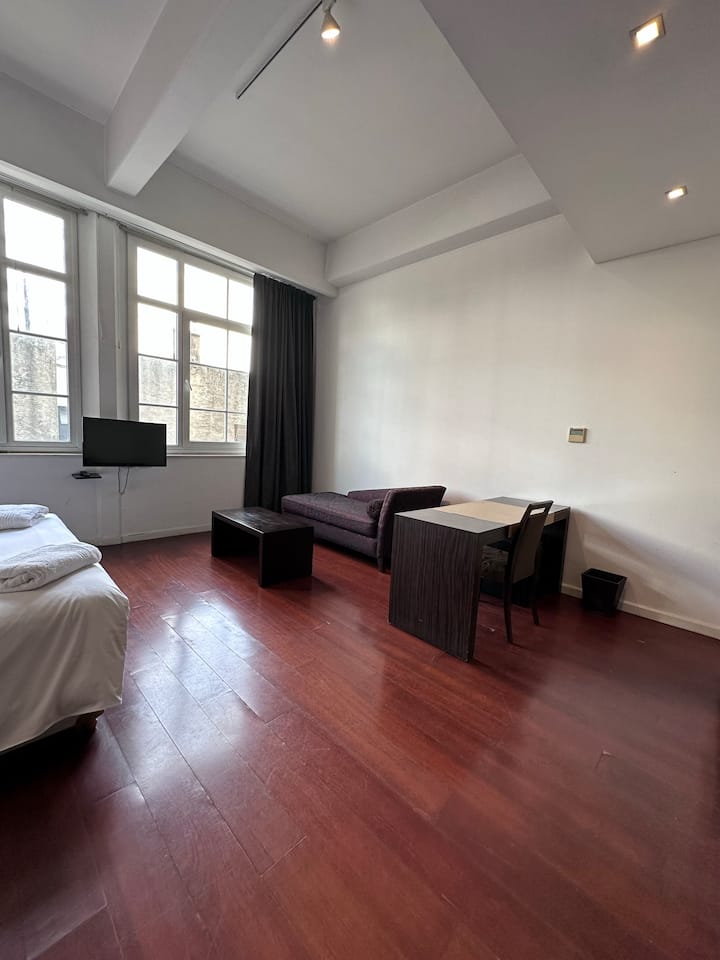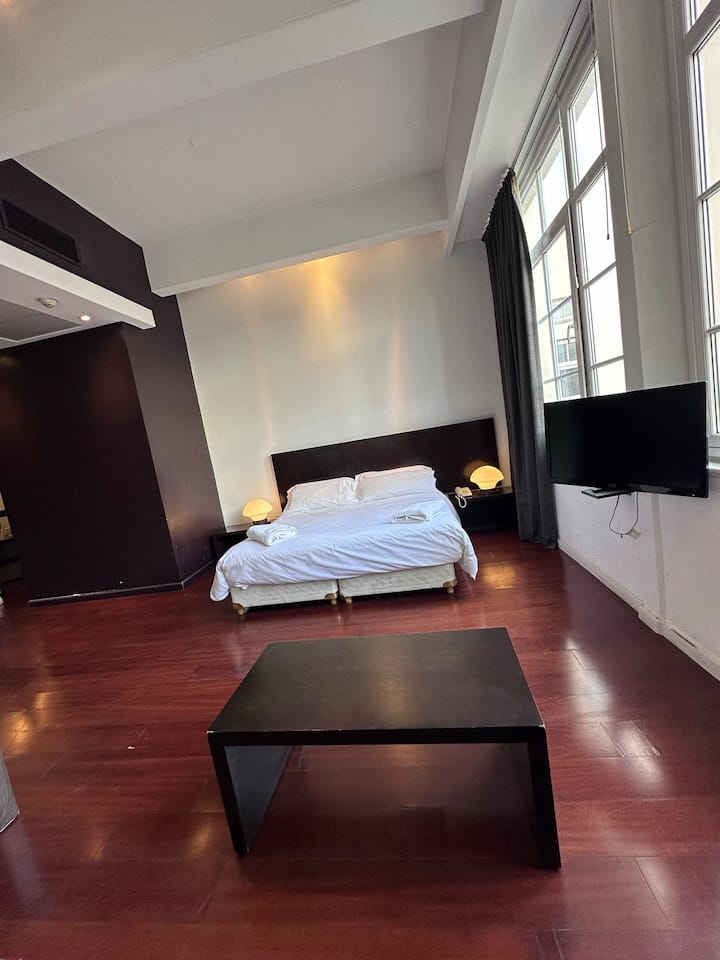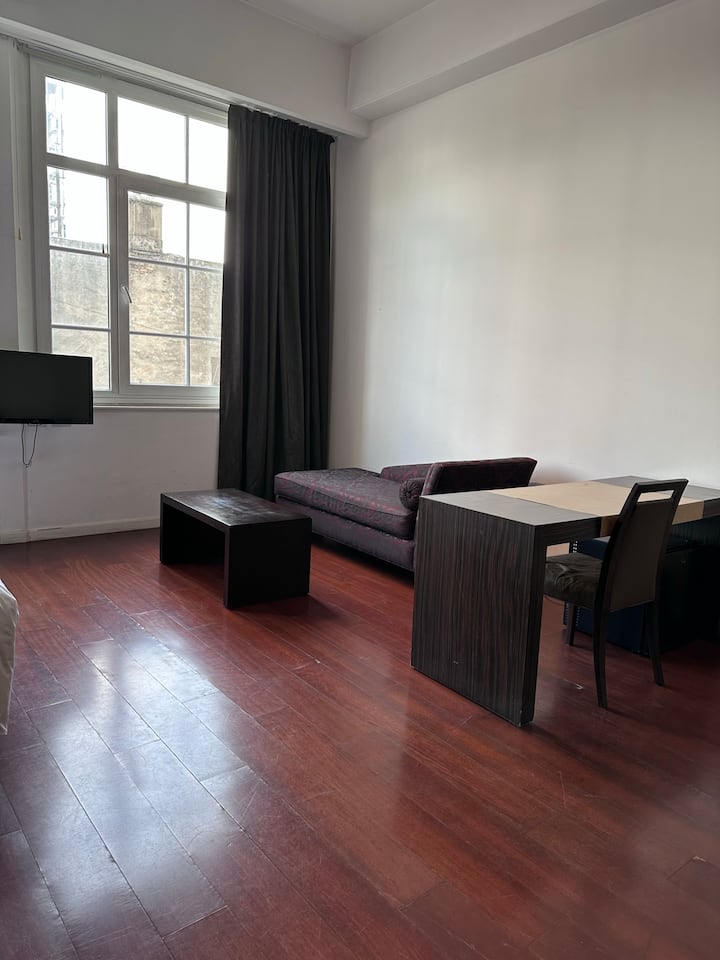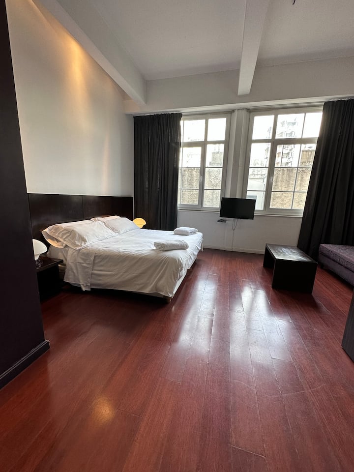 Loft apartment in a historic City of Buenos Aires heritage building, the former Hotel Moreno. The unit has 44 m² and fits up to 2 people with a double bed. The building is two blocks from Plaza de Mayo/Casa Rosada and half a block from Calle Defensa, where the Feria de San Telmo is held on Sundays. Entry to the building is via a mobile app, which requires sufficient phone battery for access.