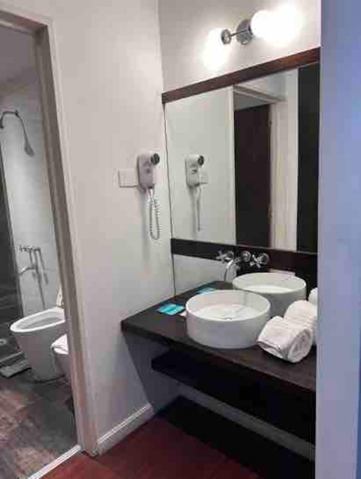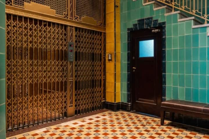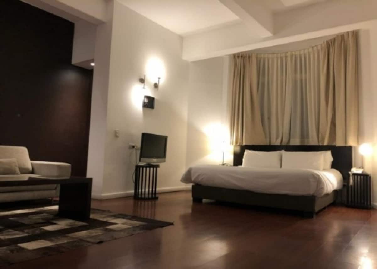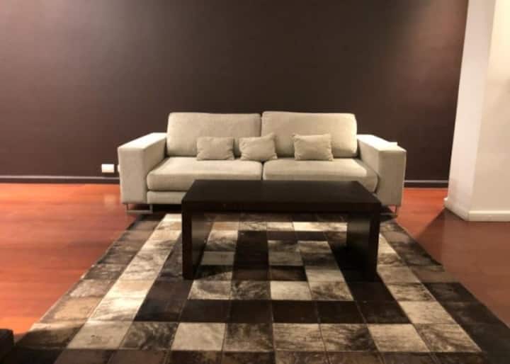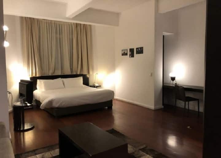 Studio loft on the top floor of a historic building in Buenos Aires, known as Hotel Moreno from 2007 to 2018. The unit has a swimming and dressing area, a full bathroom with bidet and shower with natural light, and a microwave-equipped kitchen with basic cooking utensils for simple meals. There is a desk area and a living area with a two-way sofa and coffee table, plus a 2.00 x 2.00 x 0.35-m mattress, two nightstands, and a TV that can be oriented toward the living area. Access to the building i