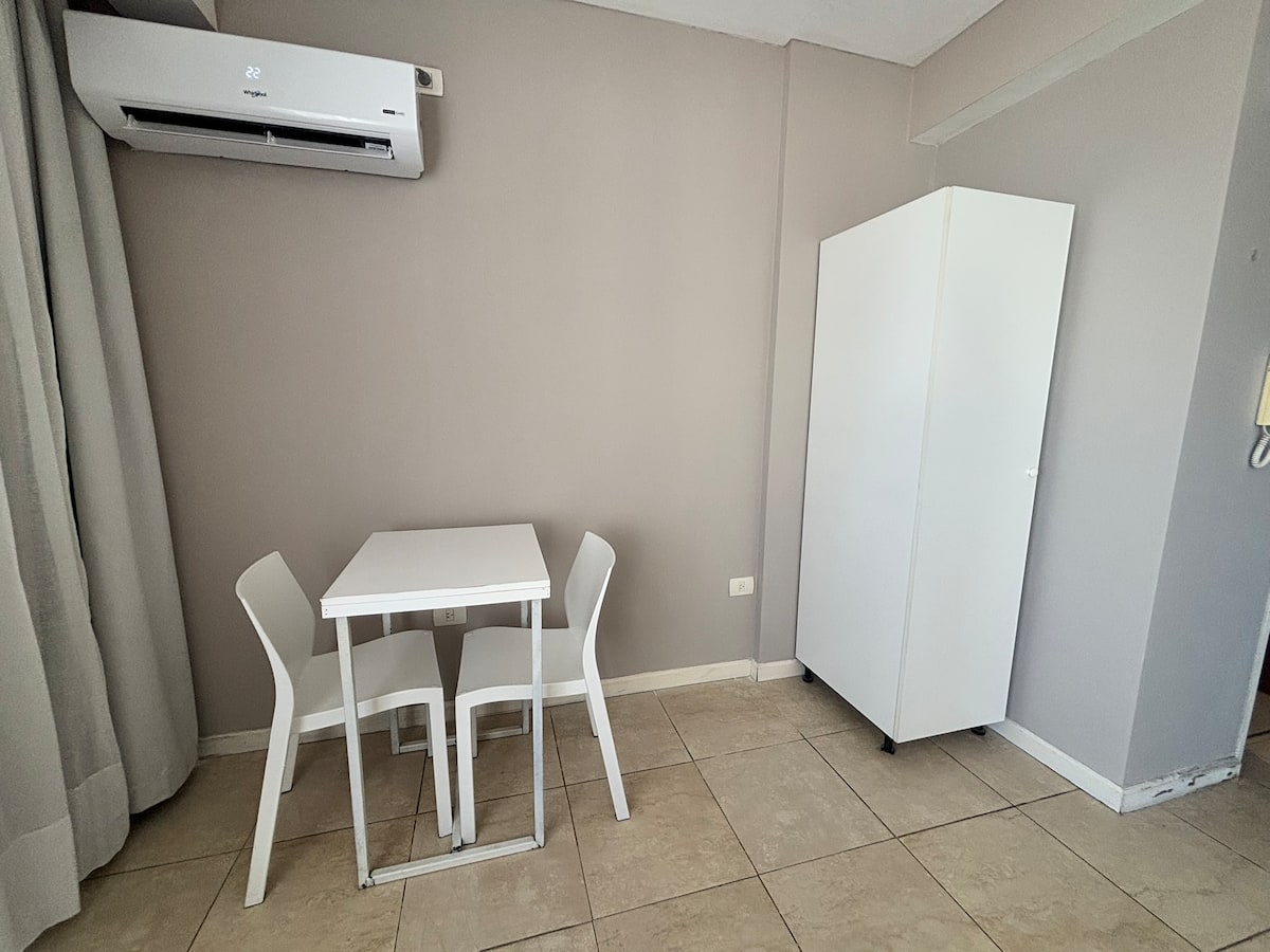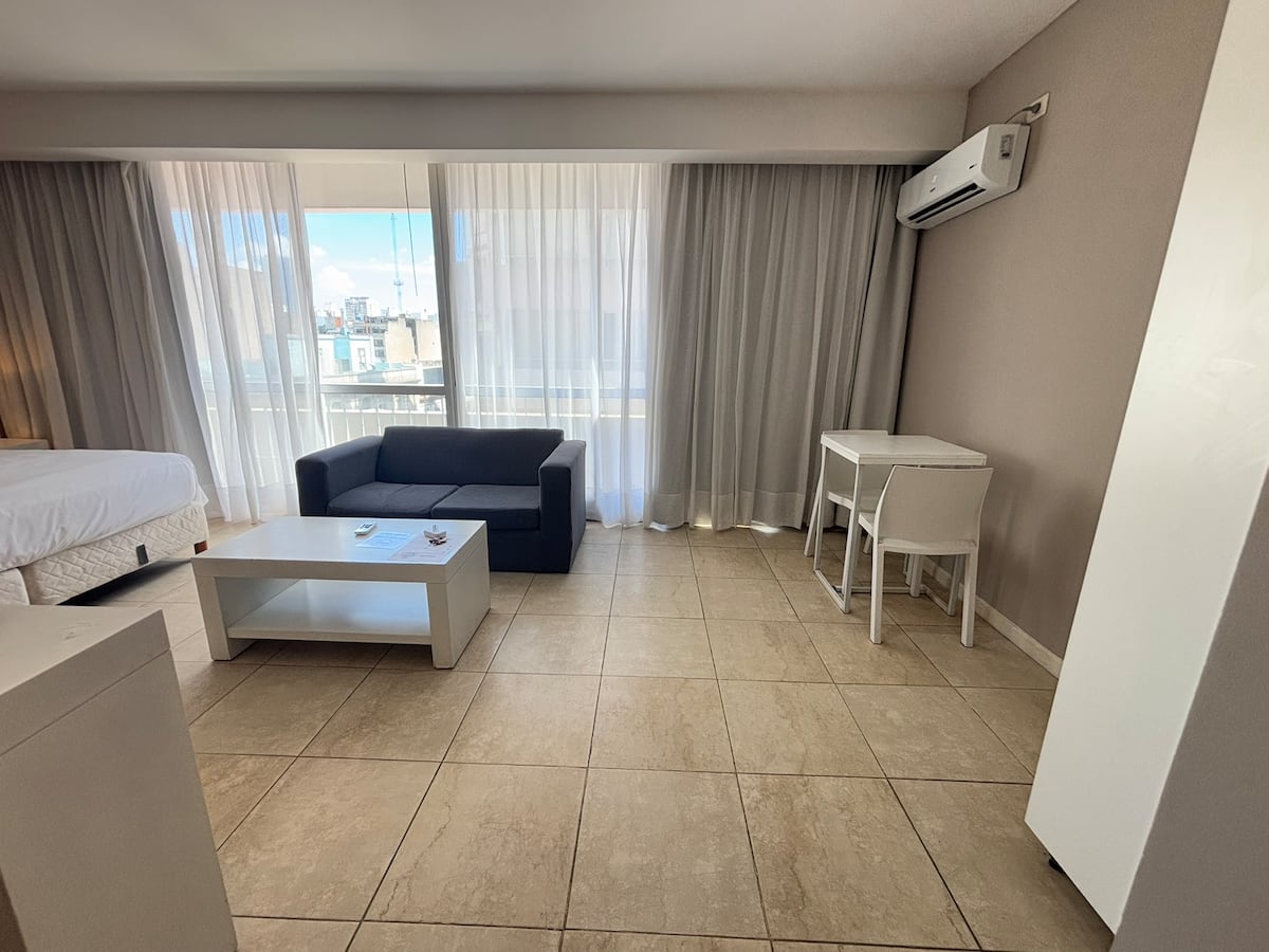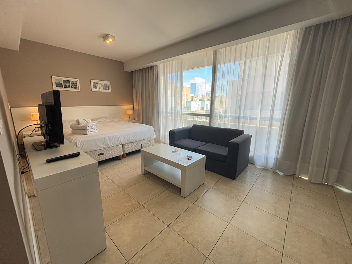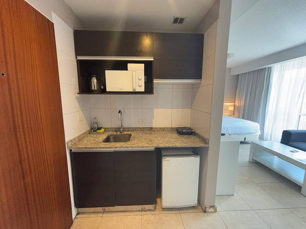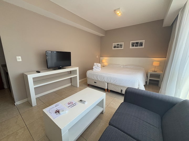Studio apartment with a queen-size bed for two people. Full bathroom and kitchenette with minibar and electric anafe. Cold/heat air conditioning, 32-inch LED TV, and WiFi.