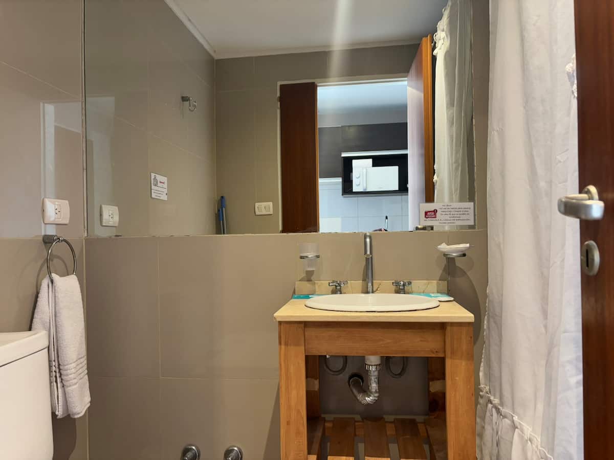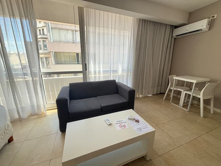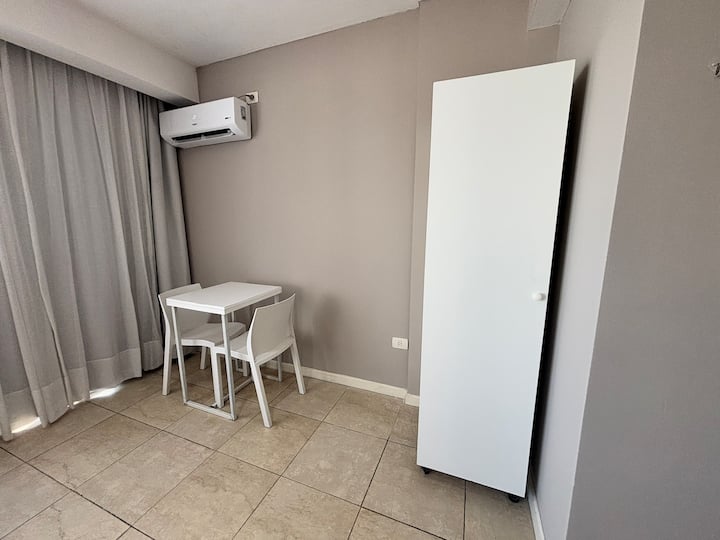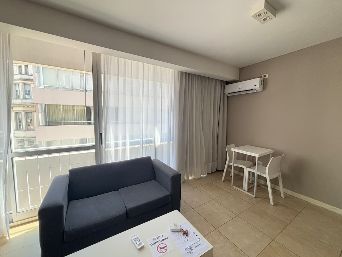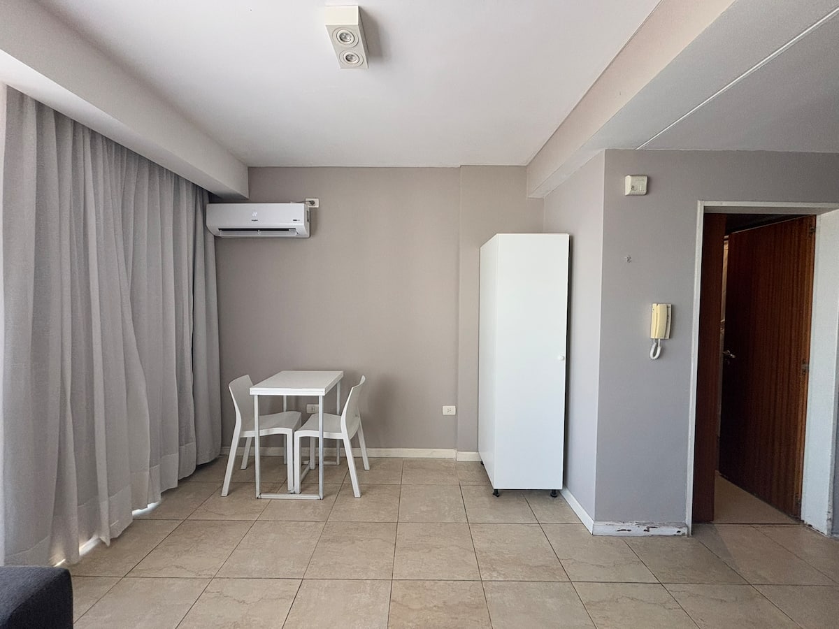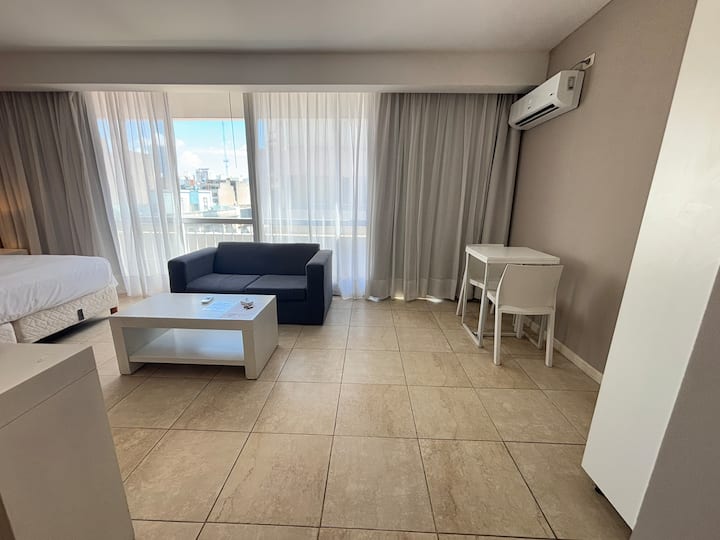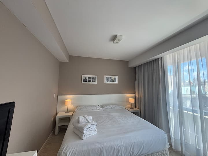 Studio apartment with a queen-size bed for two people. Full bathroom and kitchenette with minibar and electric anafe. Cold/heat air conditioning, 32-inch LED TV, and WiFi.