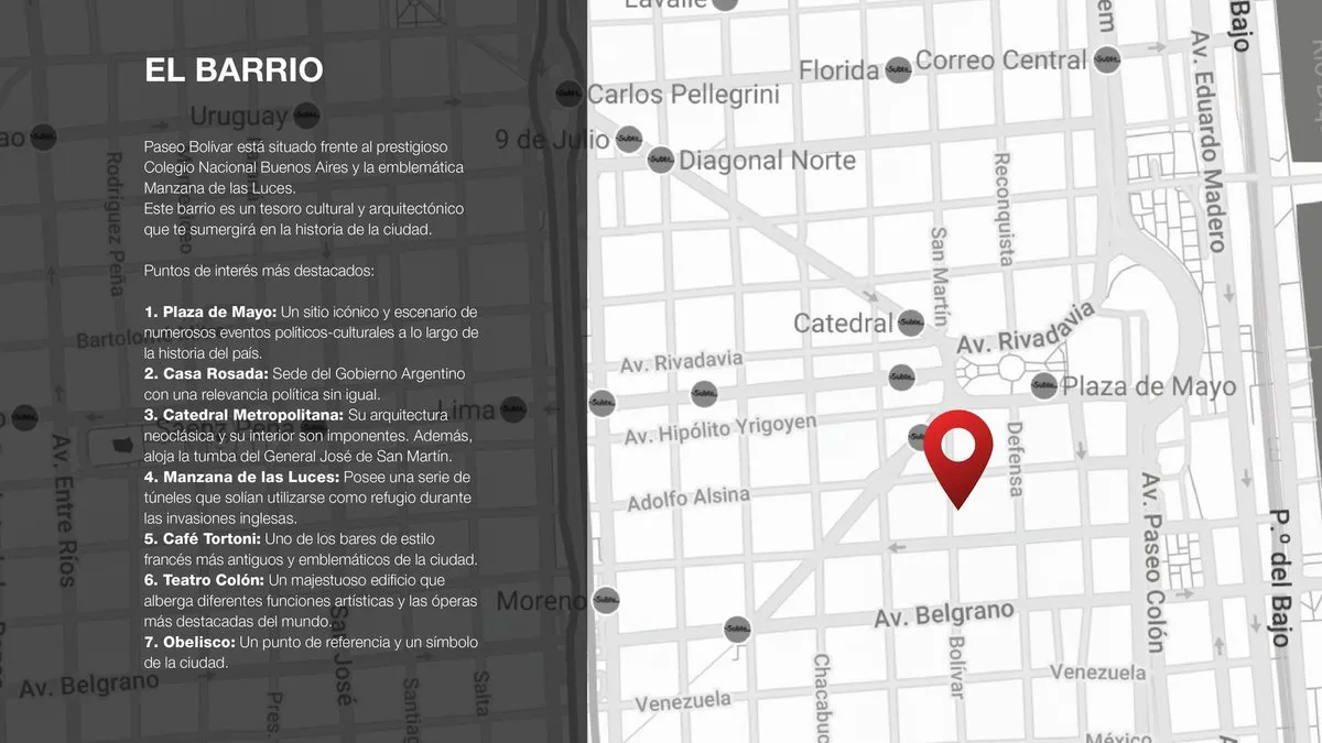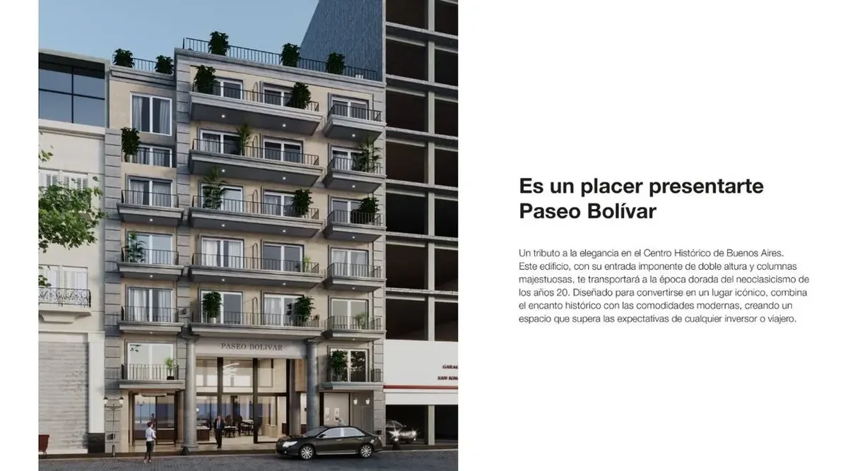 New studio apartment in a category building in Monserrat’s historic centre. Located a short distance from Plaza de Mayo, Cabildo, Casa de Gobierno, Catedral and Manzana de las Luces, with multiple public-transport options nearby. The building has 24-hour security and concierge service, a swimming pool, SUM, coworking space, laundry, a bar and roof terraces accessible to residents.