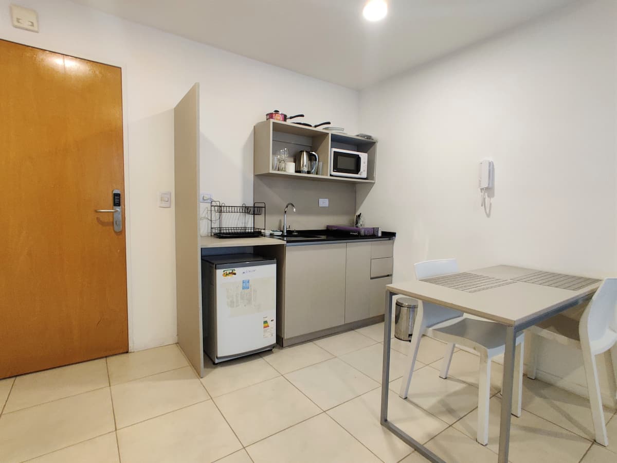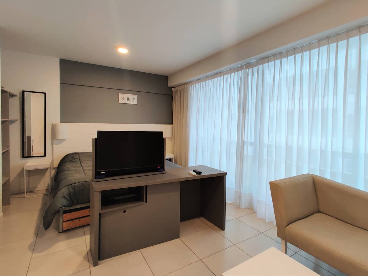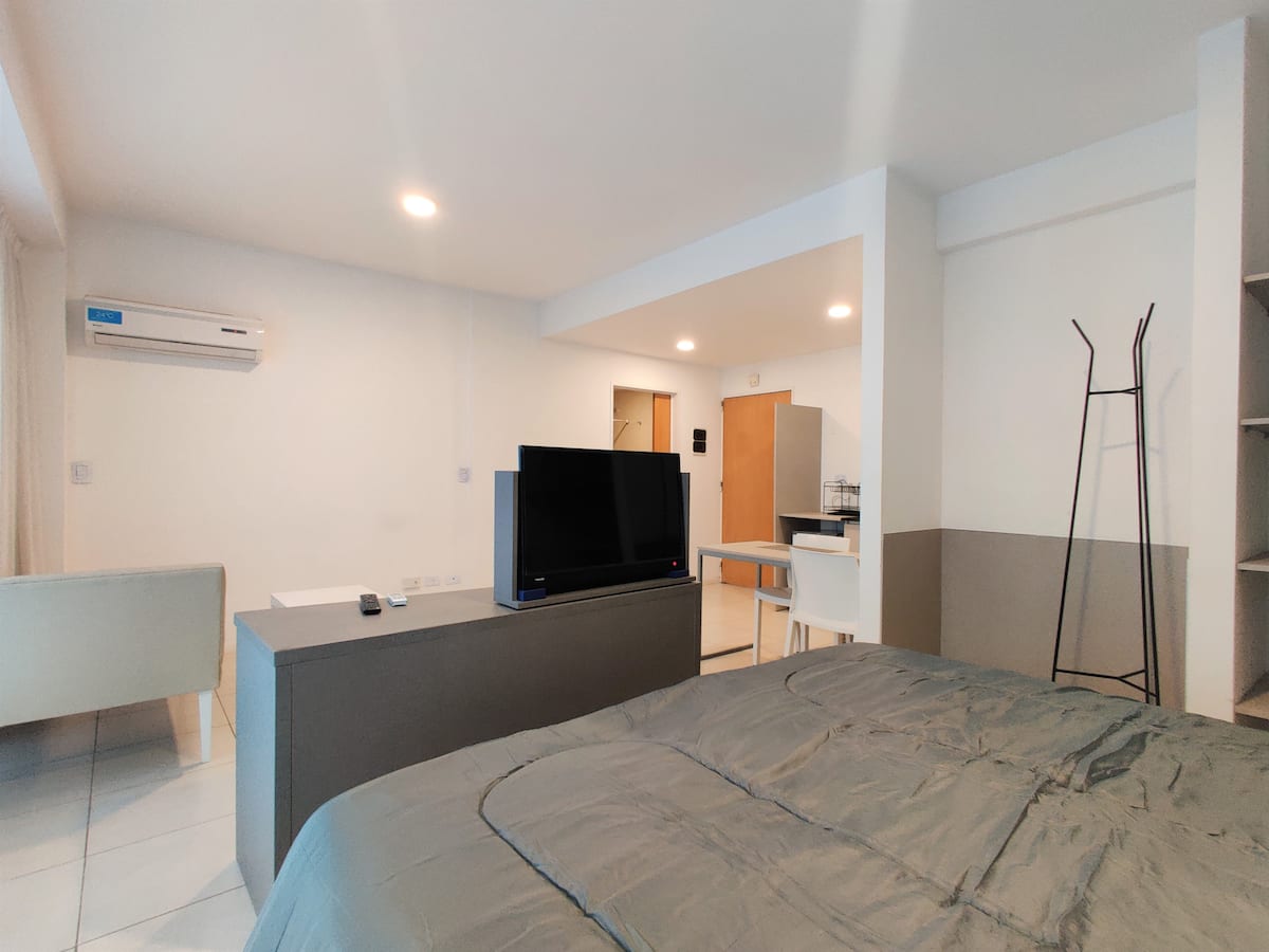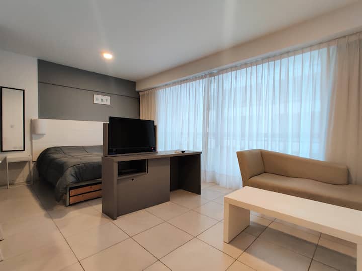 Fully equipped studio apartment in Monserrat, in a modern building. It has a kitchenette with appliances, a private bathroom with a bath, a queen bed, an LED TV and air conditioning. The building includes a pool and has a doorman and security, with bedding and towels included.