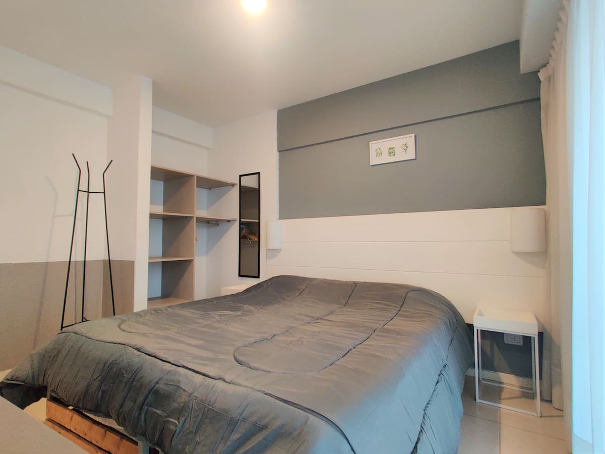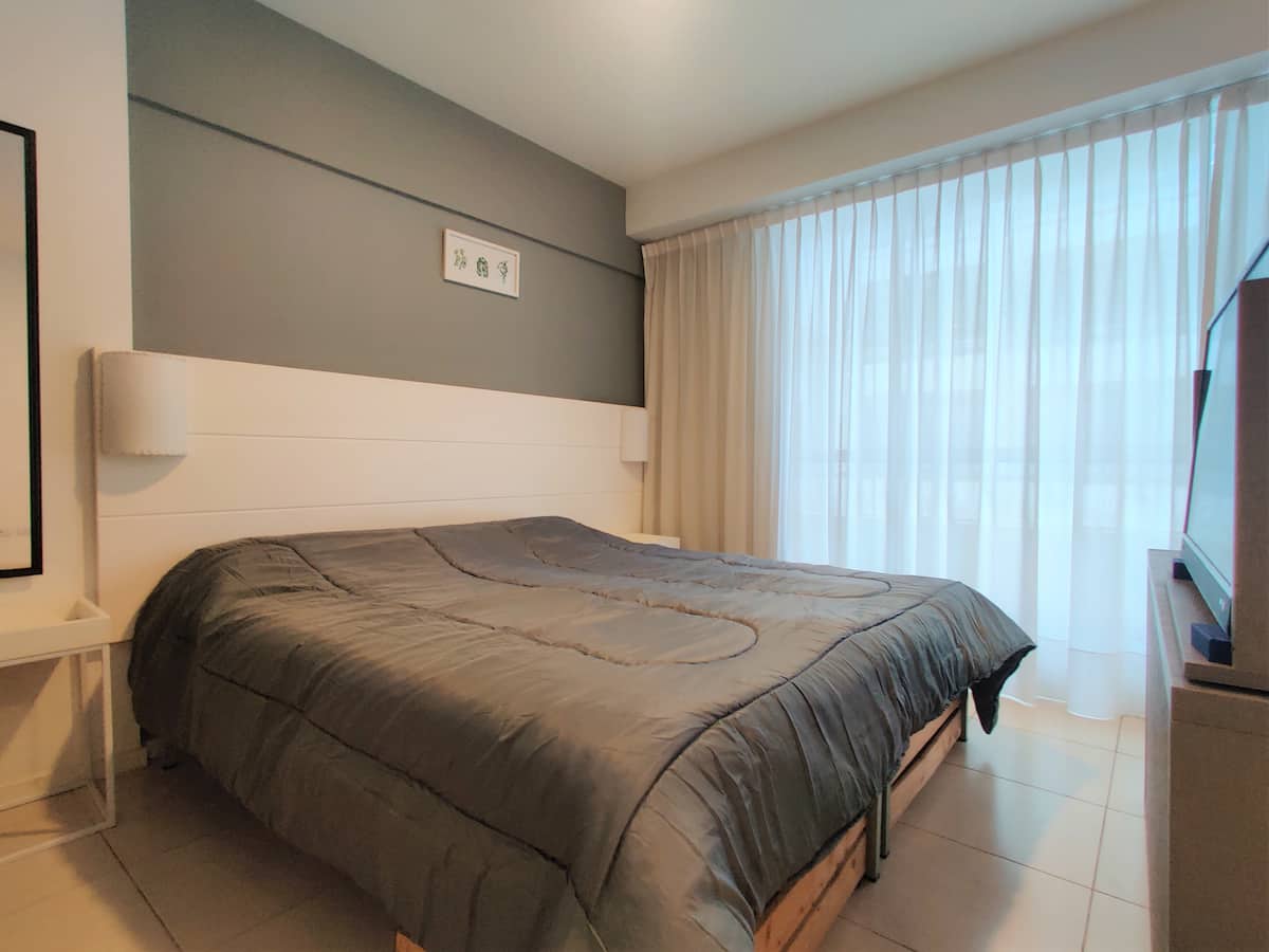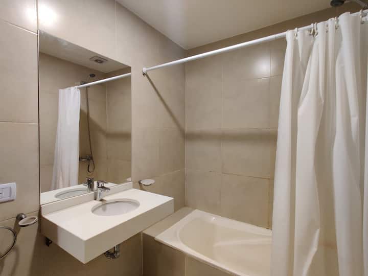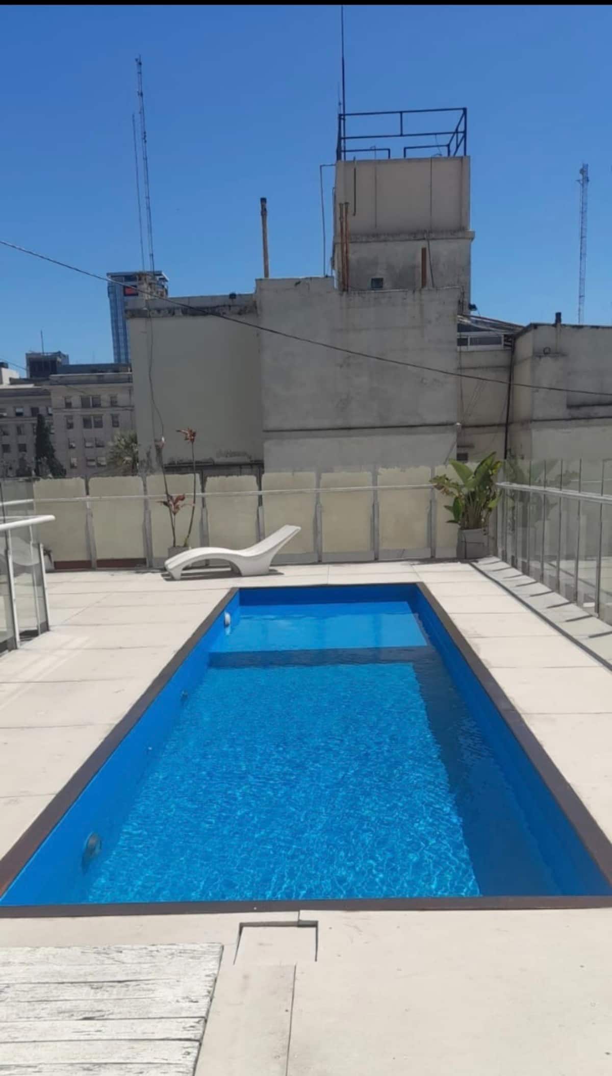 Fully equipped studio apartment in Monserrat, in a modern building. It has a kitchenette with appliances, a private bathroom with a bath, a queen bed, an LED TV and air conditioning. The building includes a pool and has a doorman and security, with bedding and towels included.