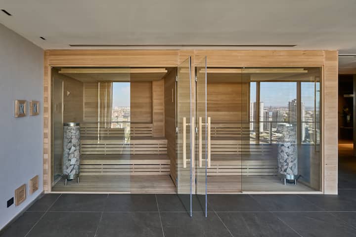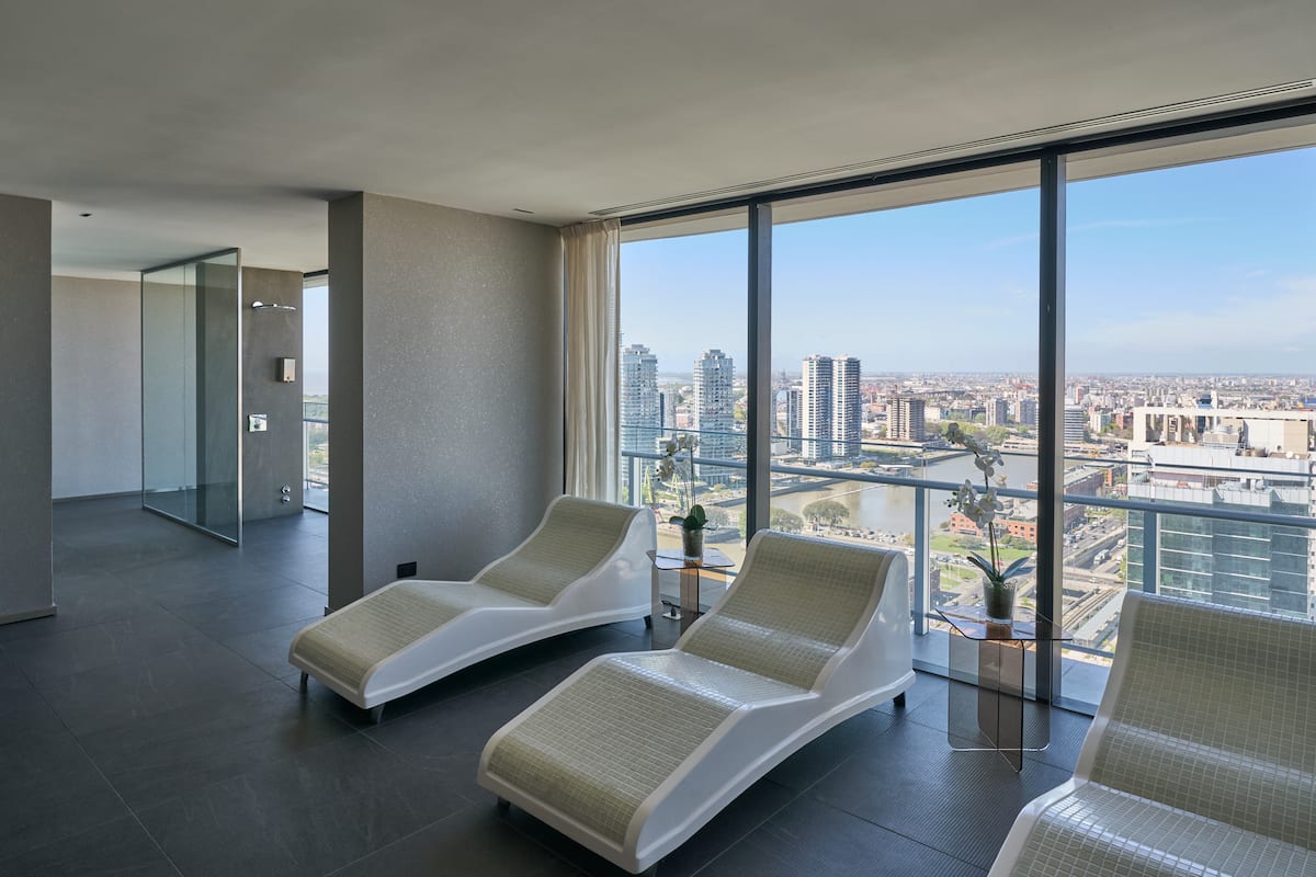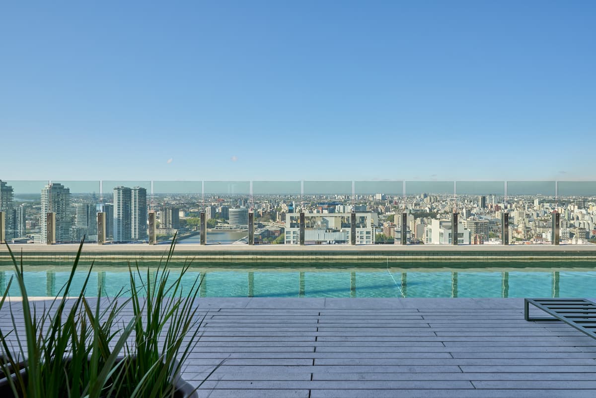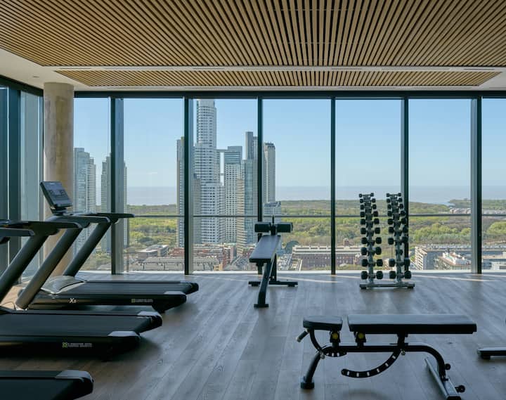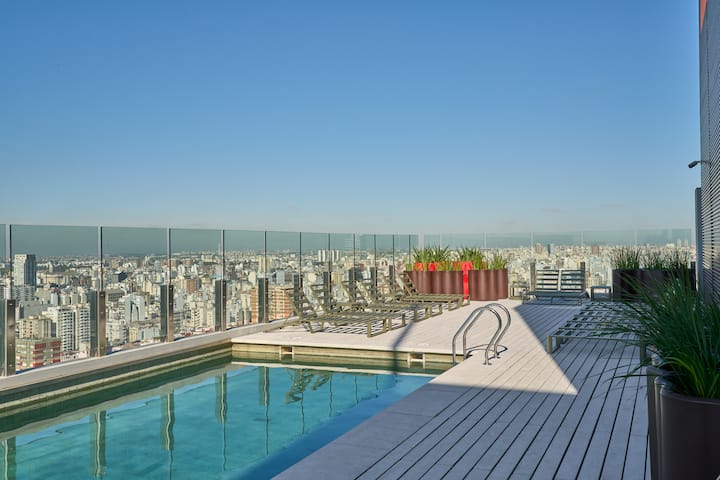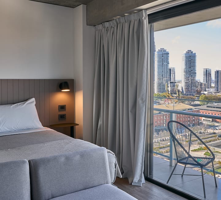 Brand-new studio apartment with a private balcony and panoramic views of the river and the city skyline. The kitchen is fully equipped with modern appliances; the bathroom is complete. The building has 24-hour security, an outdoor pool, jacuzzi, a sauna and a fully equipped gym; the indoor pool/jacuzzi is out of service until further notice.