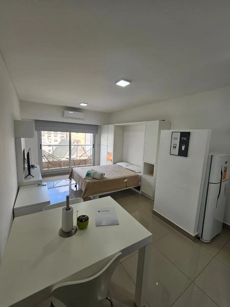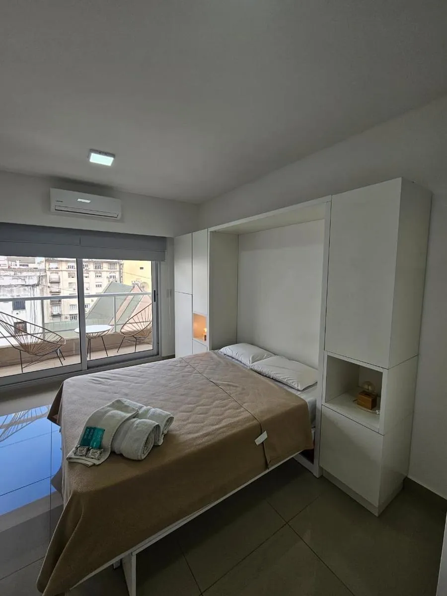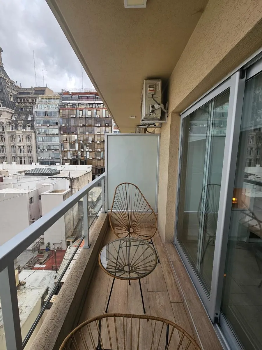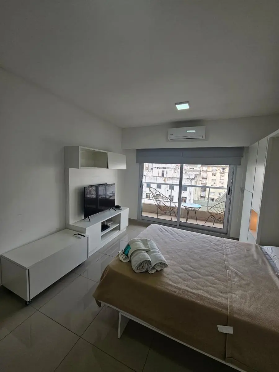 Studio apartment with 1 room, unit 708 on the side and courtyard-facing (contrafrente). Includes a double bed area, full bathroom, fitted wardrobe, equipped kitchen with a fridge with freezer, and a balcony. Hot-cold air conditioning. Building amenities include 24-hour security, a climate-controlled pool, coworking, meeting room, rooftop terrace, laundry and an in-building restaurant. Rent is USD 850 plus electricity and internet; subte: Línea E station Bolívar two blocks away and Línea A statio