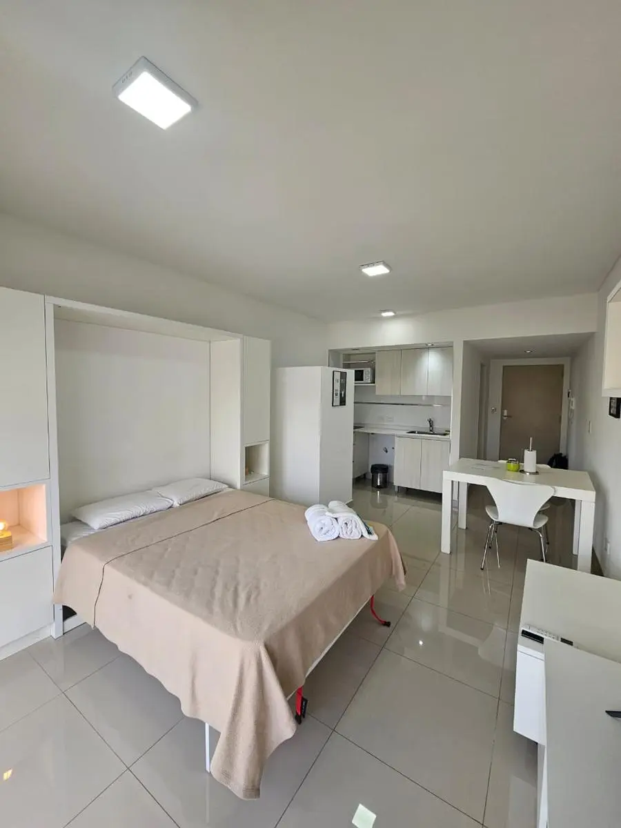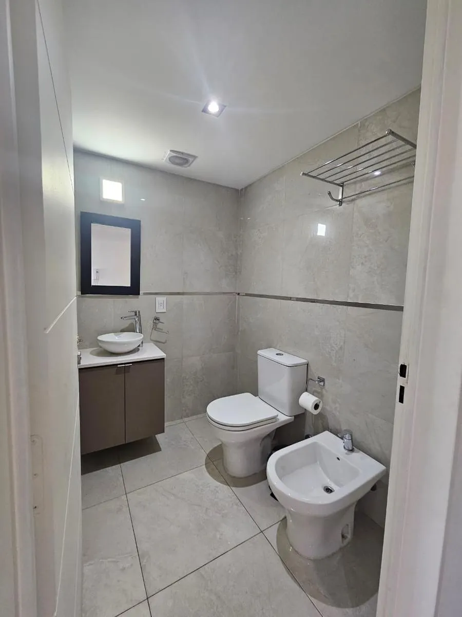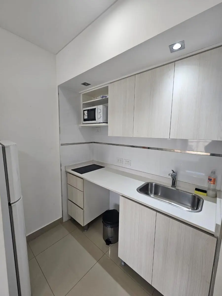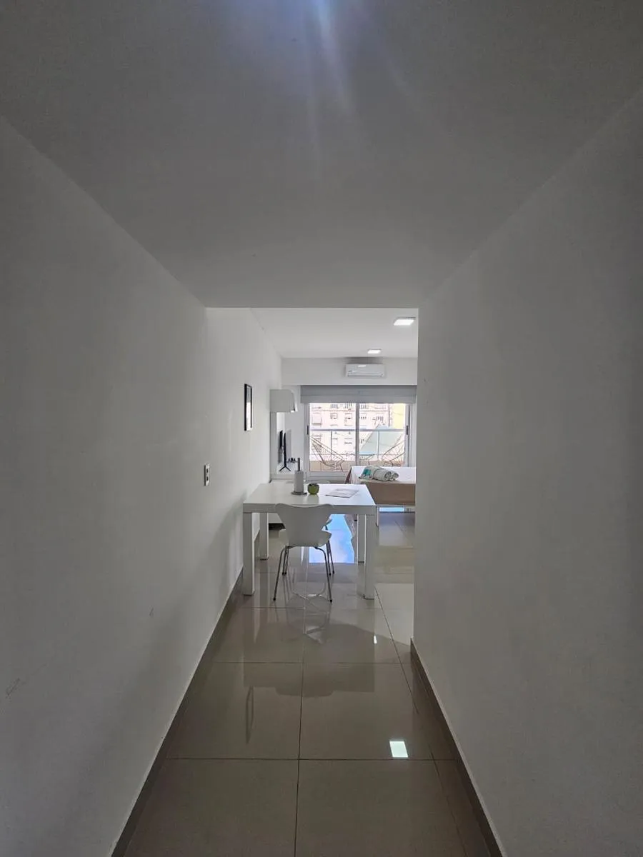 Studio apartment with 1 room, unit 708 on the side and courtyard-facing (contrafrente). Includes a double bed area, full bathroom, fitted wardrobe, equipped kitchen with a fridge with freezer, and a balcony. Hot-cold air conditioning. Building amenities include 24-hour security, a climate-controlled pool, coworking, meeting room, rooftop terrace, laundry and an in-building restaurant. Rent is USD 850 plus electricity and internet; subte: Línea E station Bolívar two blocks away and Línea A statio