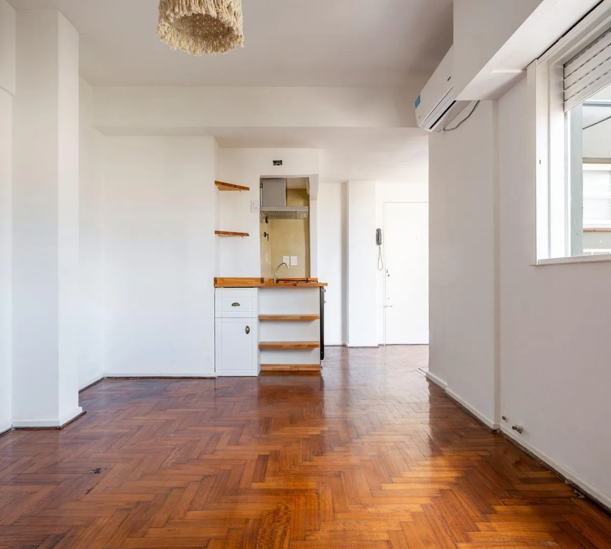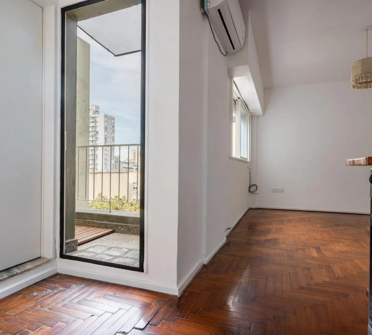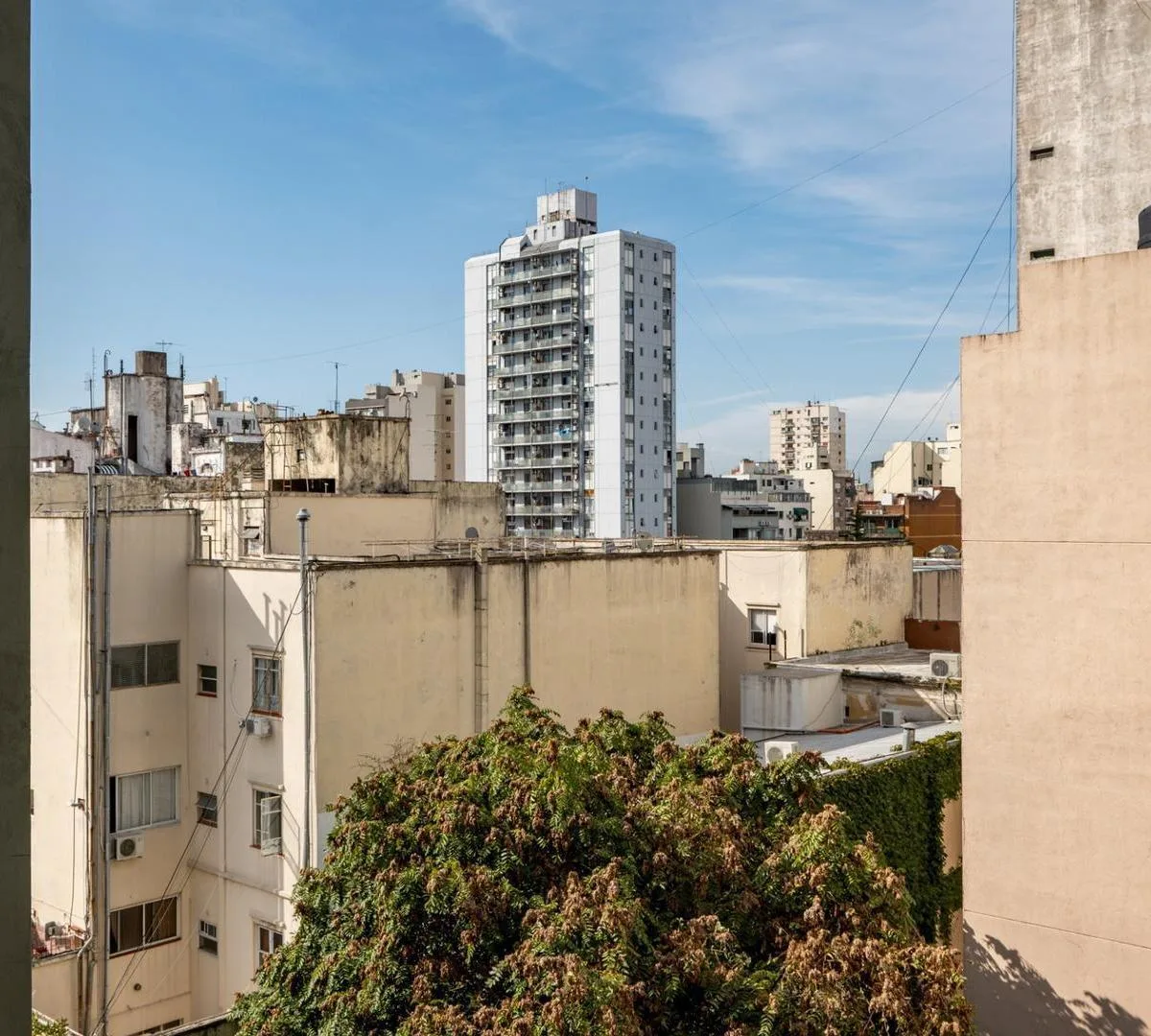 Studio apartment in Monserrat with a terrace balcony, on the 7th floor lateral unit with open views. Living-dining area and bedroom have laminated wood floors. Integrated gas kitchen with extractor hood, electric water heater, and a large storage closet; bathroom has natural ventilation. The unit includes hot/cold air conditioning and cross-ventilation. Building has 2 elevators. Rental terms: quarterly rent adjustment by IPC, accepted rental guarantee is Seguro de Caución only, 1 month security