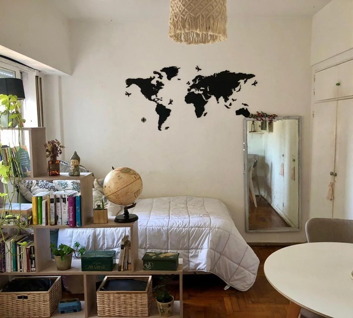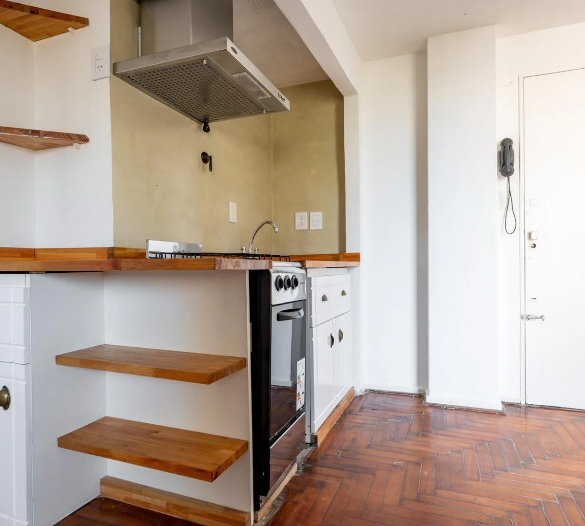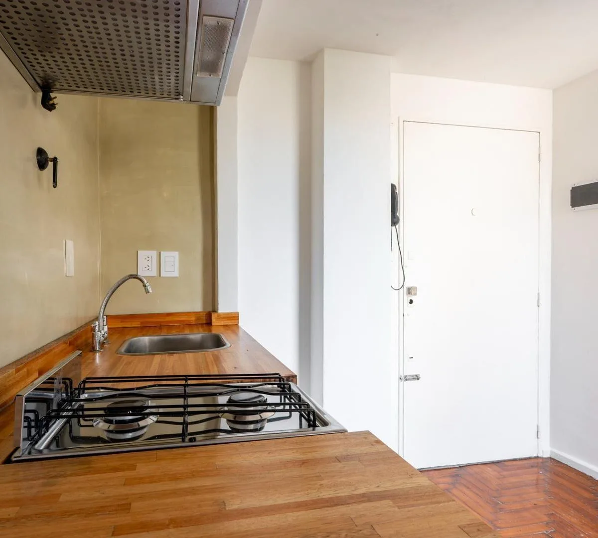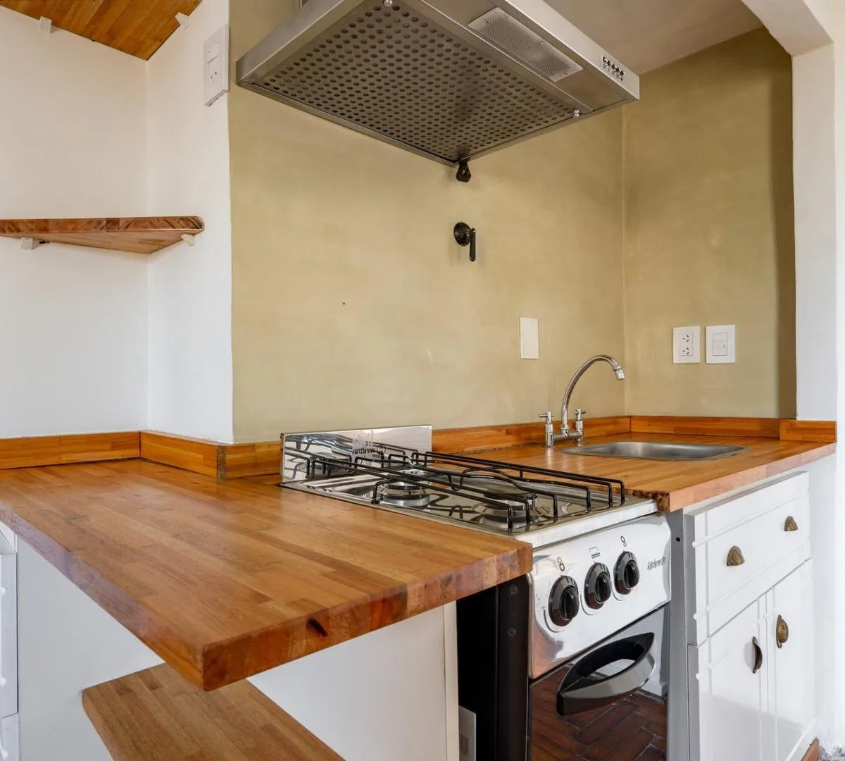 Studio apartment in Monserrat with a terrace balcony, on the 7th floor lateral unit with open views. Living-dining area and bedroom have laminated wood floors. Integrated gas kitchen with extractor hood, electric water heater, and a large storage closet; bathroom has natural ventilation. The unit includes hot/cold air conditioning and cross-ventilation. Building has 2 elevators. Rental terms: quarterly rent adjustment by IPC, accepted rental guarantee is Seguro de Caución only, 1 month security