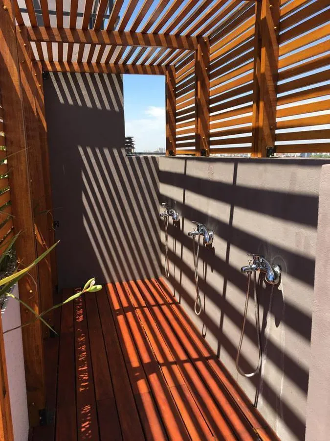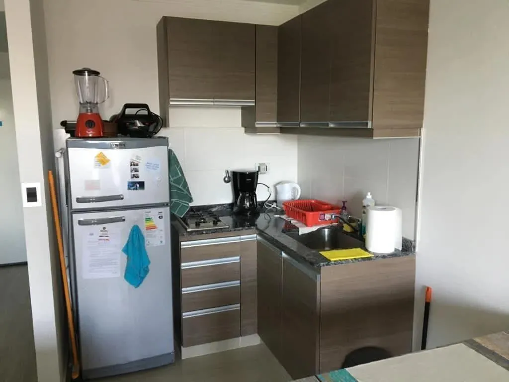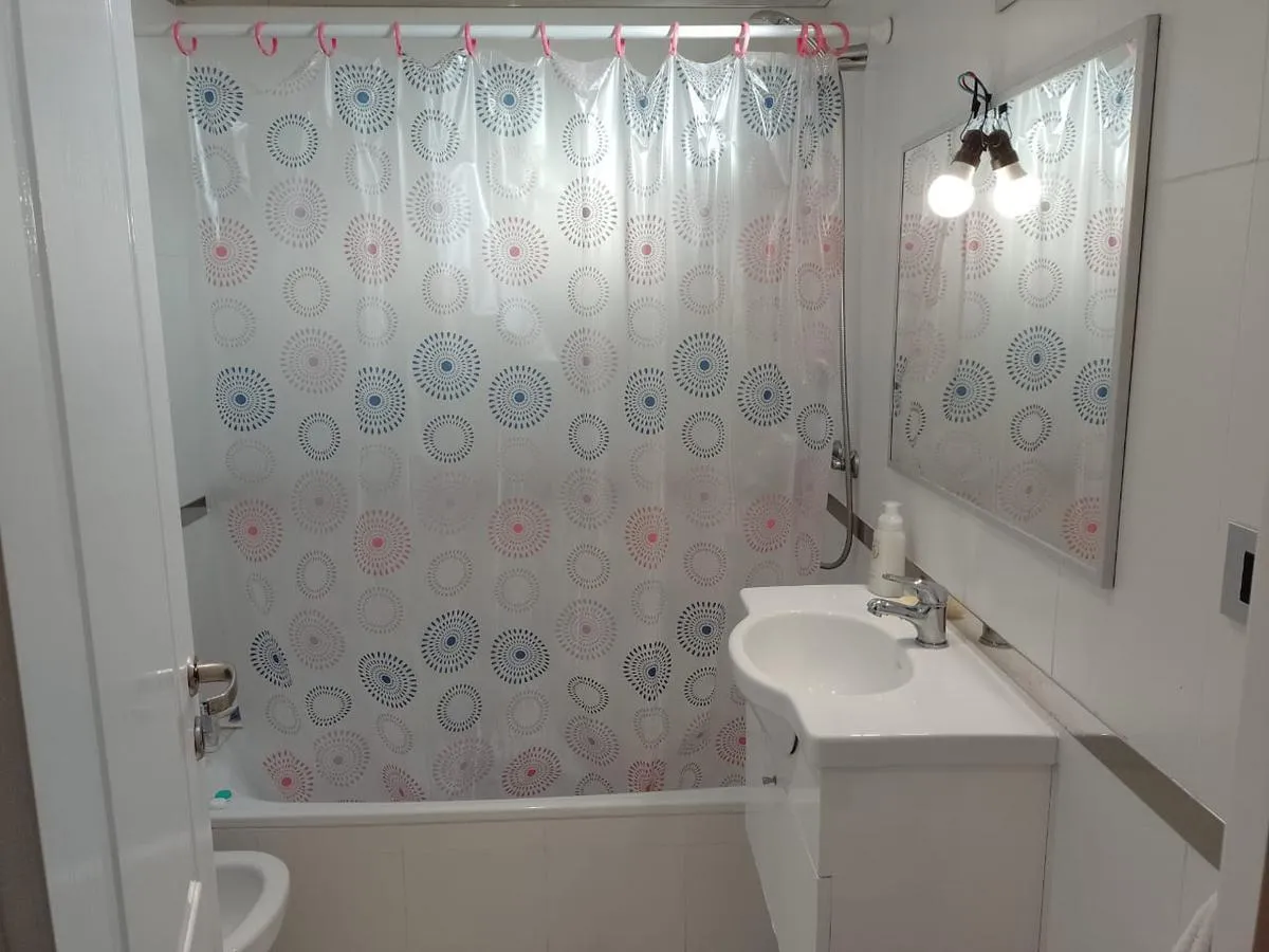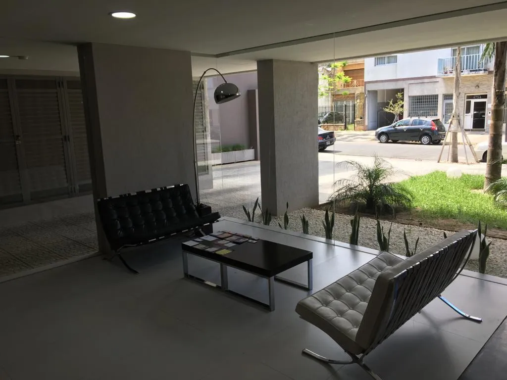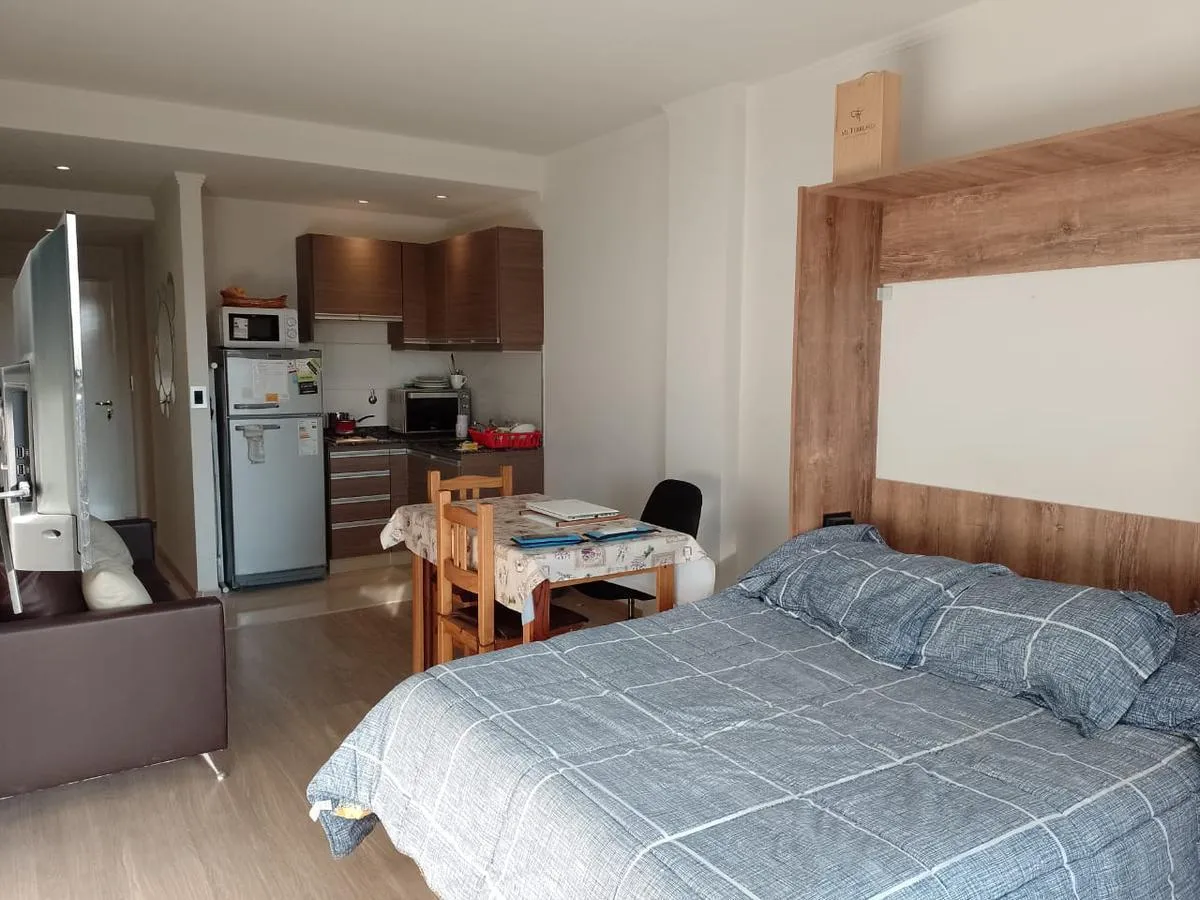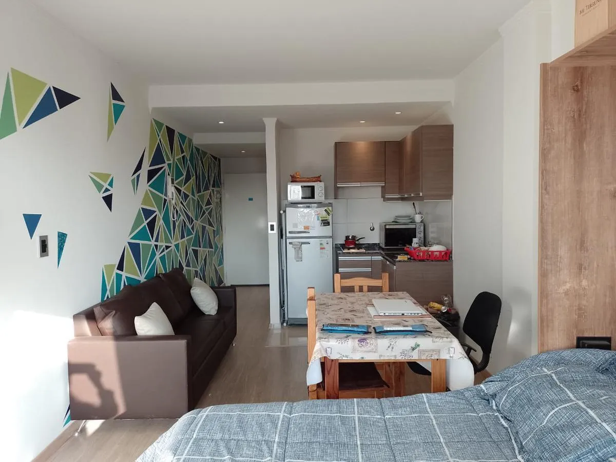 Furnished studio apartment on the 4th floor, street-facing, in the La Jirafa building in Monte Castro. It has a balcony facing the street and an integrated kitchen, with gas and a full bathroom. The building has security, a communal room (SUM), a terrace with showers, a solarium, and a laundry area. Rent is listed excluding building fees and municipal taxes (ABL $13,000 and expensas $50,000).