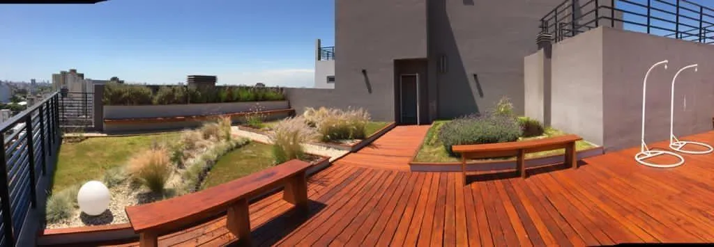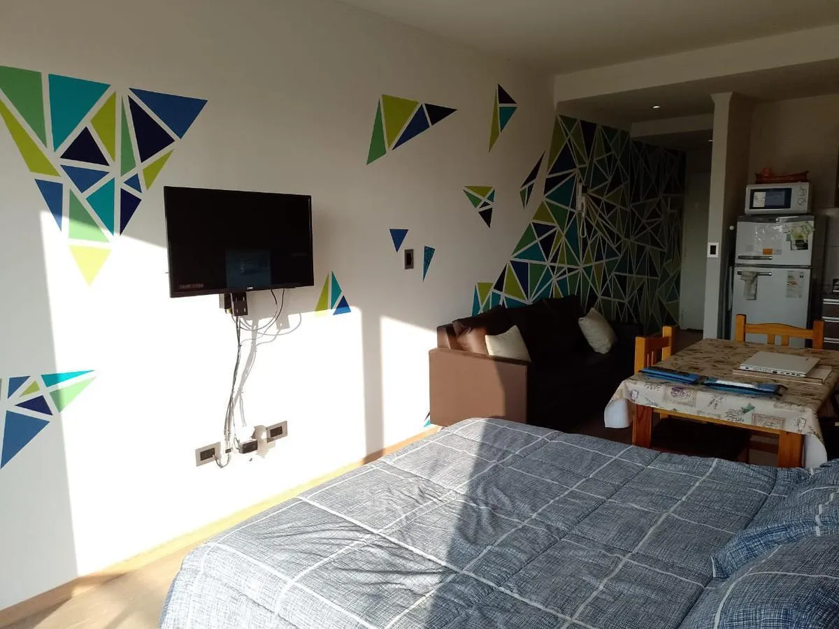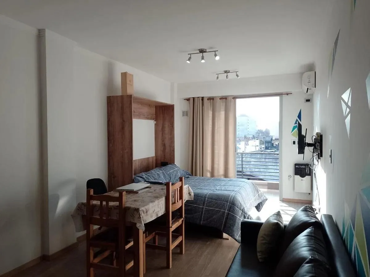 Furnished studio apartment on the 4th floor, street-facing, in the La Jirafa building in Monte Castro. It has a front balcony and an integrated kitchen, gas service, and a full bathroom. The building includes security and communal facilities such as a residents' lounge (SUM), terrace with showers, solarium, and a laundry area. The rent is listed as move-in ready; it does not include ABL ($13,000) or building fees ($50,000). Rental contracts can be for 1 or 2 years, with adjustments every 3 month