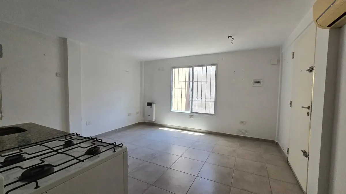 Loft-style studio apartment for rent in Castelar Norte, 15 m² total and 15 m² covered, on the third floor accessed by stairs. It includes a kitchenette, a full bathroom, and hot water from a termotank. The unit has air conditioning and a stove; the building has running water, sewer services, gas, electricity and paved access. Lease is for 24 months with quarterly updates based on ICL, for a maximum of 2 people.