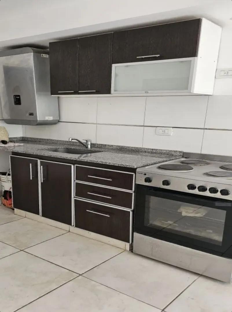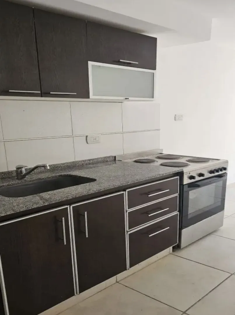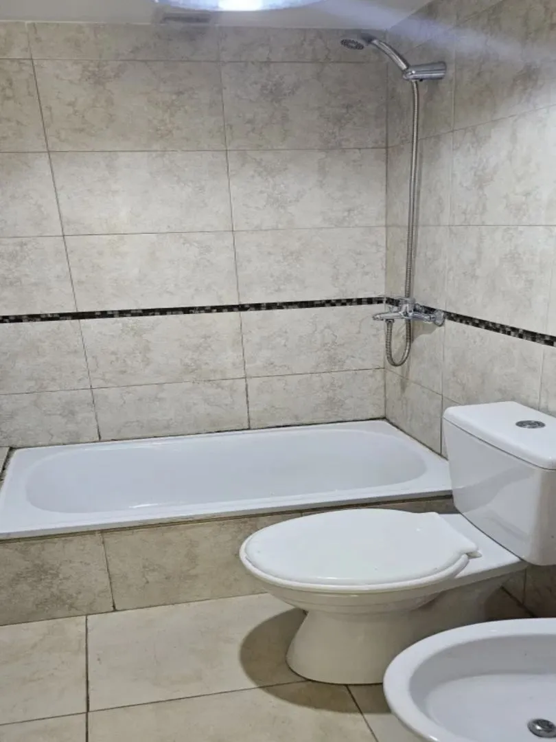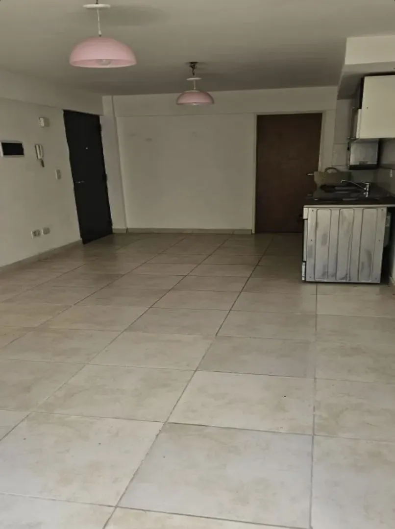 Studio apartment for rent in Morón. Located on Sucre at 300, near the commercial centre, 600 metres from Plaza San Martín, 800 metres from the station and 300 metres from COTO. Integrated equipped kitchen with base cabinets, wall cabinets, an electric cooking appliance, and a connection for a washing machine; full bathroom with vanity and bathtub. Front-facing balcony. Monthly rent is $430.000; building fees are $45.000. Two-year contract with quarterly increases. Requirements include income pro