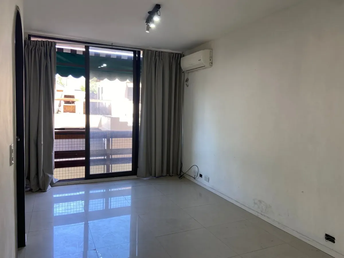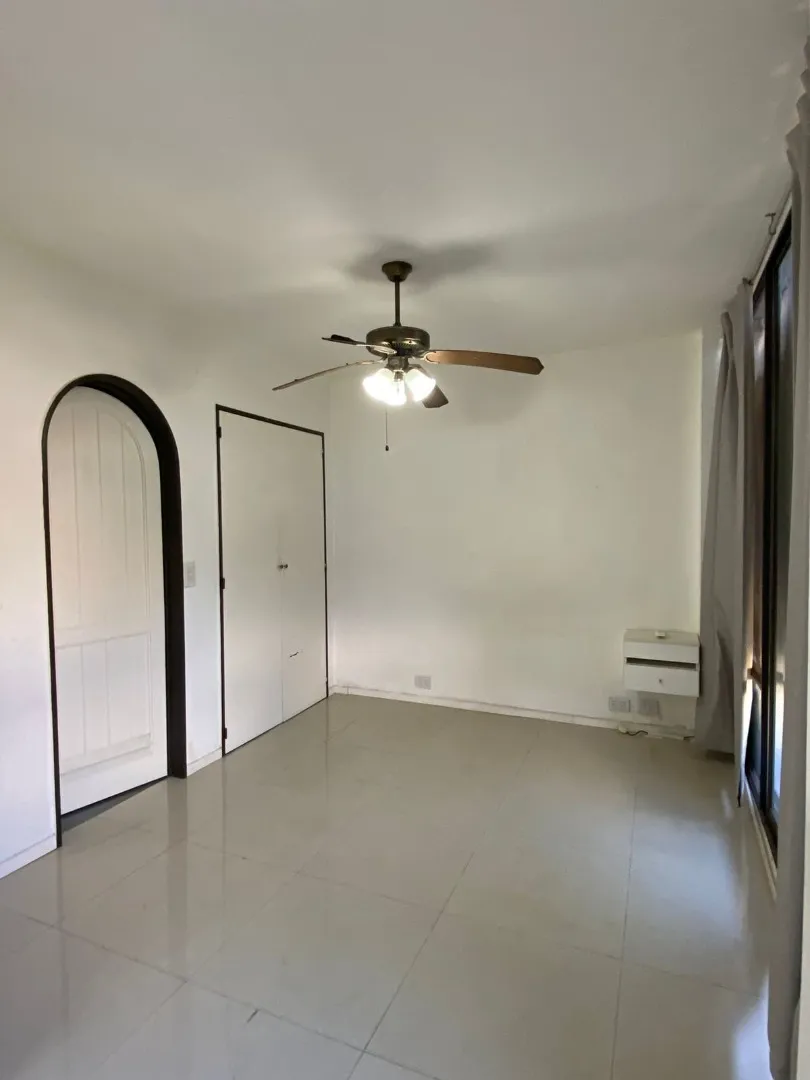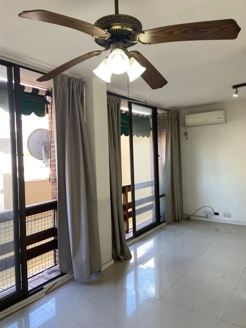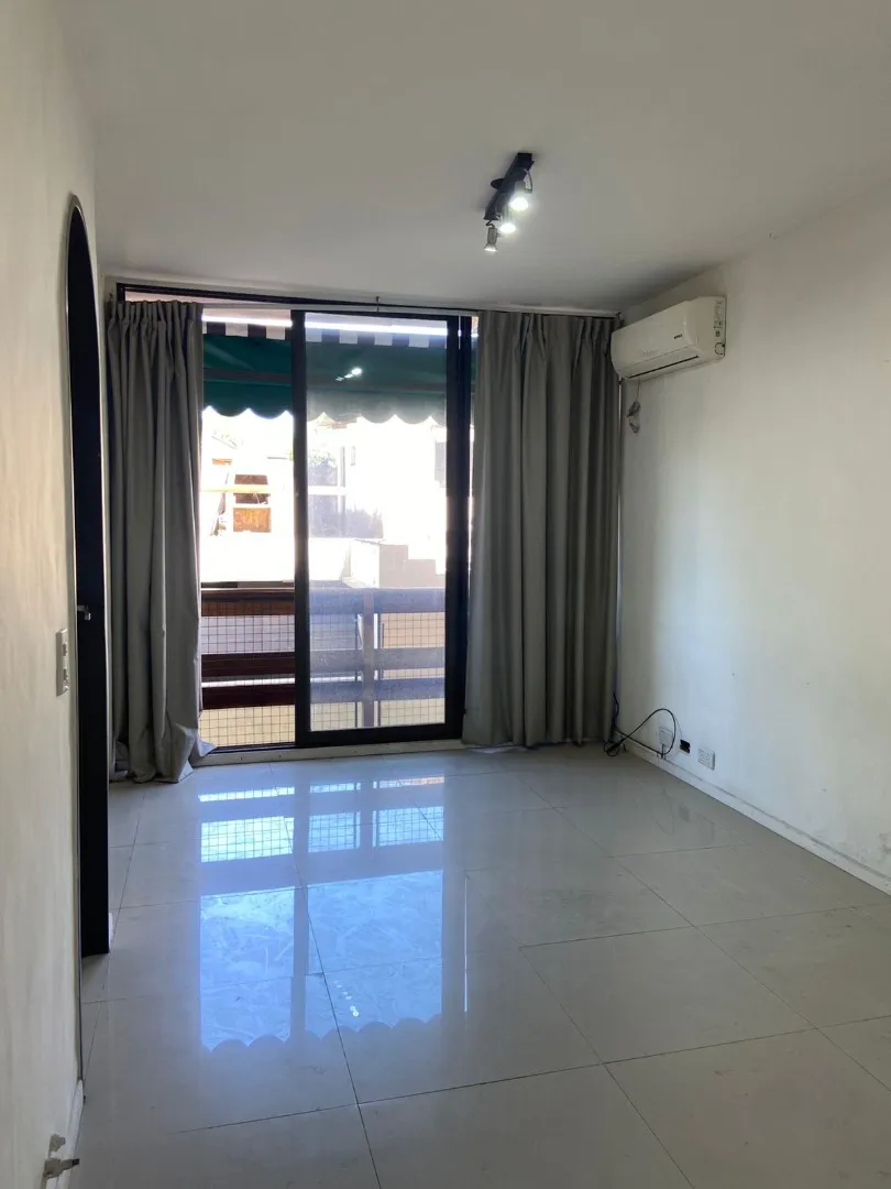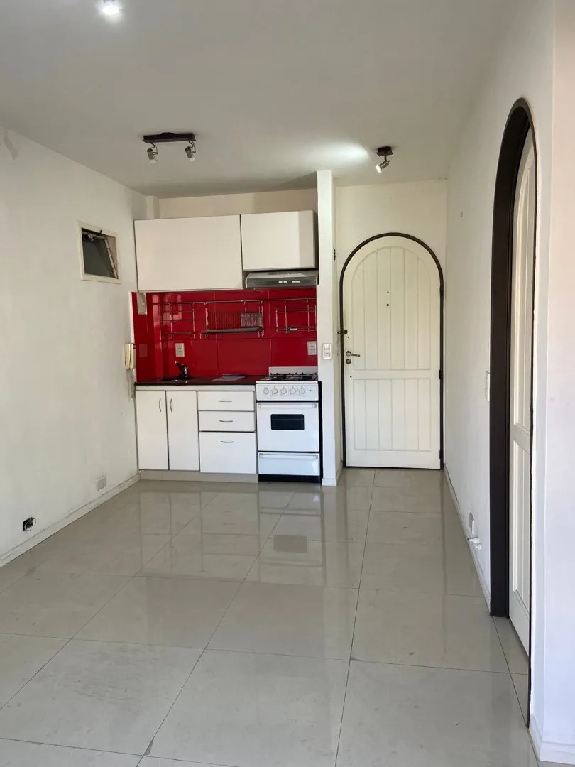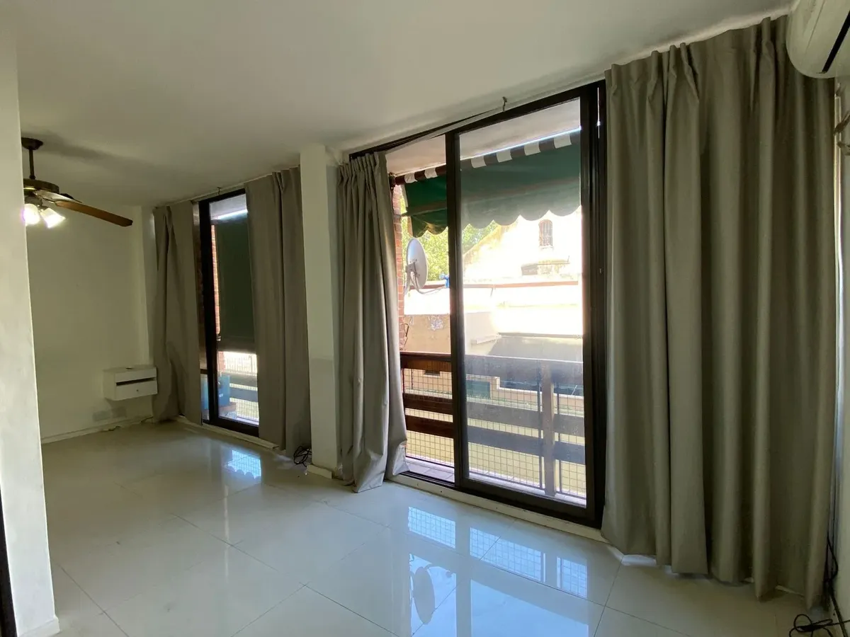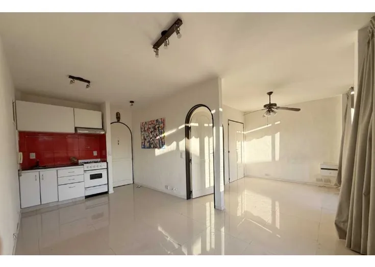 Studio apartment with a large living-dining and kitchen area, with a French-style window to a balcony. The layout allows the space to be divided to create a separate bedroom area with its own French-style window and balcony door. Gas natural cooking. The bedroom area includes a built-in wardrobe with full interior fittings; the bathroom is described as modern and has a laundry area.