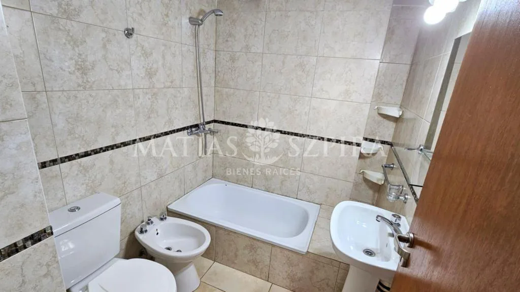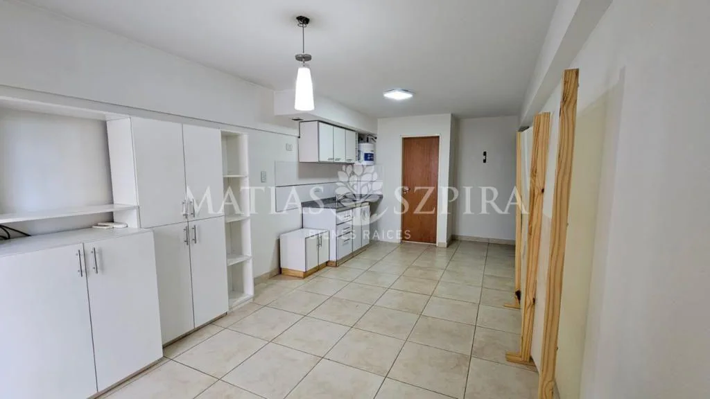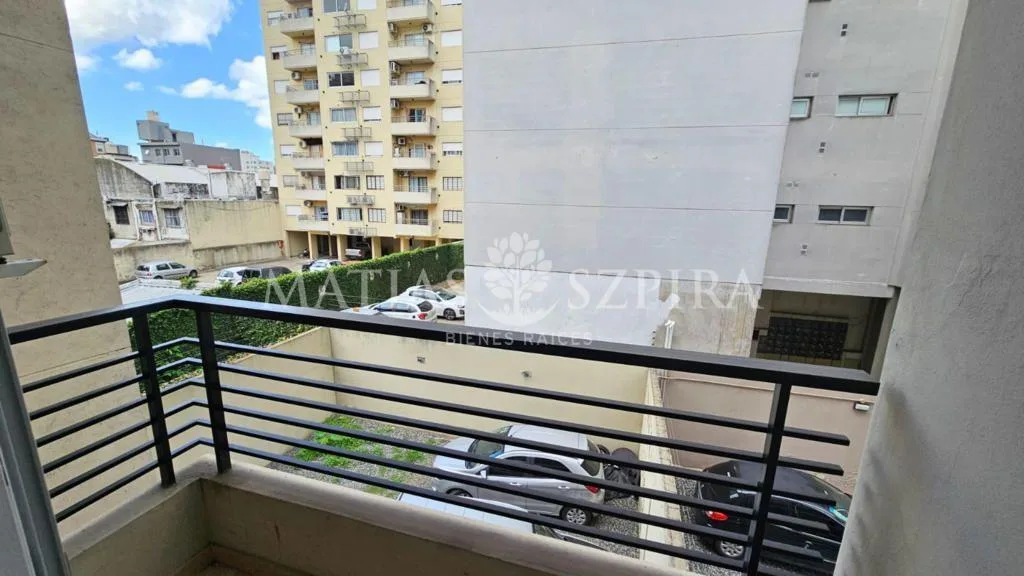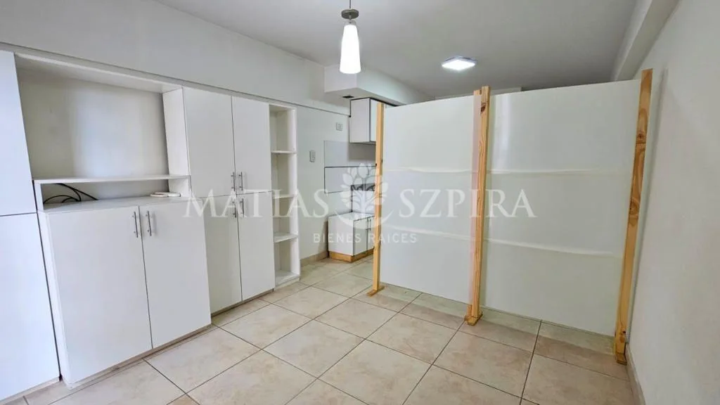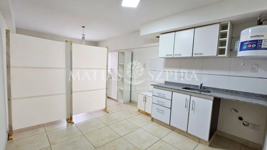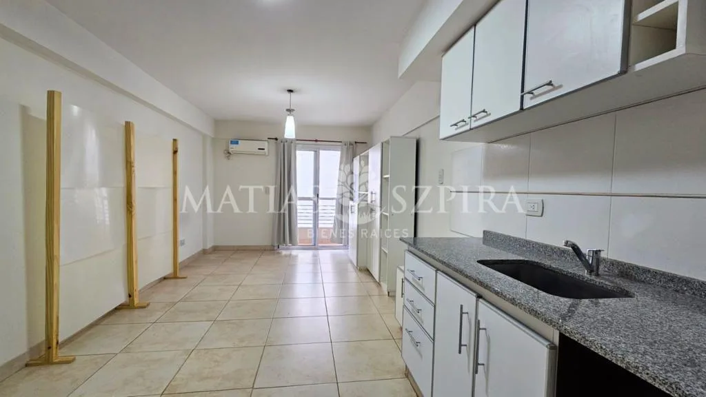 Studio apartment in Morón with a total area of 24 m². Living-dining area integrated with an equipped kitchen with marble countertop, overhead and base cabinetry, electric oven with cooktop, water heater, and space for a washing machine. Full bathroom, built-in compartmentalised wardrobe, balcony, air conditioning and blackout curtains; the sleeping area can be separated with a movable partition. Building has perimeter cameras and cameras in common areas on each floor, and a stainless-steel eleva