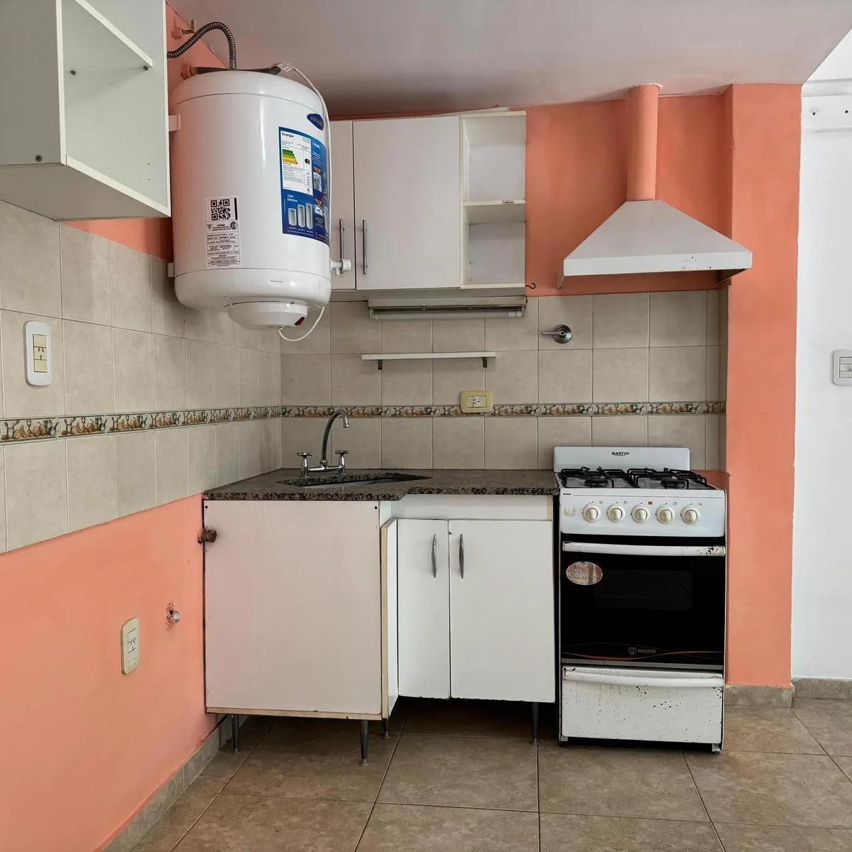 Studio apartment on the front street-facing ground floor, accessed via stairs. It has an open living area with a kitchenette including lower cabinets, overhead cabinets and a stove, plus a balcony and a bathroom with a shower. Located in Morón Norte near the train station and Universidad de Morón.