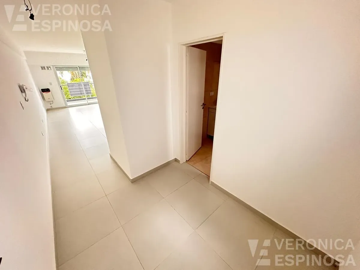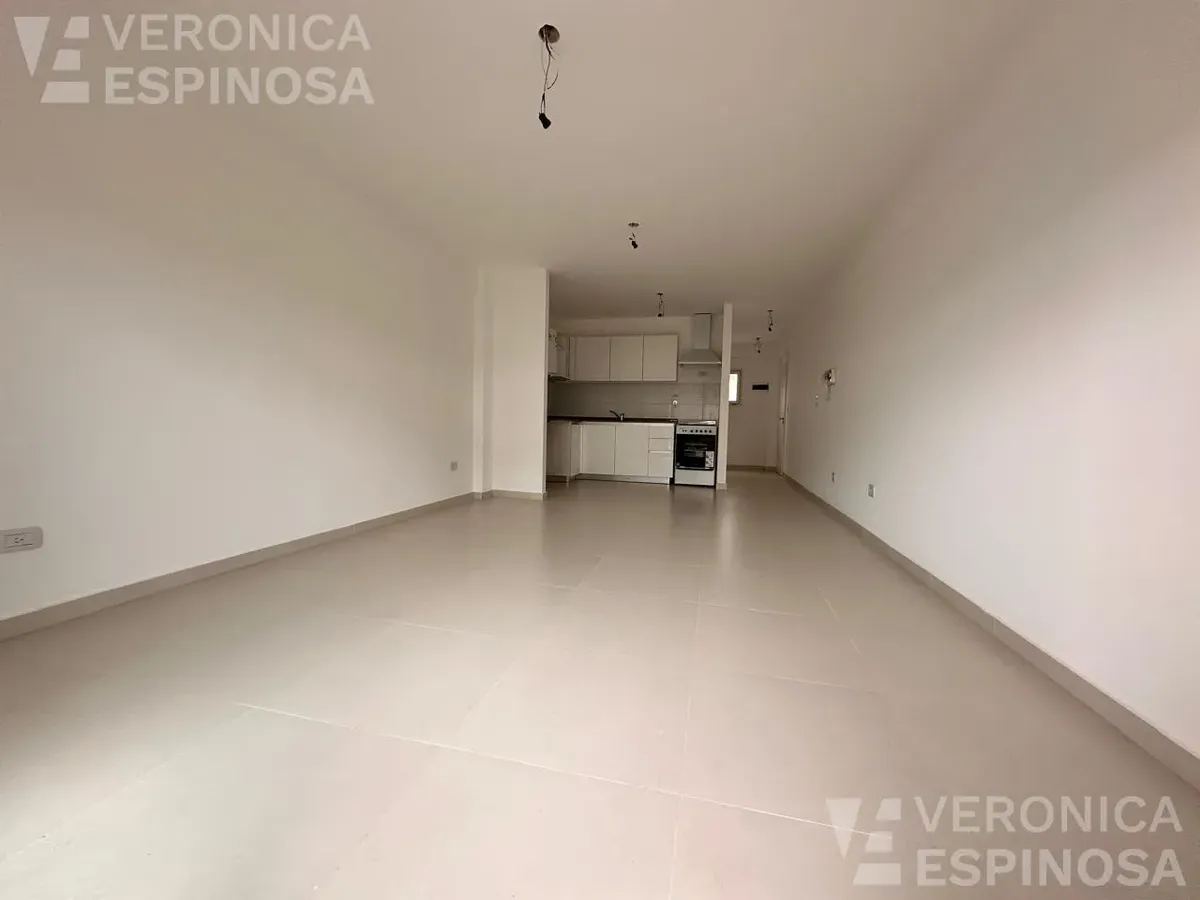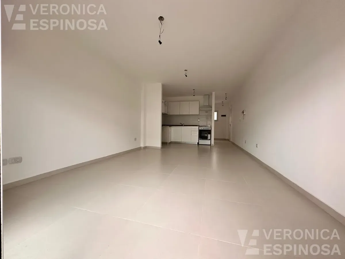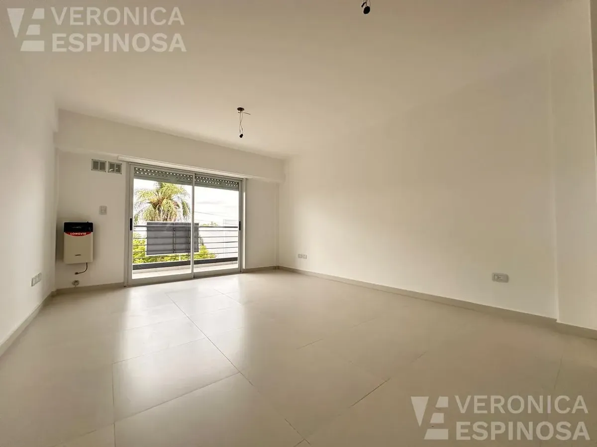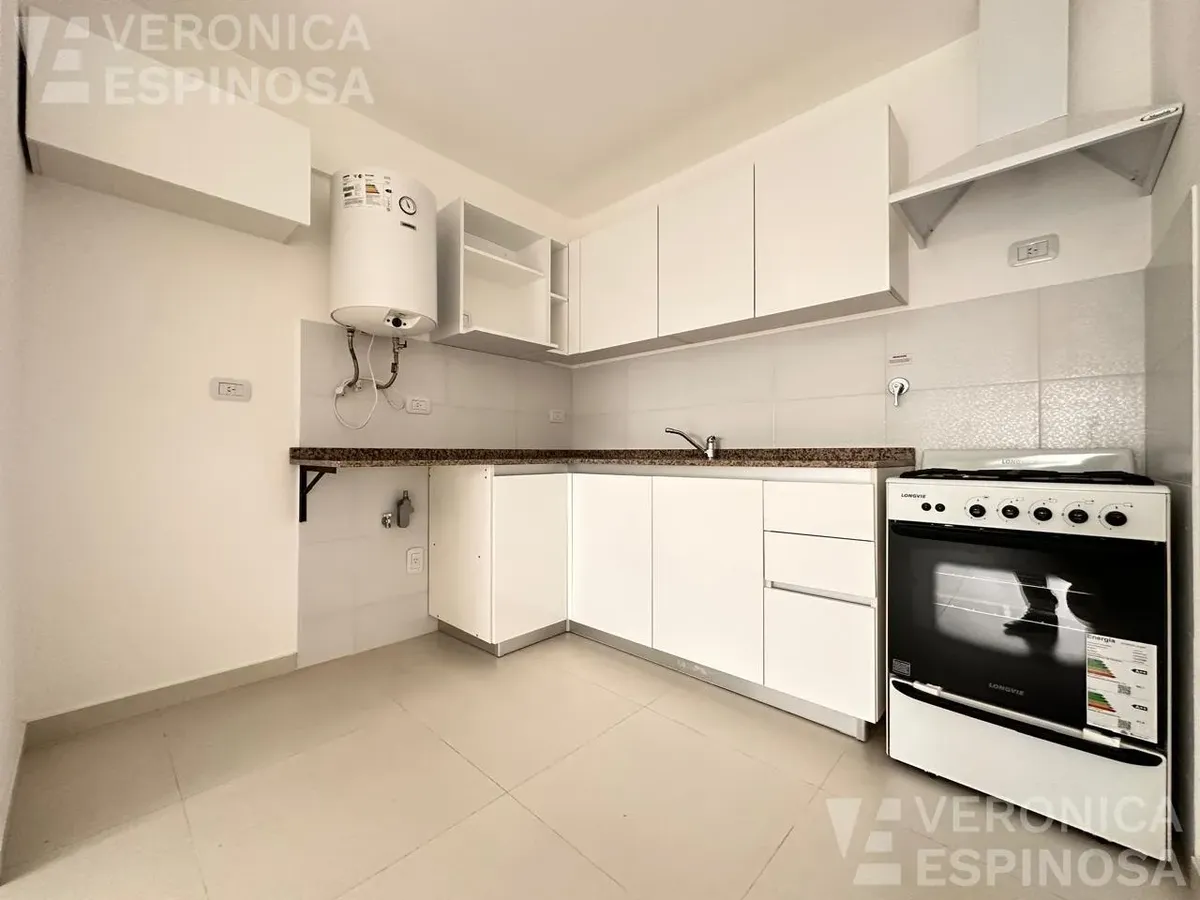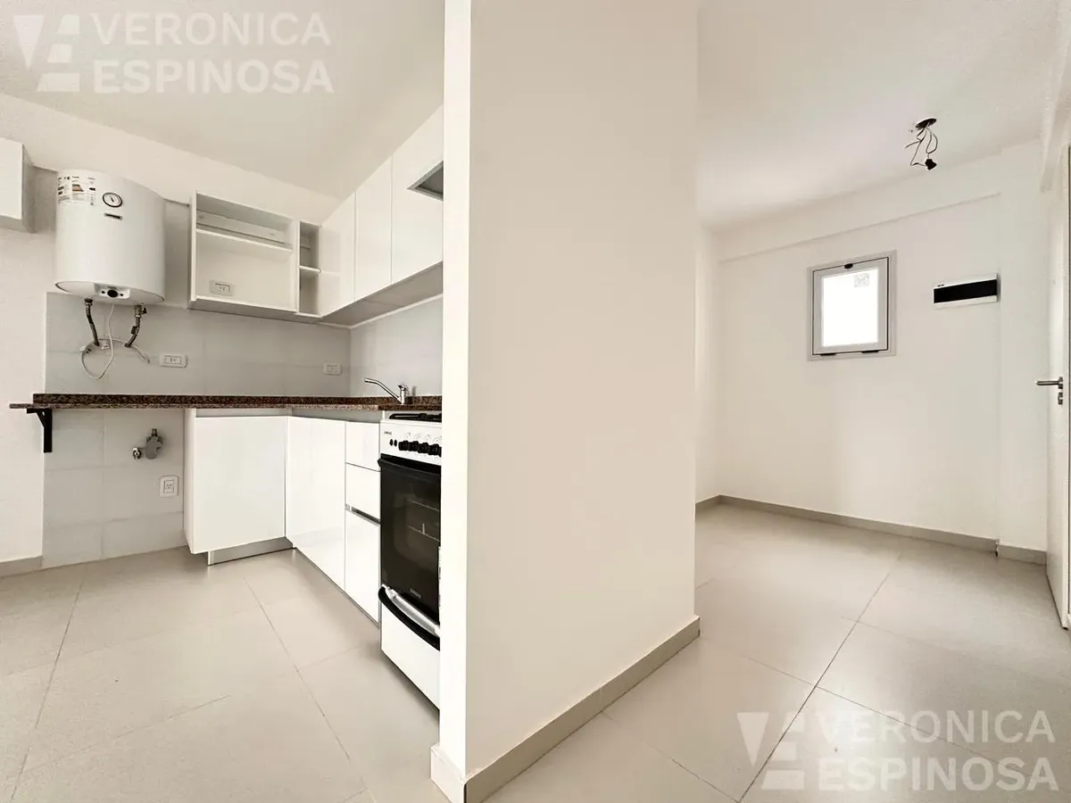 One-room apartment in Morón with an integrated kitchen, built-in base cabinets and overhead storage, a living area with access to a balcony, and a full bathroom with a bathtub. The kitchen includes a Longvie four-burner unit with oven and window/visor glass and lighting. Heating is via a balanced-flue heater, with pre-installation for air-conditioning pipework. Double-glazed windows and sliding door windows (DVH) are installed. An (assigned) parking space is included. No pets are accepted; renta